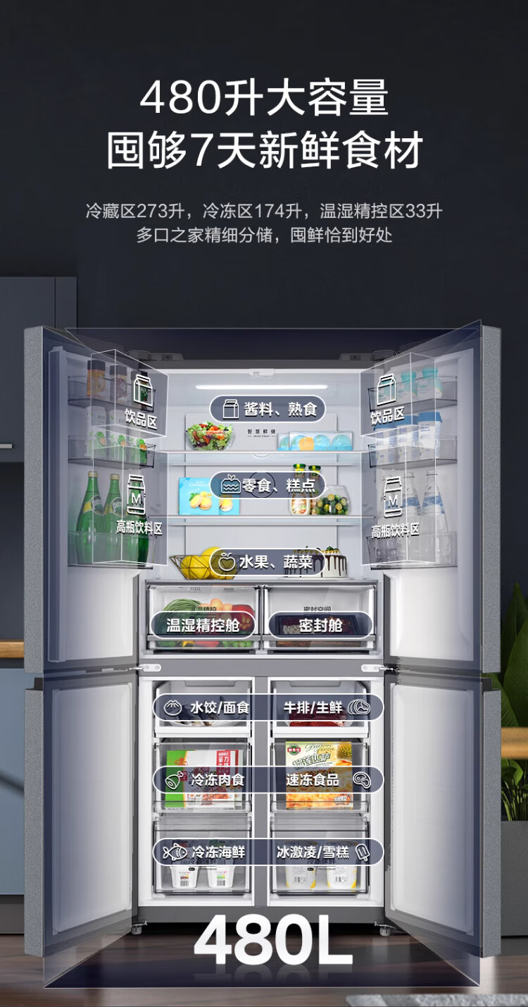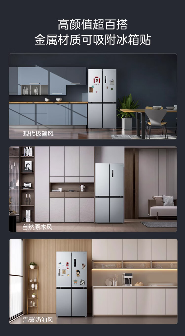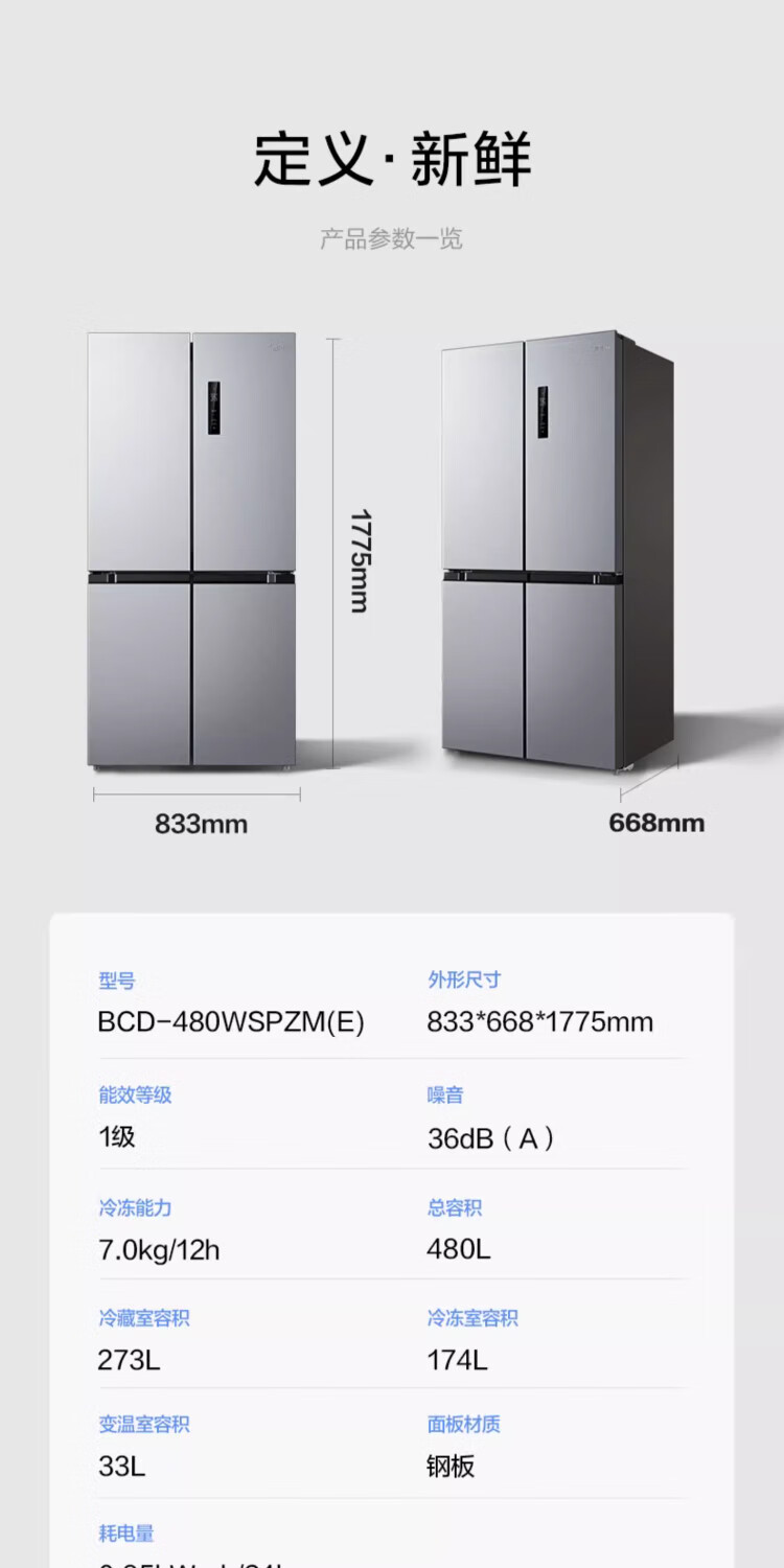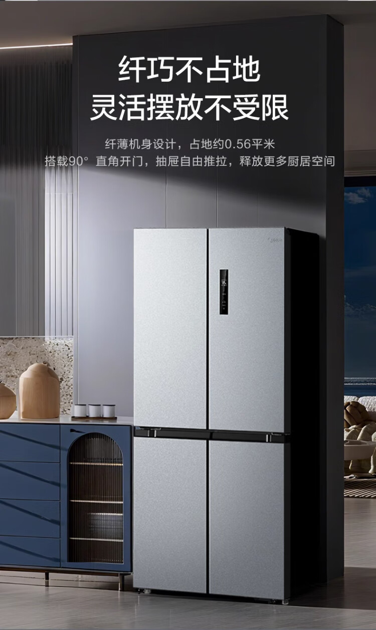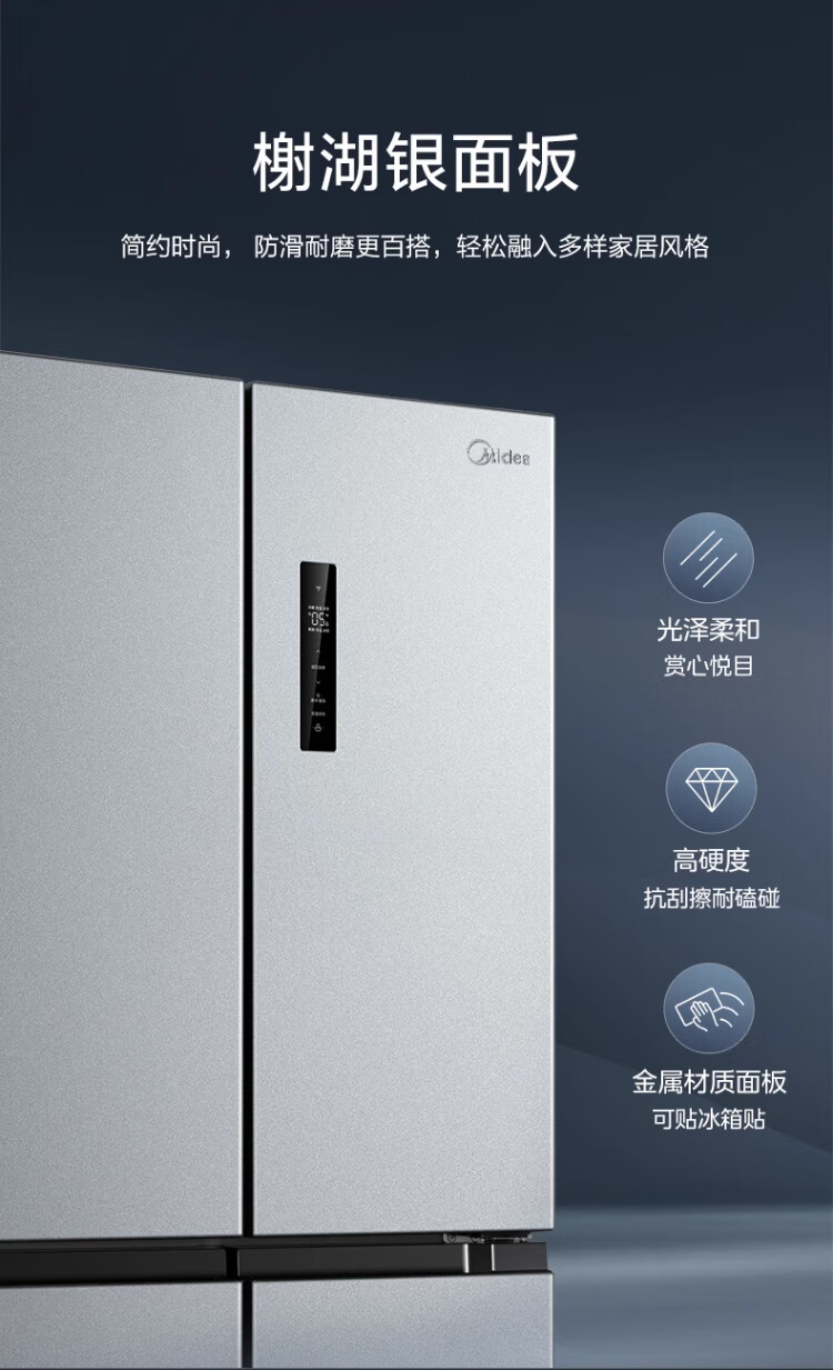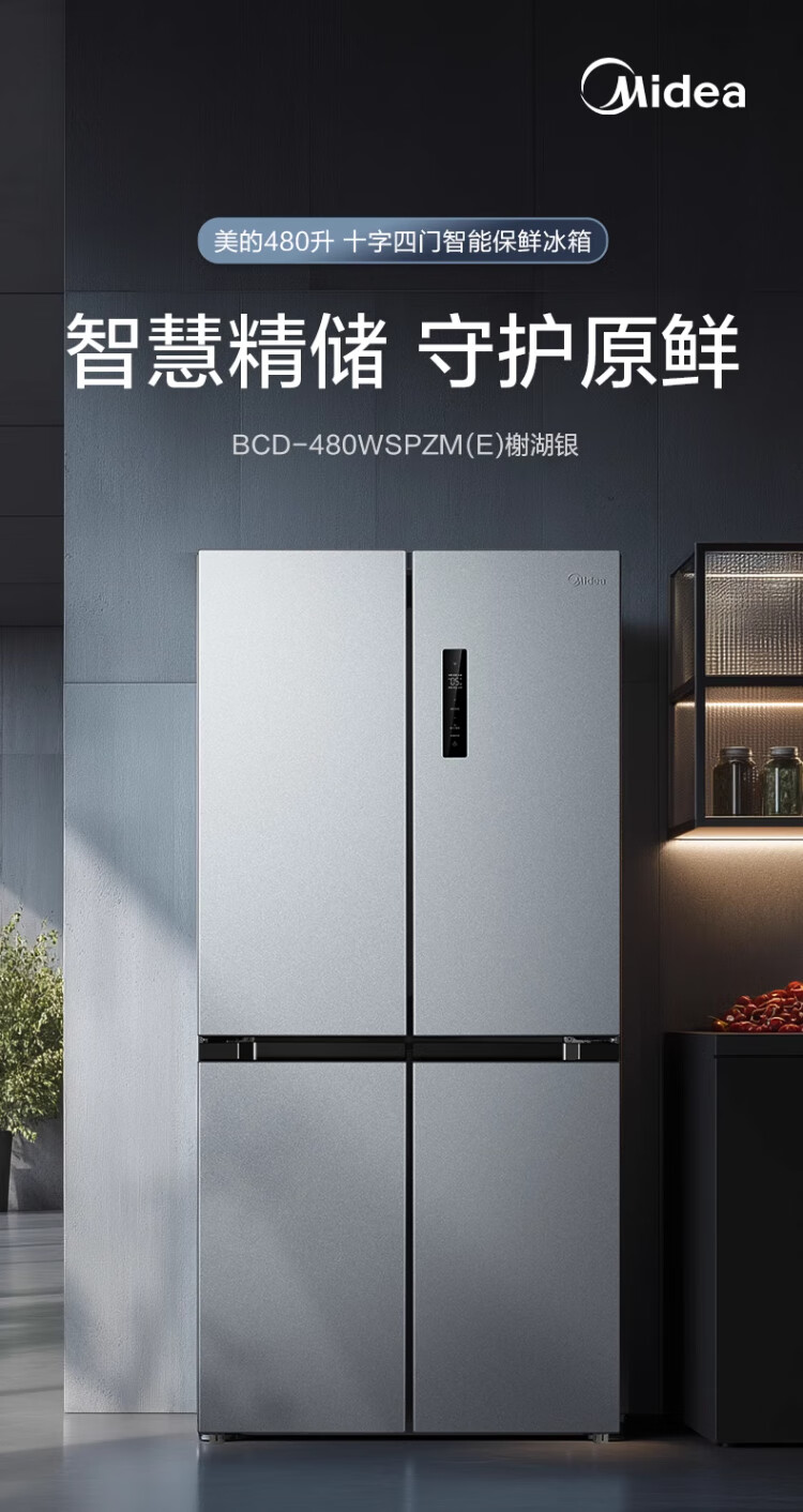 Midea 480-liter cross-door refrigerator, first-level energy-efficiency home smart variable frequency air-cooled, frost-free, large-capacity four-door energy-saving home appliance BCD-480WSPZM(E)