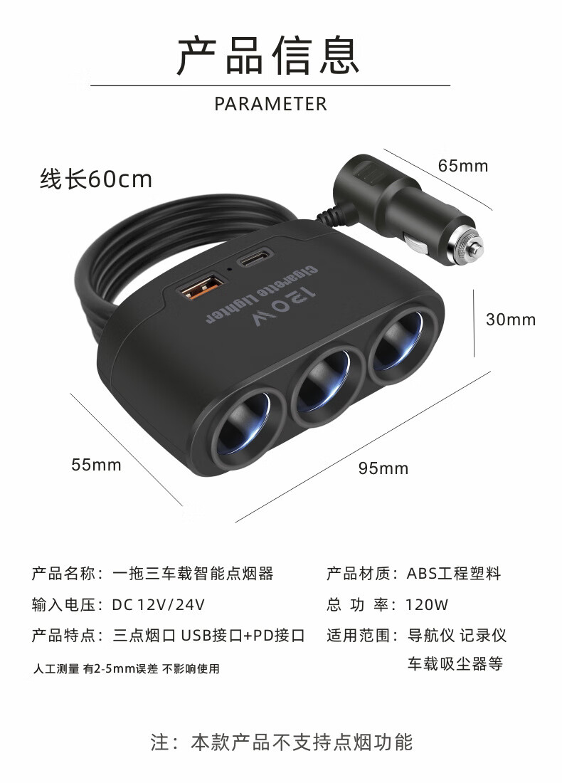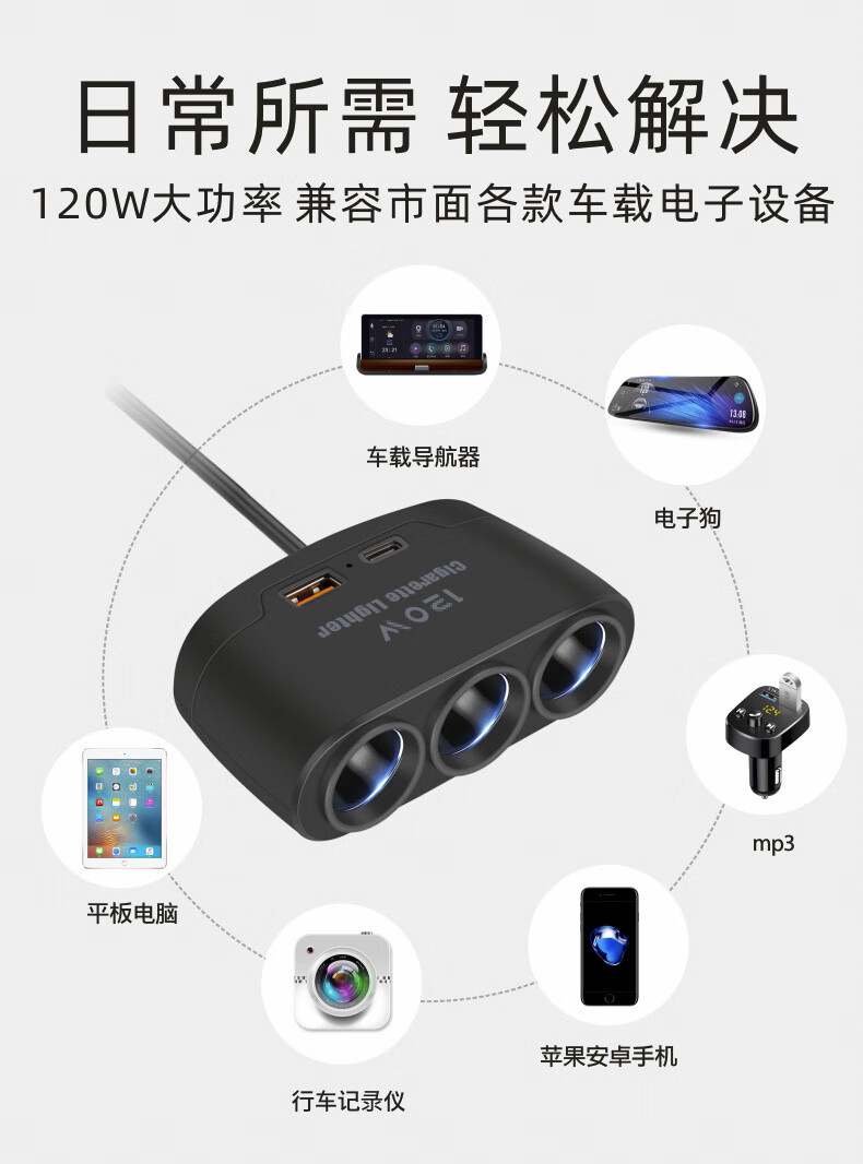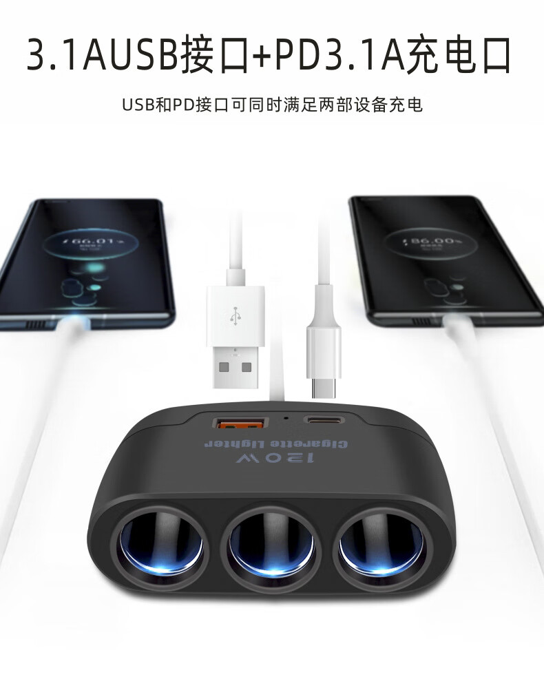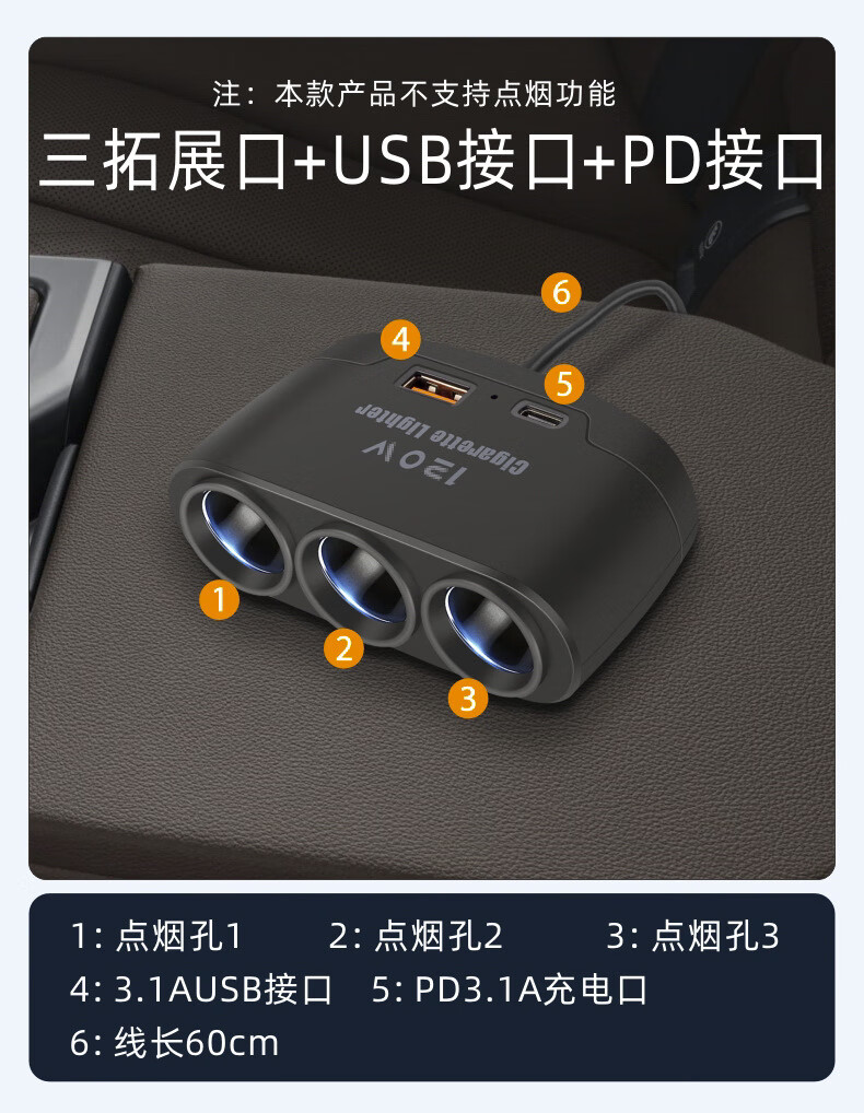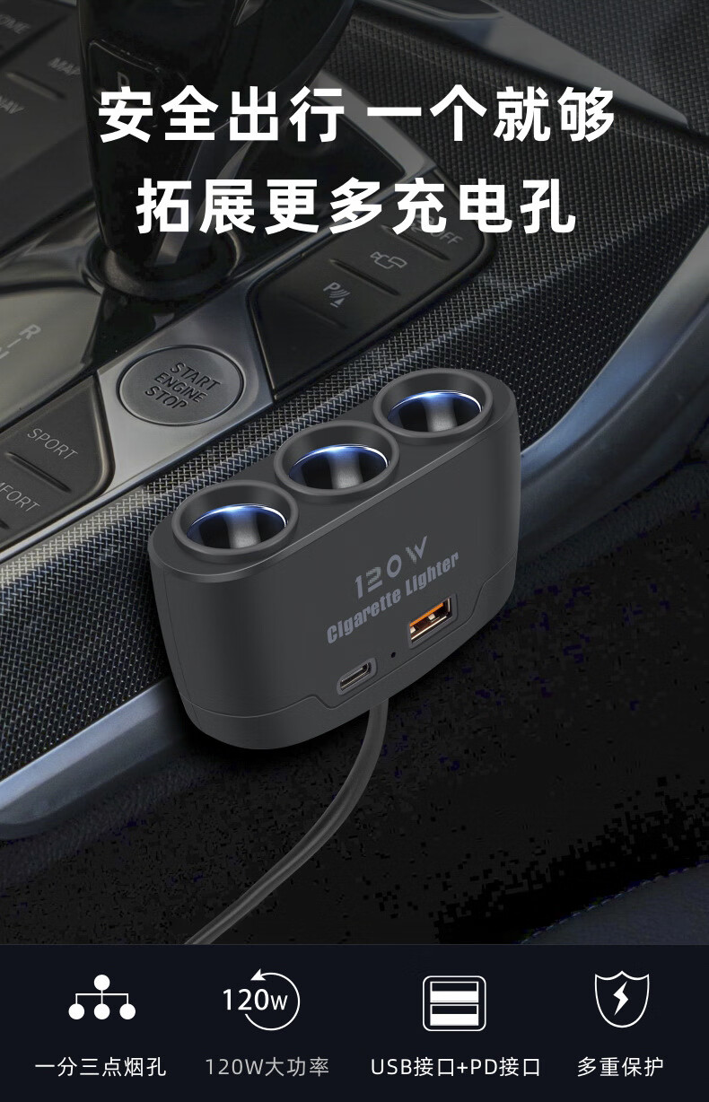 Multifunctional car charger Car charger cigarette lighter One to three with USB+PD fast charging interface 12V24V universal One to three cigarette lighter USB+PD interface
