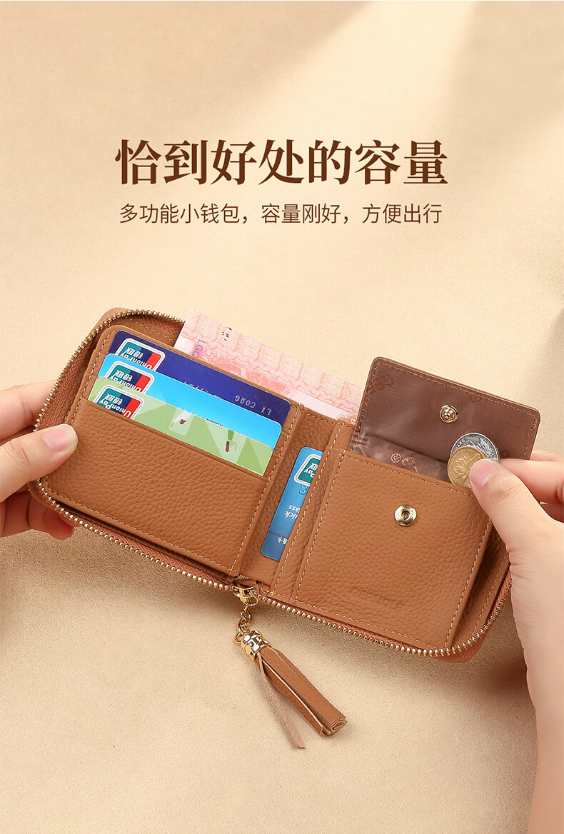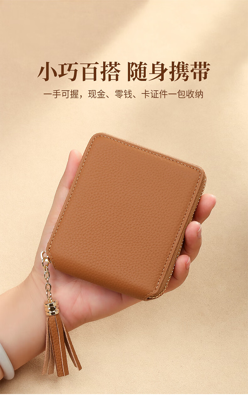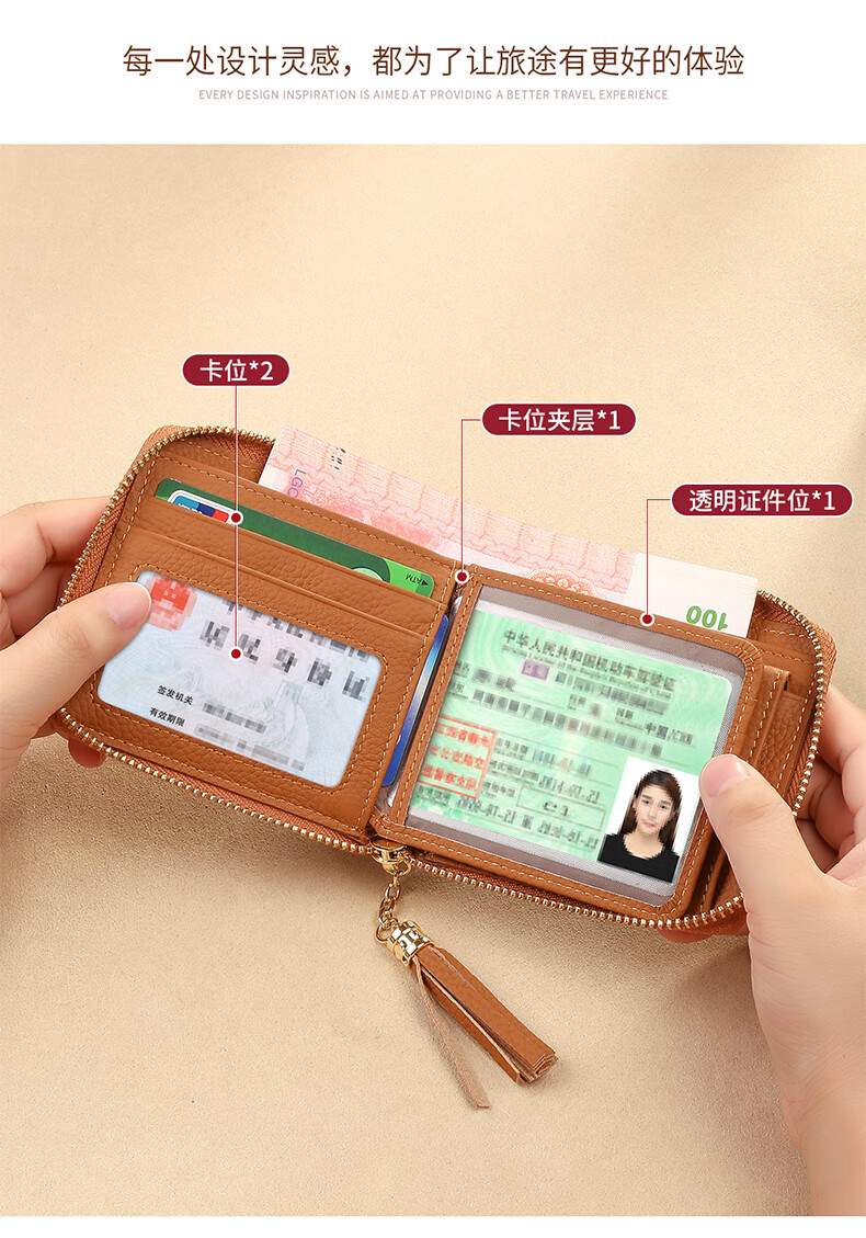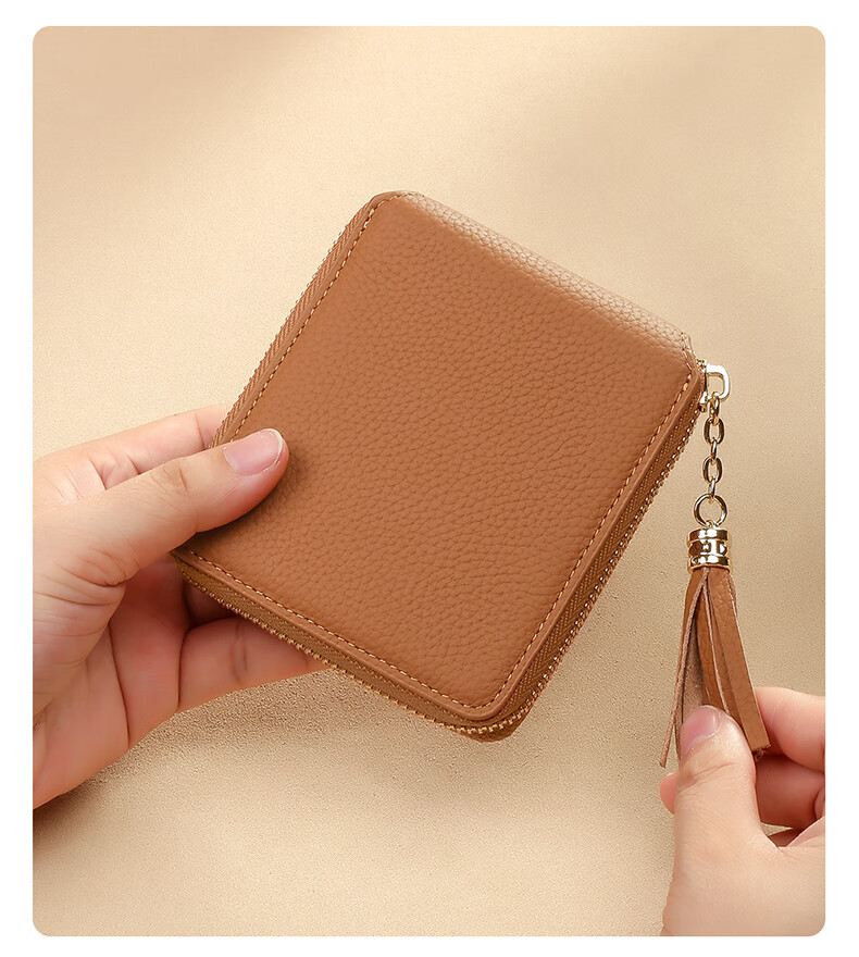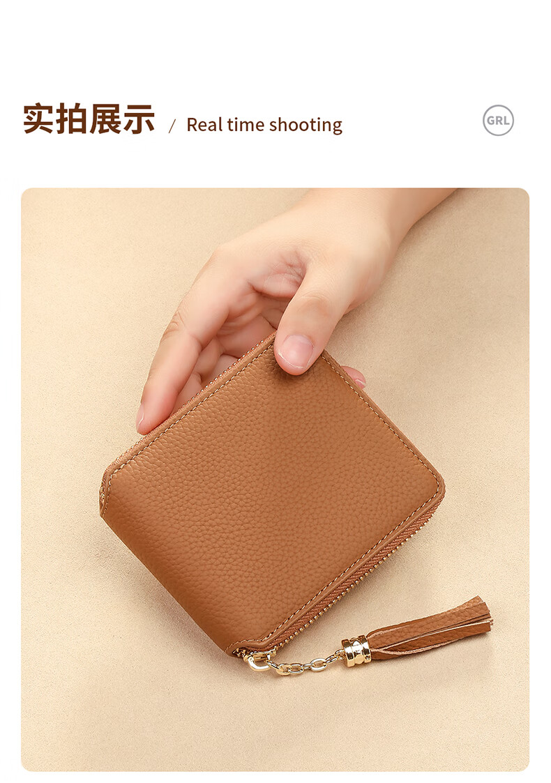 Gorola genuine leather wallet for women 2025 new fashion simple versatile coin purse card holder integrated zipper tassel driver's license Mocha brown - first layer cowhide anti-theft brush