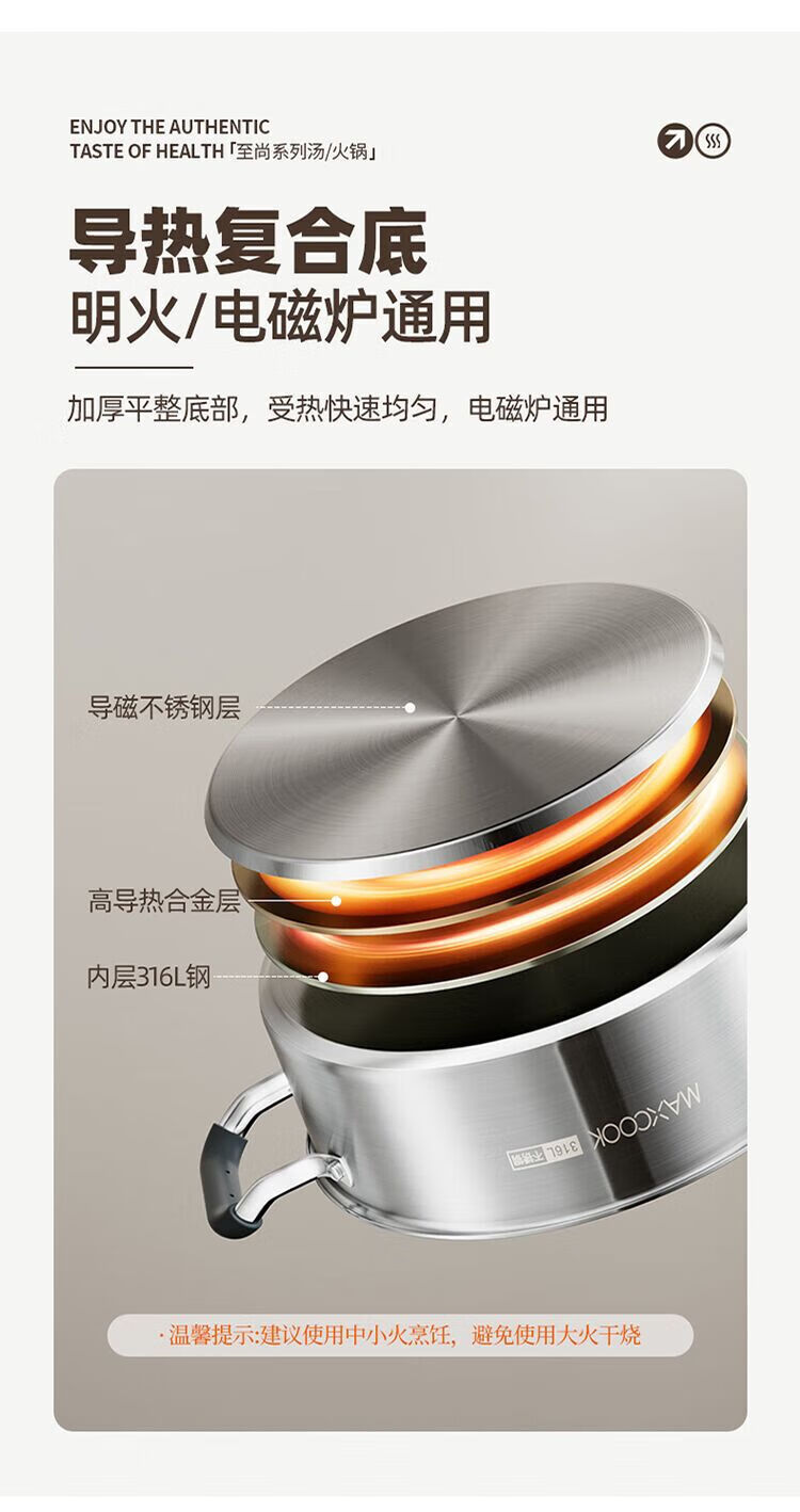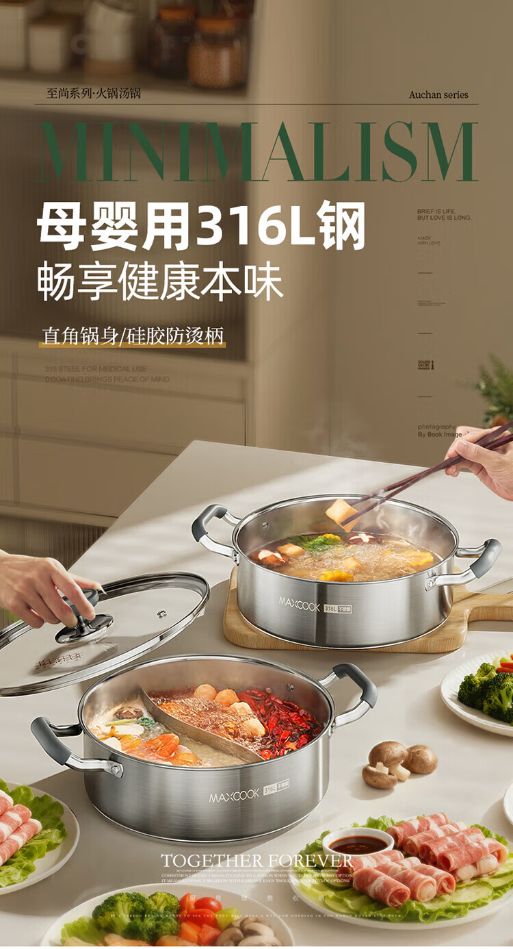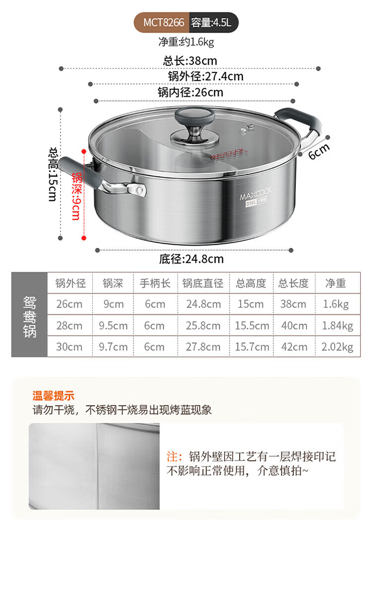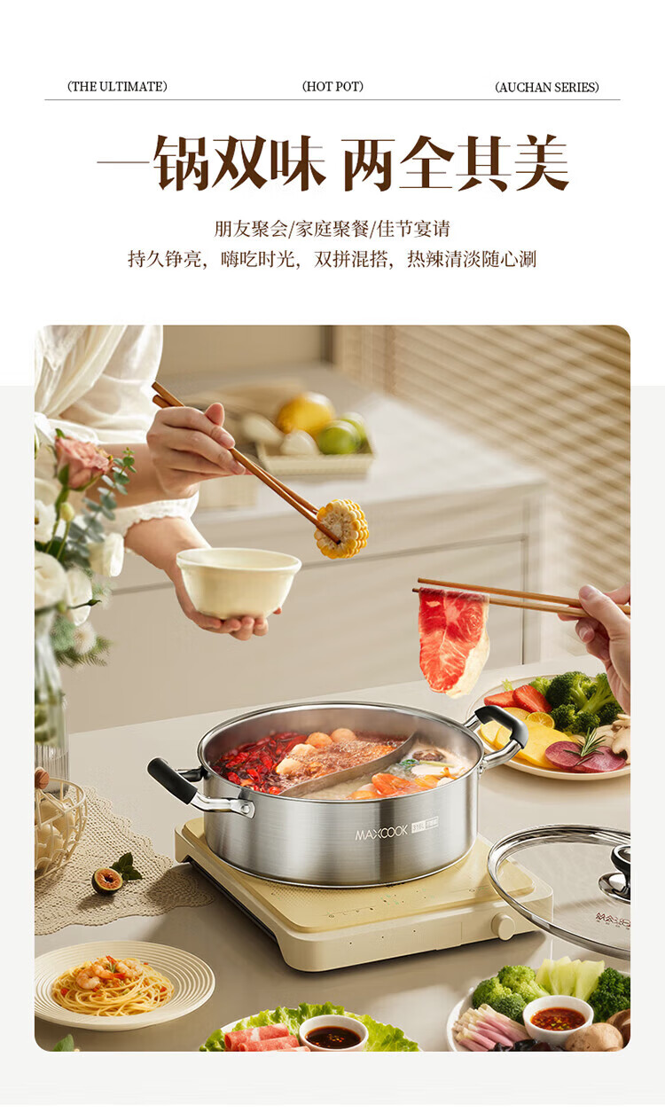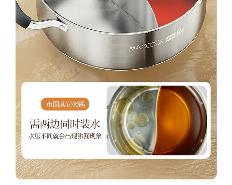 MAXCOOK 316L stainless steel mandarin duck pot, hot pot, soup pot, shabu-shabu pot, cooking pot, induction cooker, gas stove, hot pot pot, hot pot, 316 stainless steel 26cm