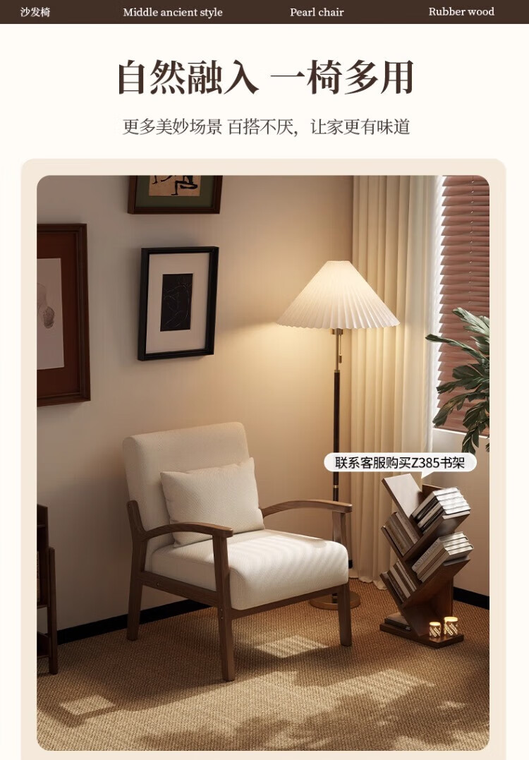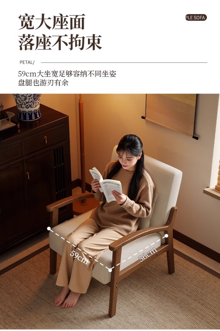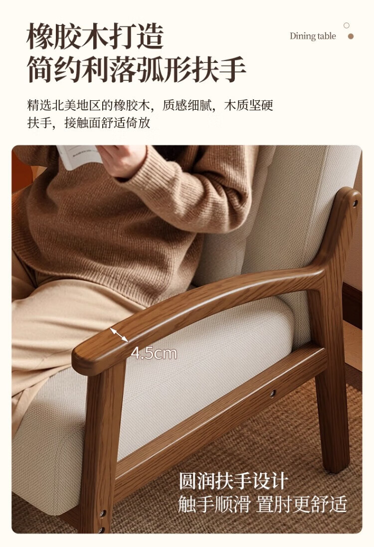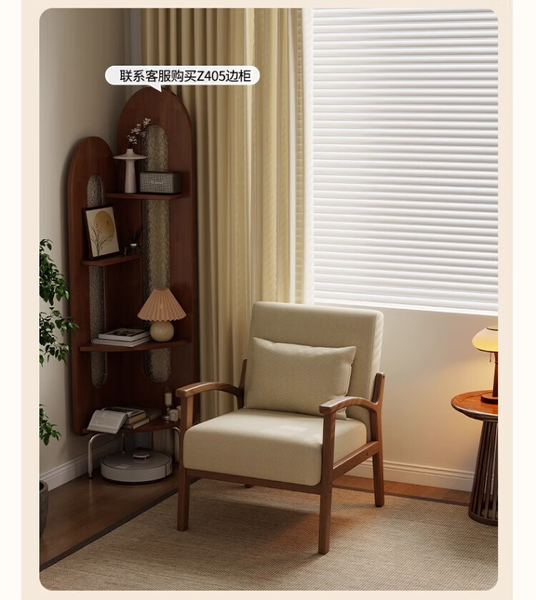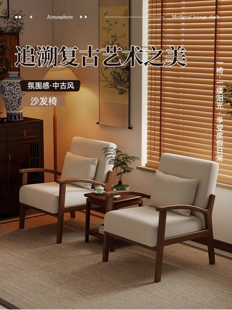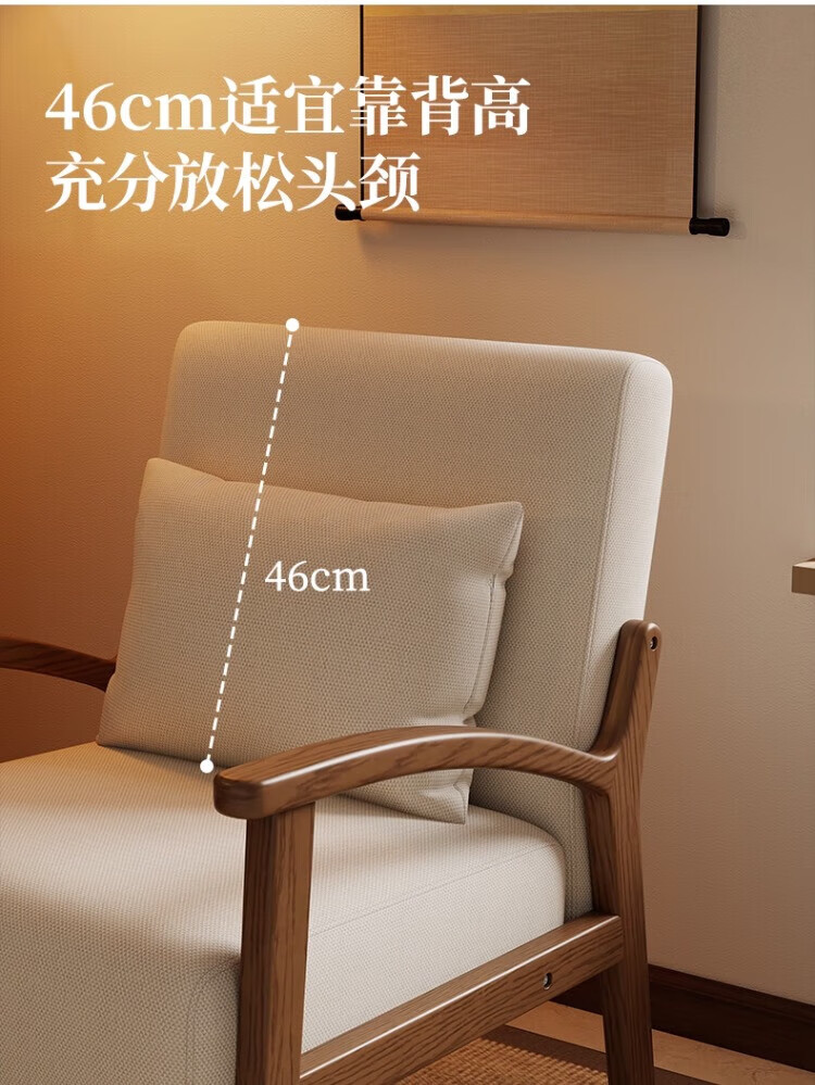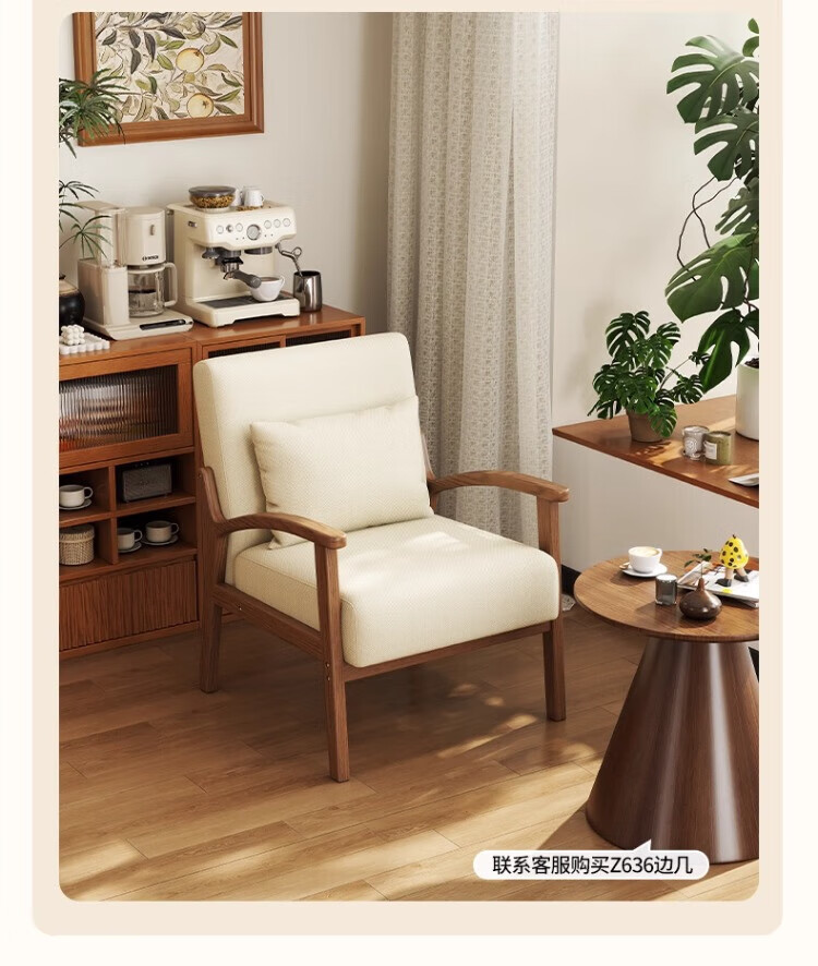Solid wood single chair retro style single sofa living room leisure sofa chair balcony study backrest sofa seat off-white cotton and linen