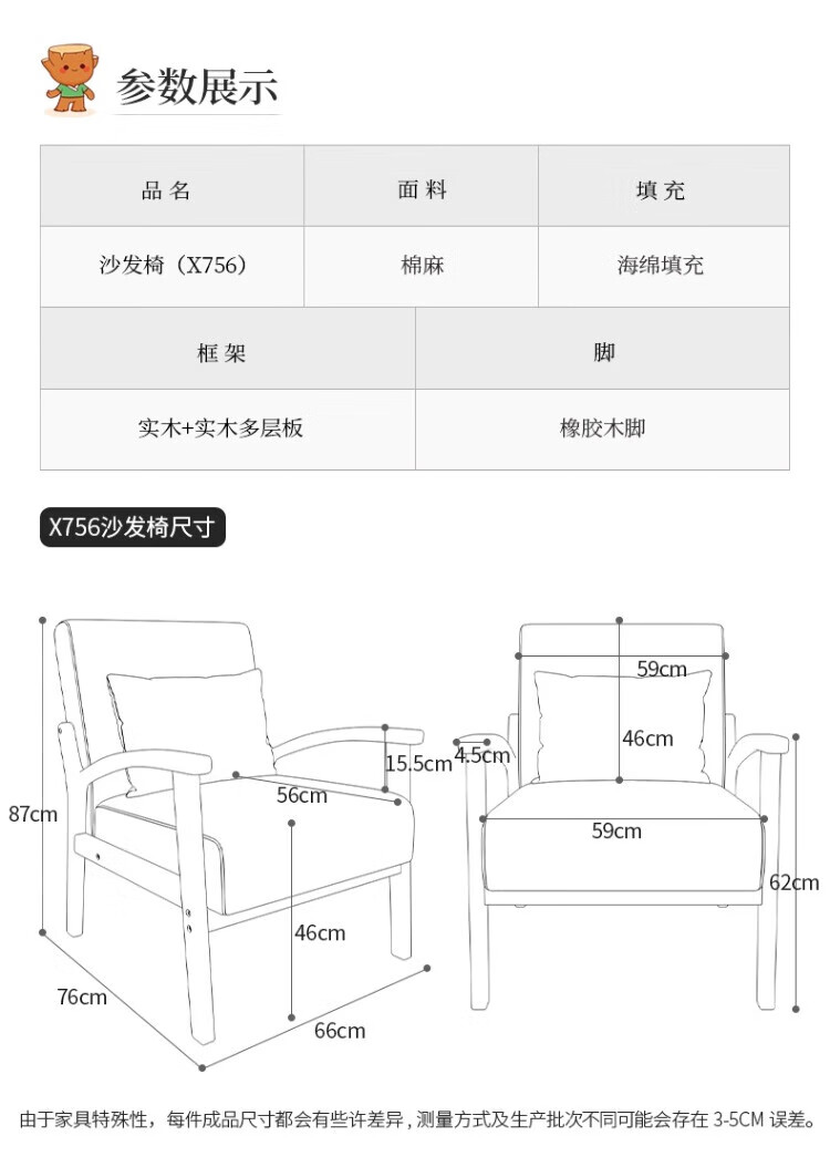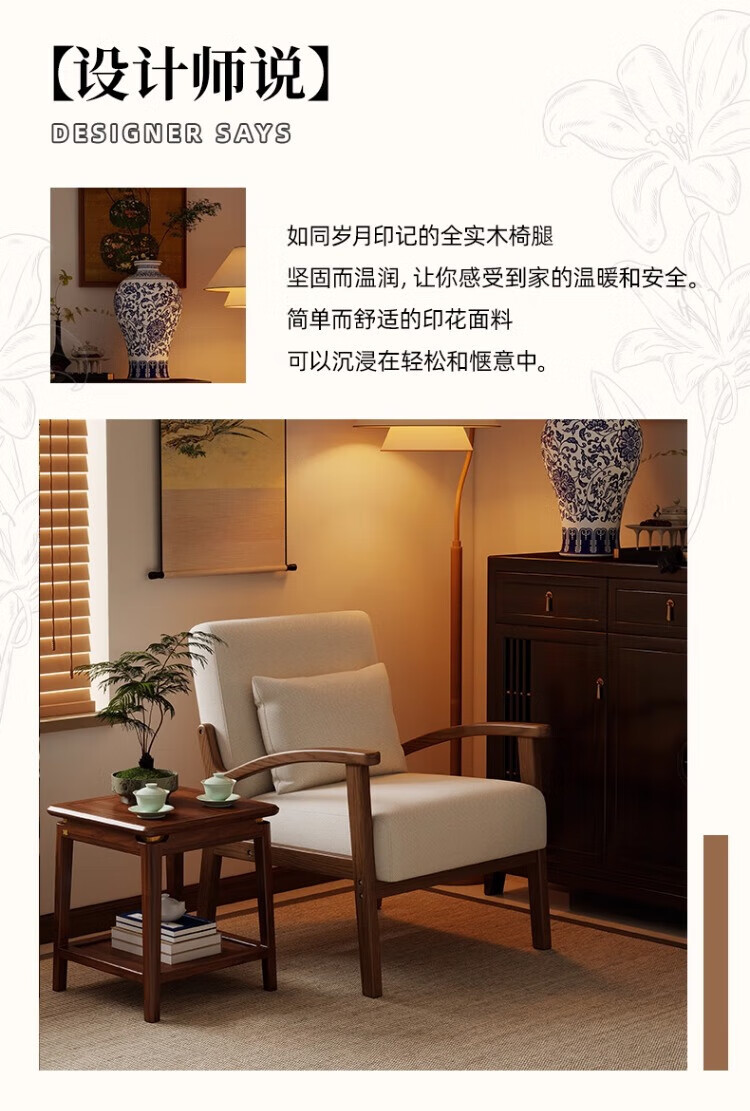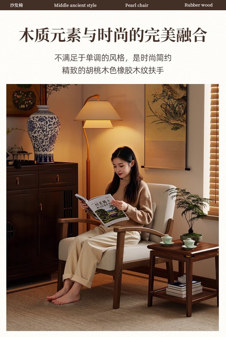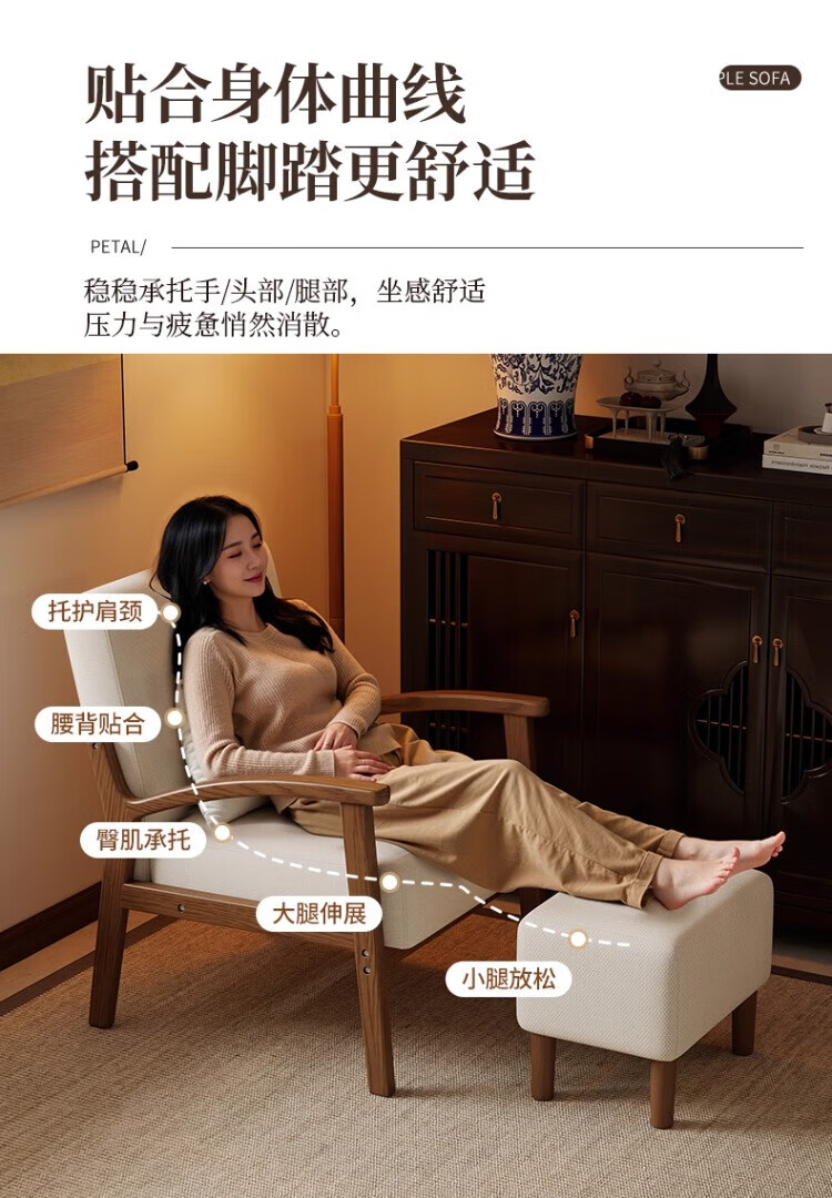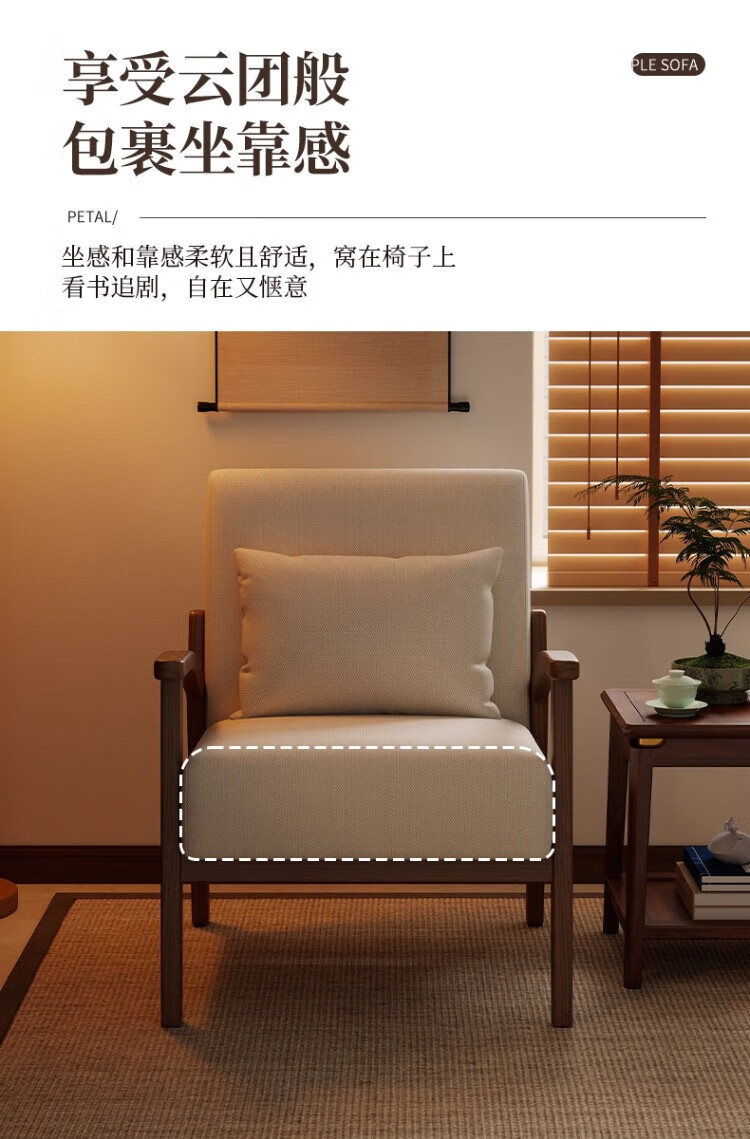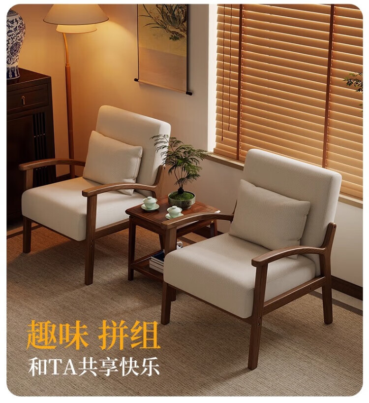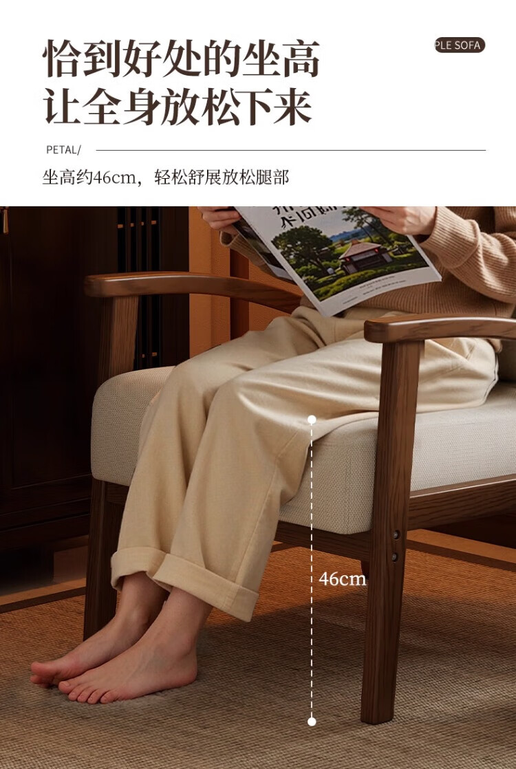Solid wood single chair retro style single sofa living room leisure sofa chair balcony study backrest sofa seat off-white cotton and linen