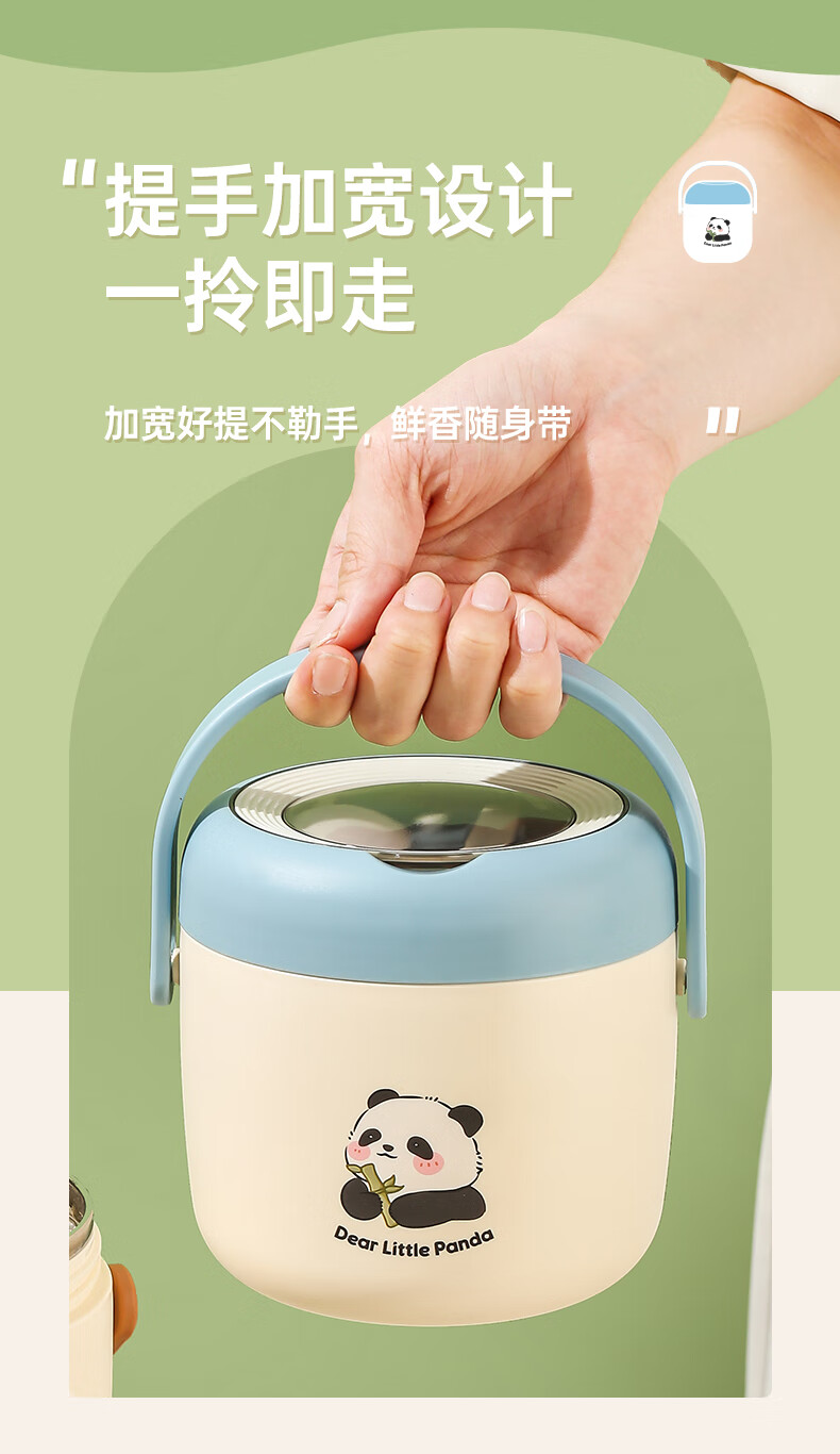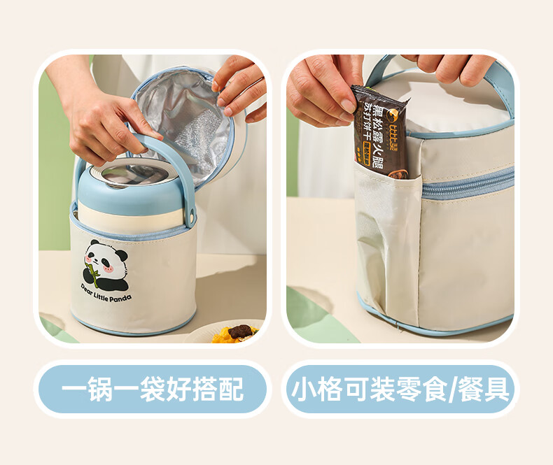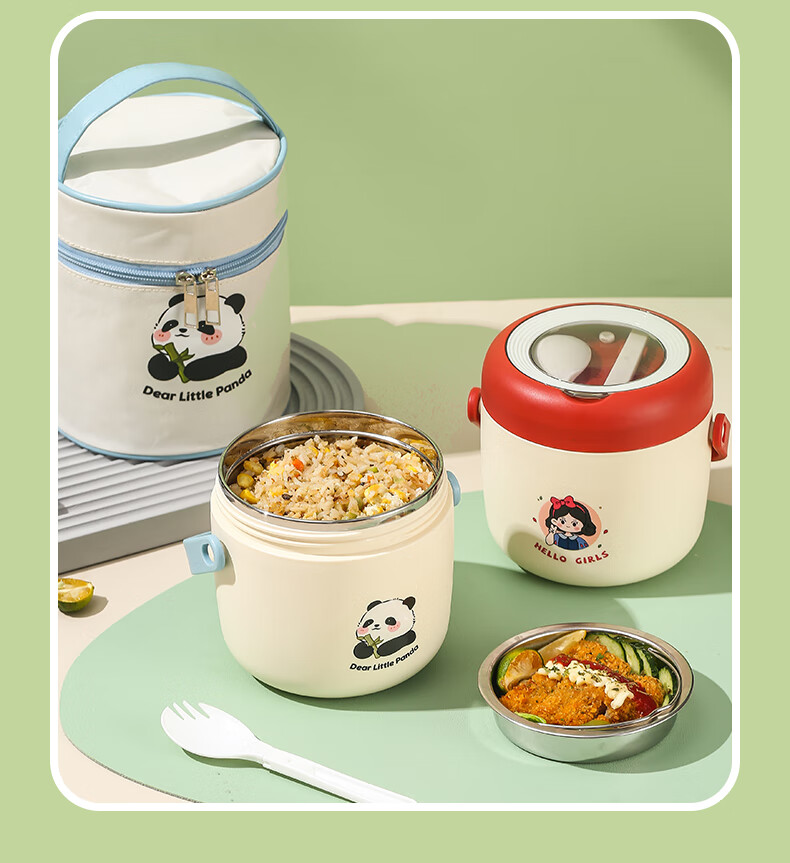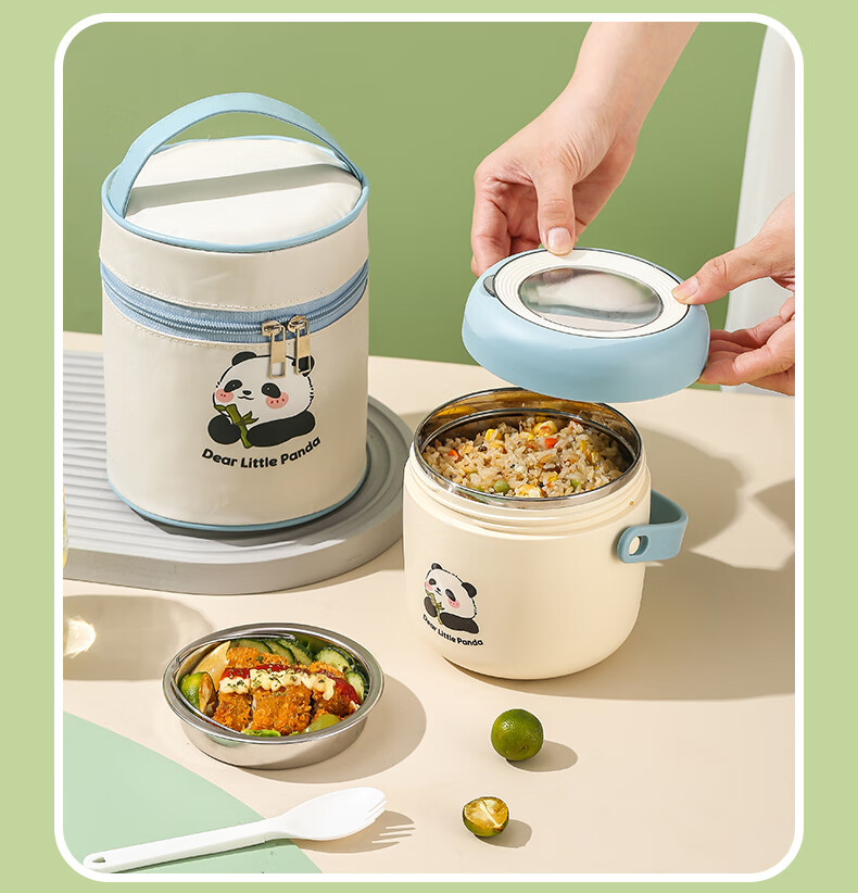 LEXIAOMAN 304 insulated lunch box for office workers, portable for students, extra long insulated bucket, stainless steel lunch box, multi-layered soup kettle, panda free folding spoon