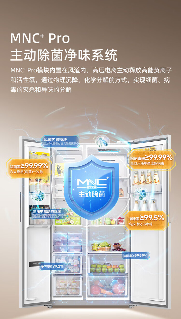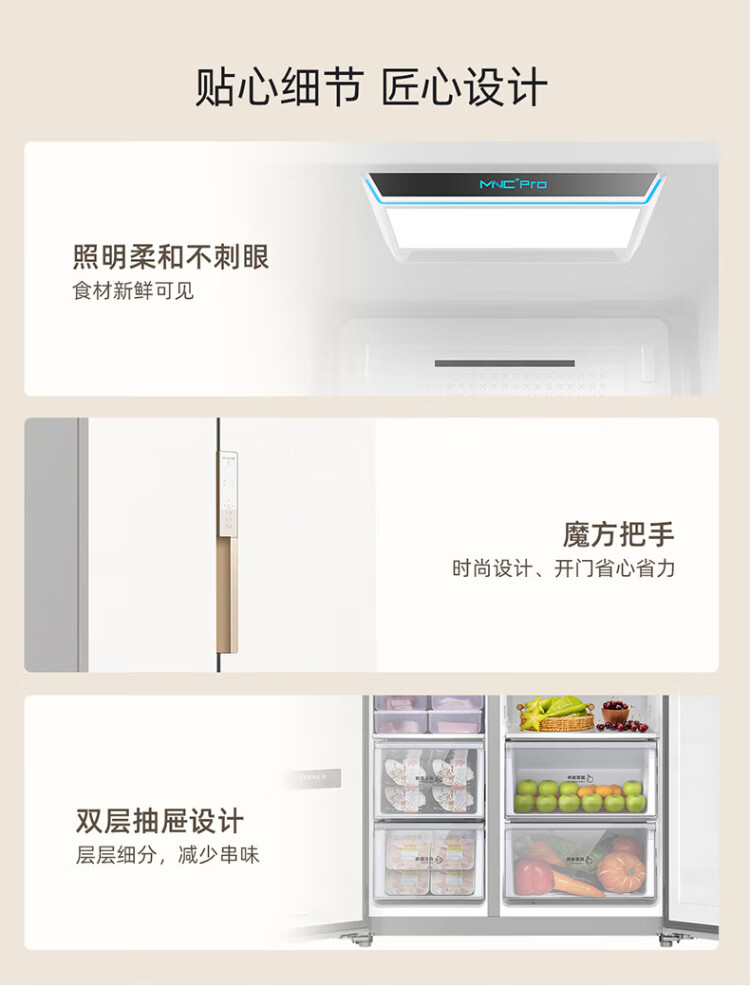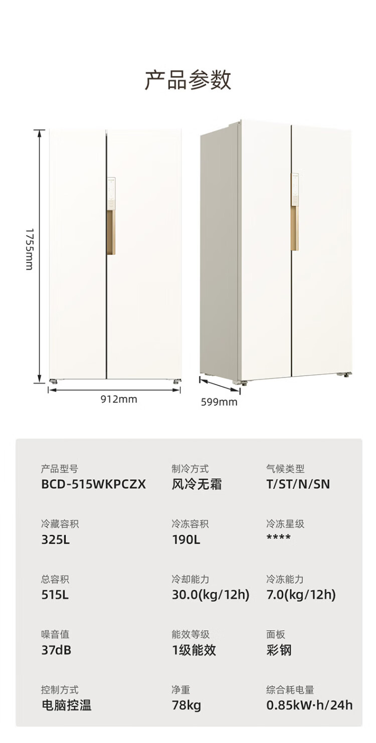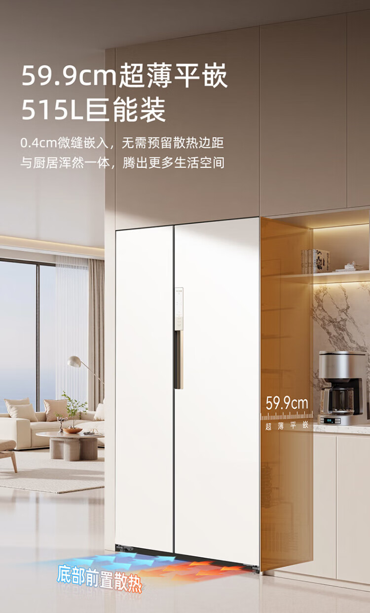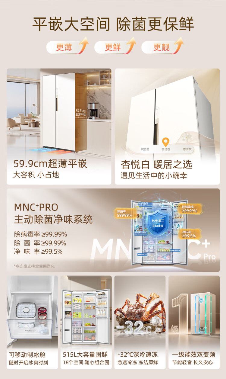 MeiLing Xiaoquexing 515L side-by-side door refrigerator, active sterilization and odor-free, ultra-thin zero-flat built-in large capacity, first-class energy efficiency, air-cooled, frost-free BCD-515WKPCZX National subsidy Xiaoquexing 515WKPCZX