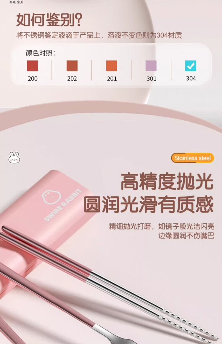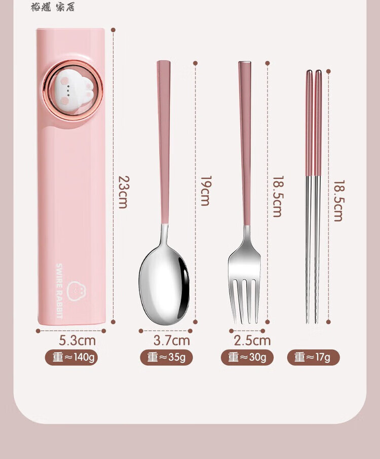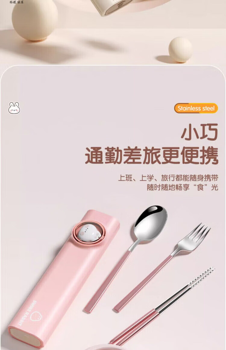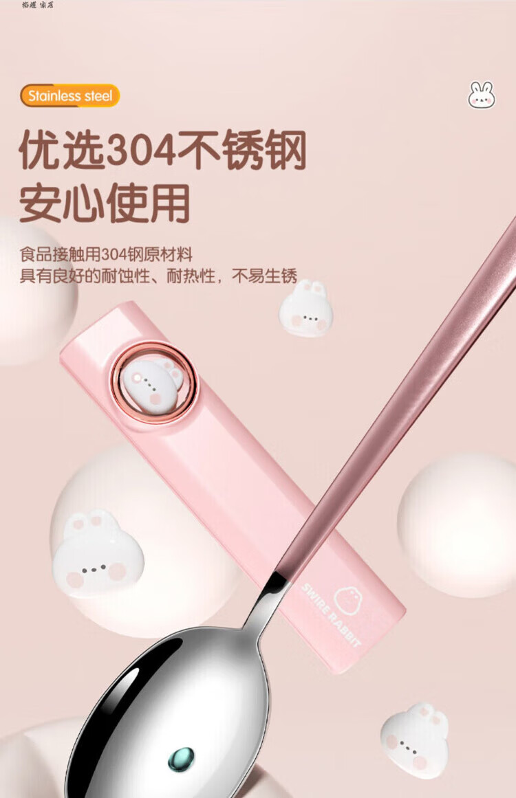 Wild Pigeon brand chopsticks and spoon set, portable tableware for primary school students, one person, one chopstick, children's special 316 stainless steel 304 Pink Rabbit (chopsticks and spoon box)