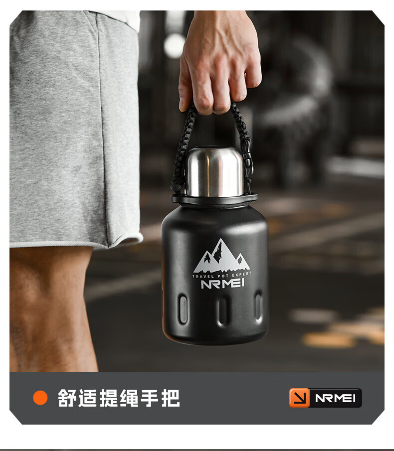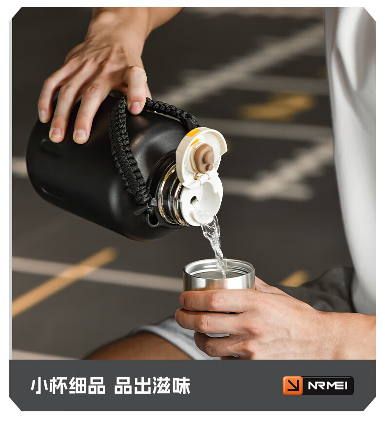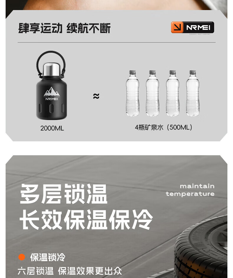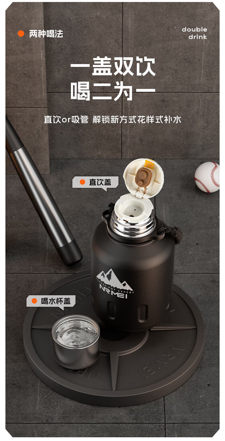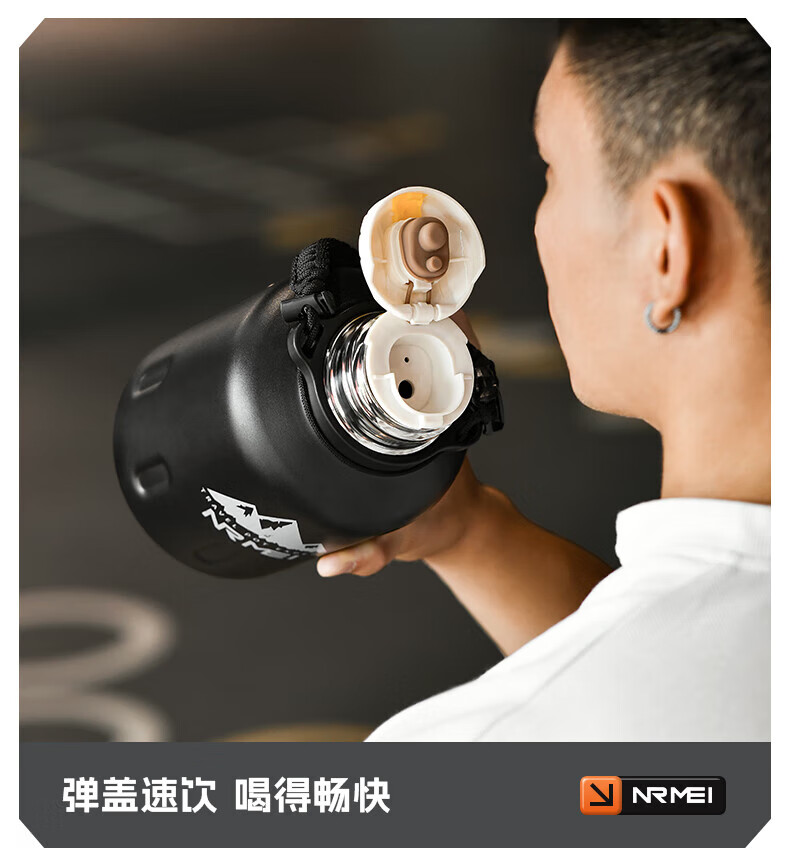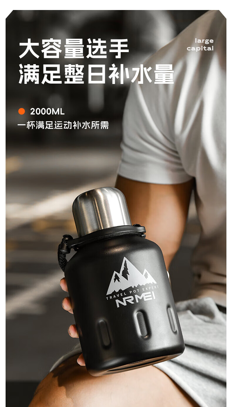 NRMEi thermos cup large capacity men's 316 stainless steel ton barrel student sports fitness portable cold storage black 2000ml antibacterial 316+ direct drinking lid