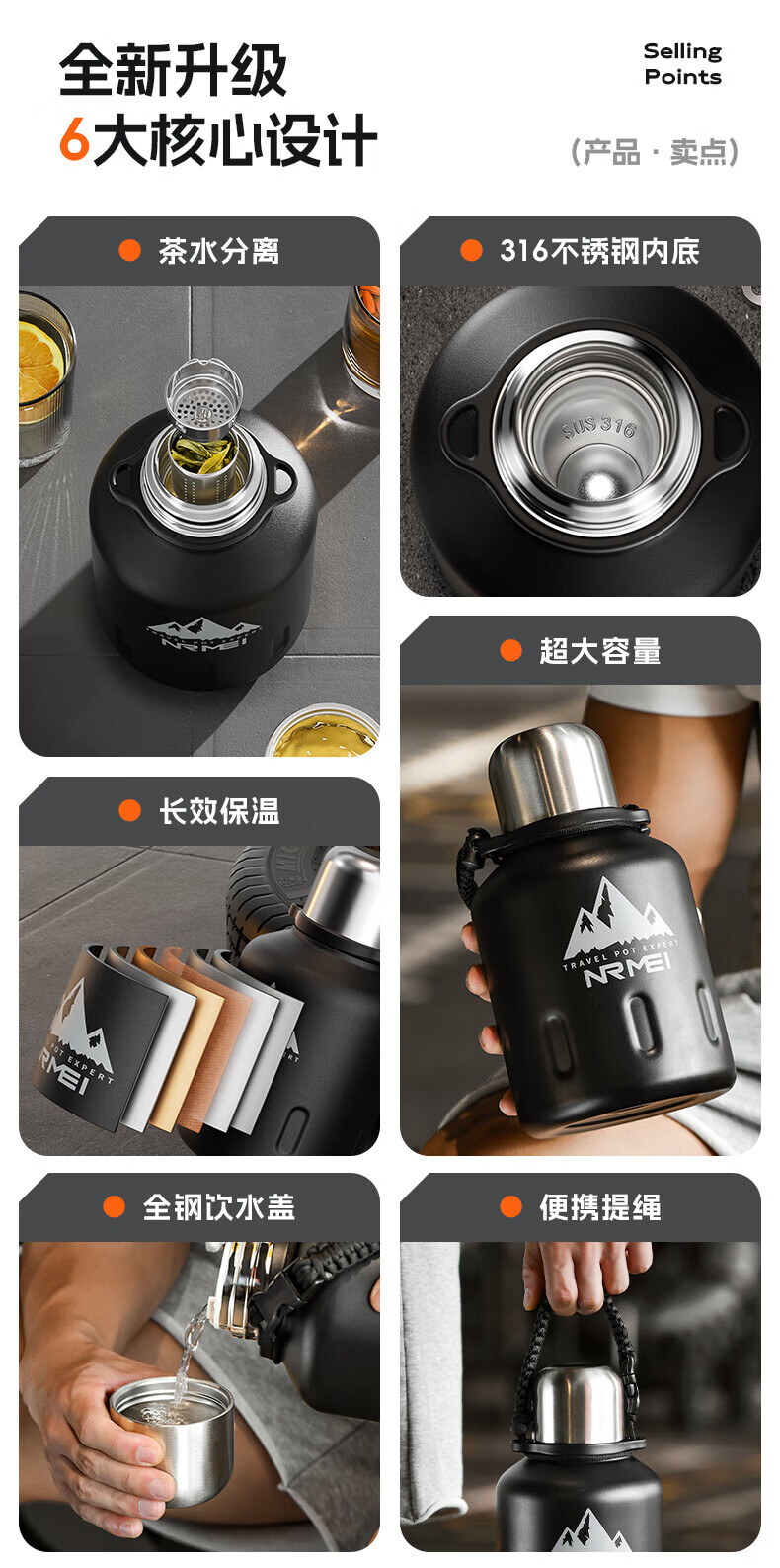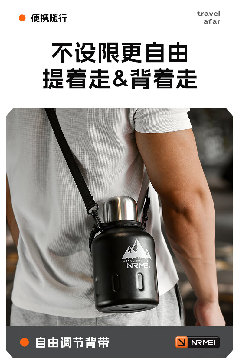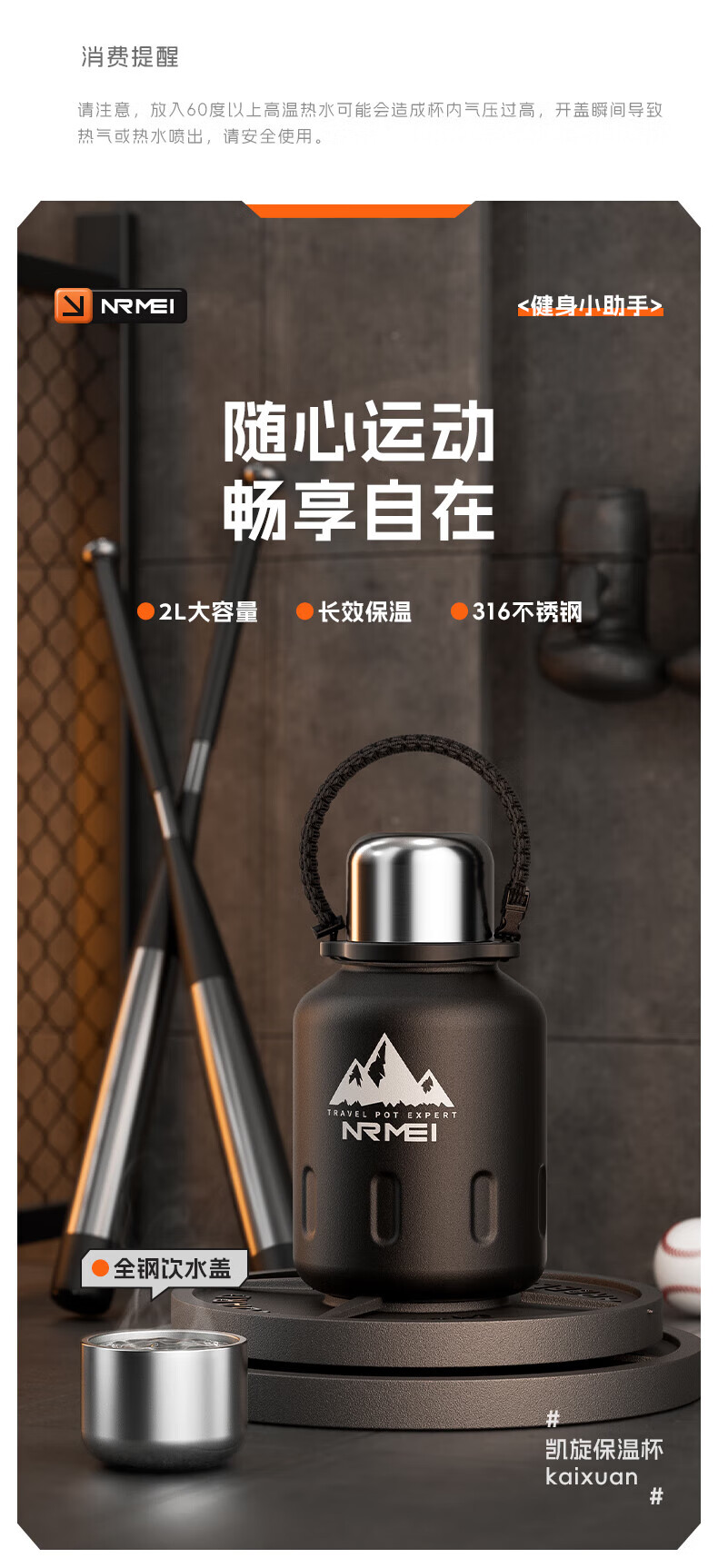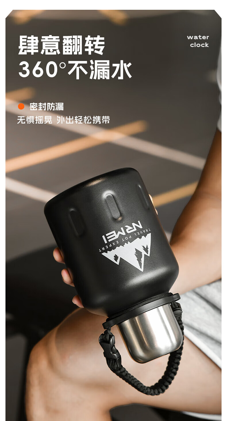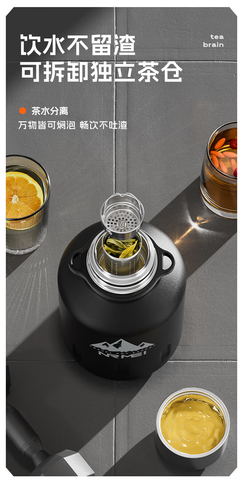 NRMEi thermos cup large capacity men's 316 stainless steel ton barrel student sports fitness portable cold storage black 2000ml antibacterial 316+ direct drinking lid