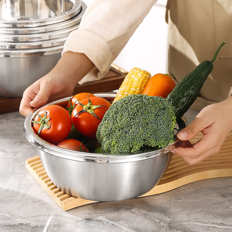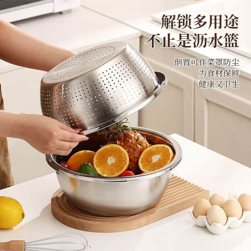 Stainless steel drain basket two-piece set household kitchen drain basin fine hole drain basket leaking rice filter European style large reverse edge food grade stainless steel 28CM two-piece set drain basket + solid basin