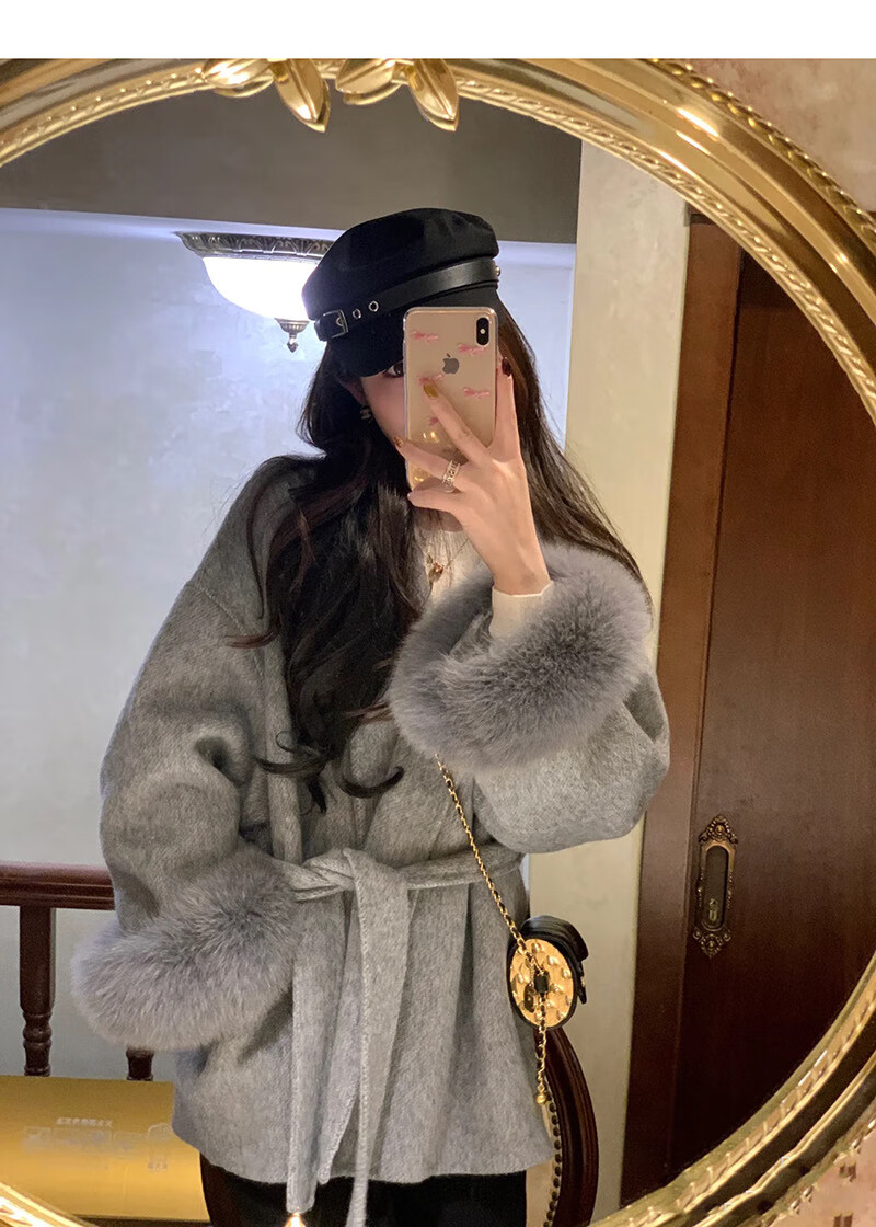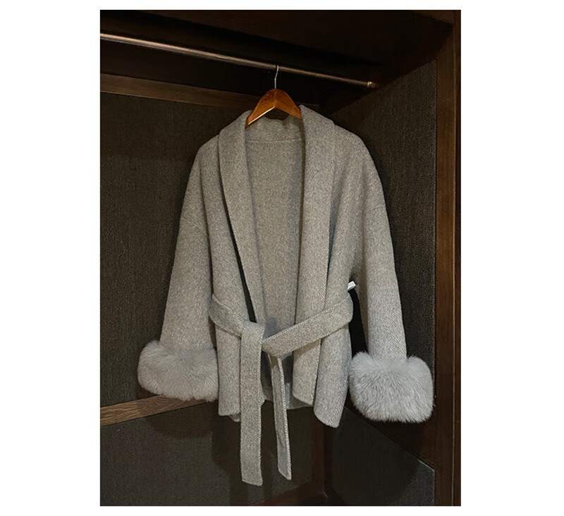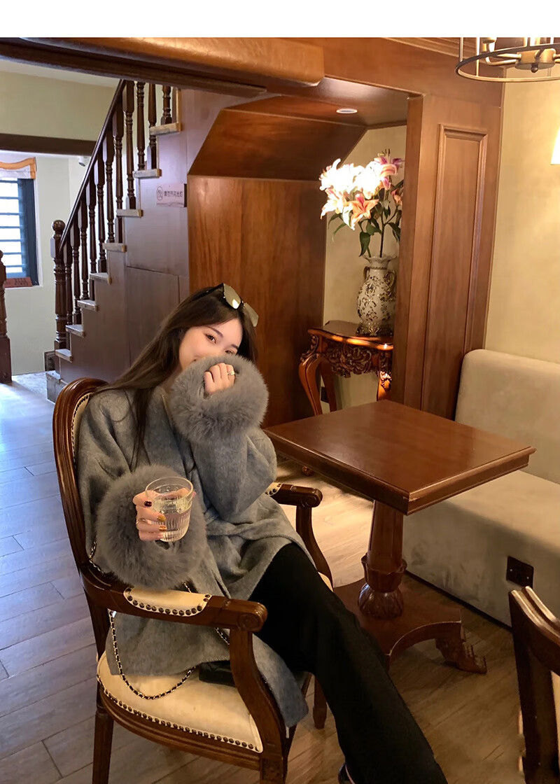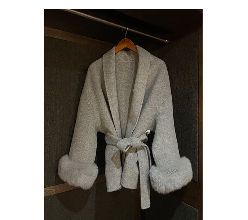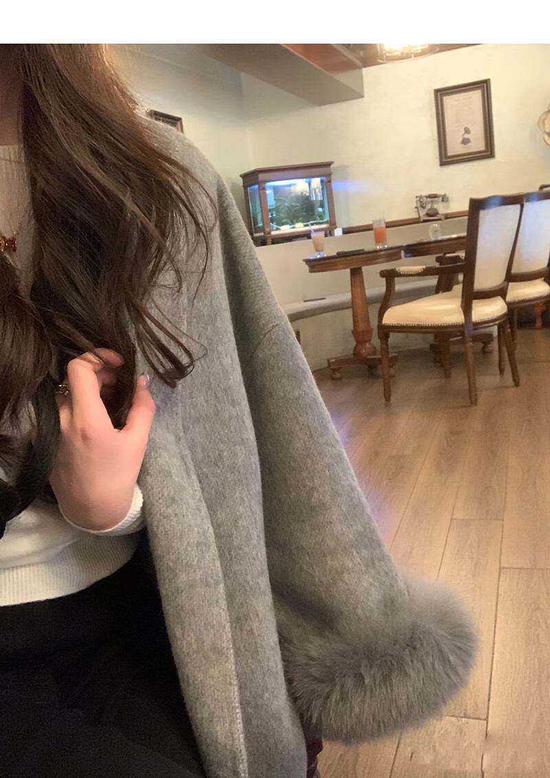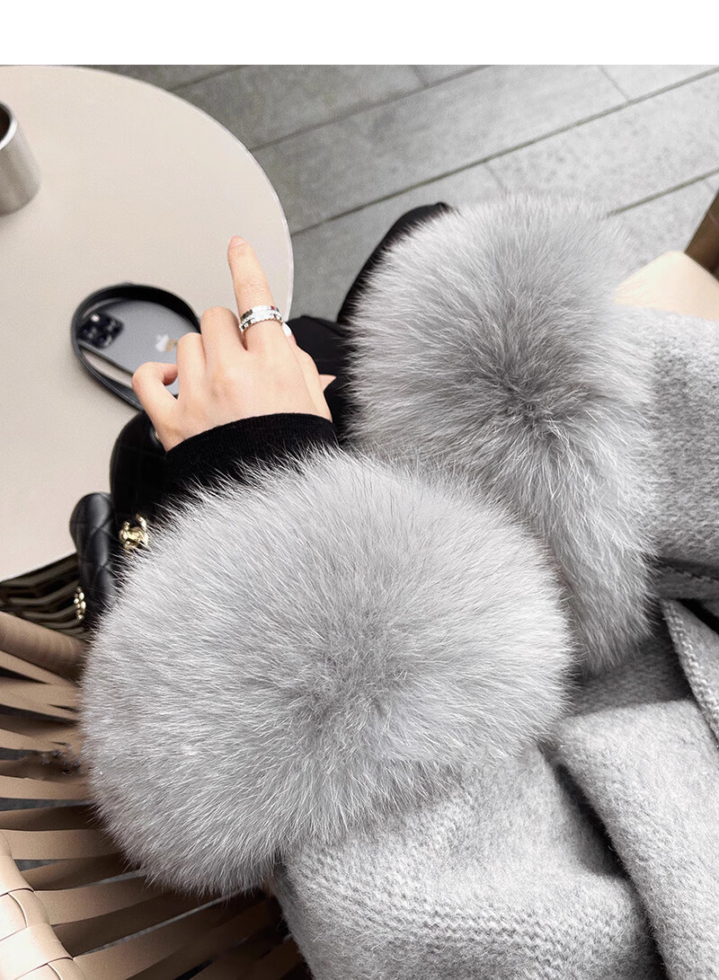 Pierre Cardin oversized fox fur double-sided cashmere coat for women 2025 winter new temperament short small woolen coat gray M