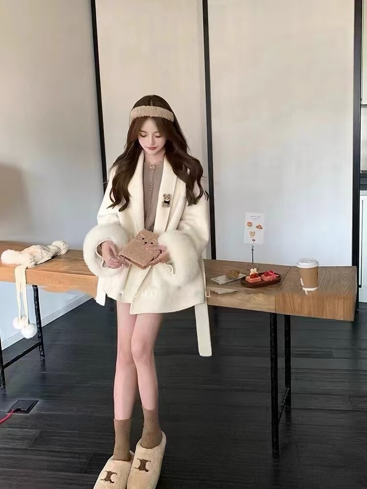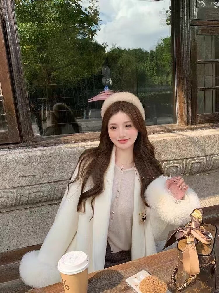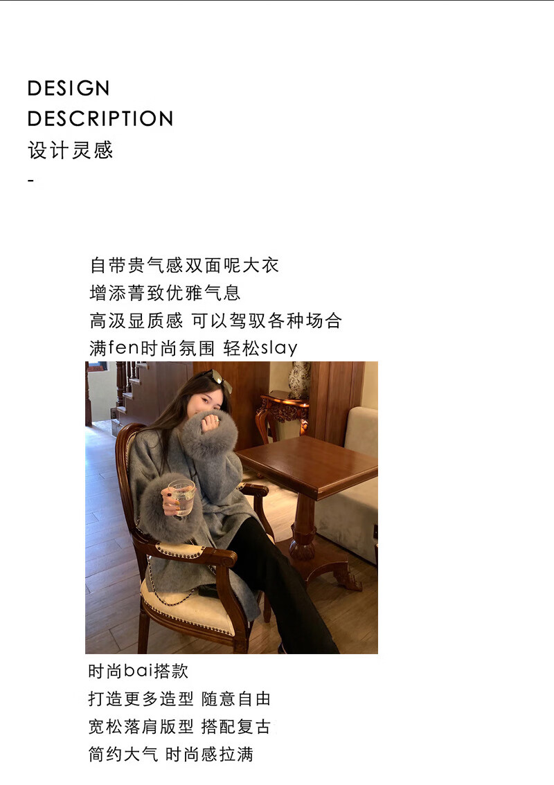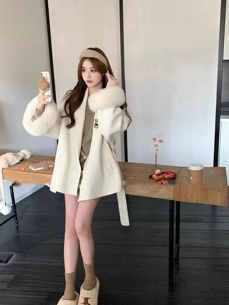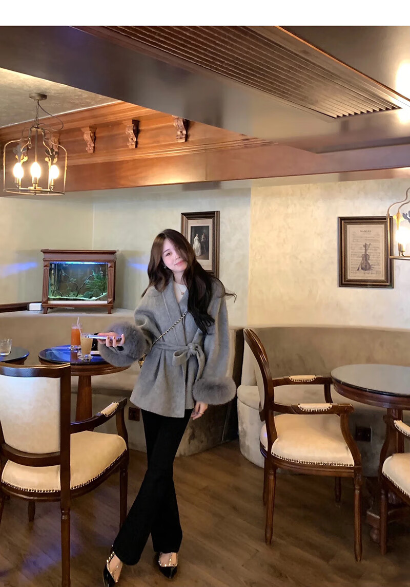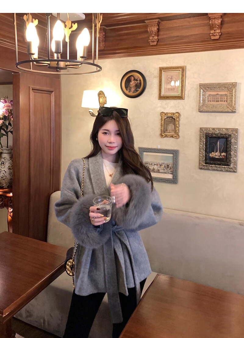 Pierre Cardin oversized fox fur double-sided cashmere coat for women 2025 winter new temperament short small woolen coat gray M