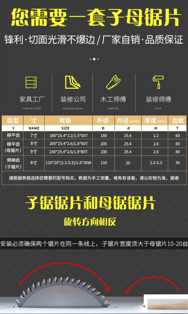 Ecological paint-free board special woodworking dust-free double saw blade 7 inch 8 inch sliding table saw cutting board precision saw blade 12 inch 300x3 points 2x30x96 ladder flat tooth + 120-22 hole double row double saw blade set