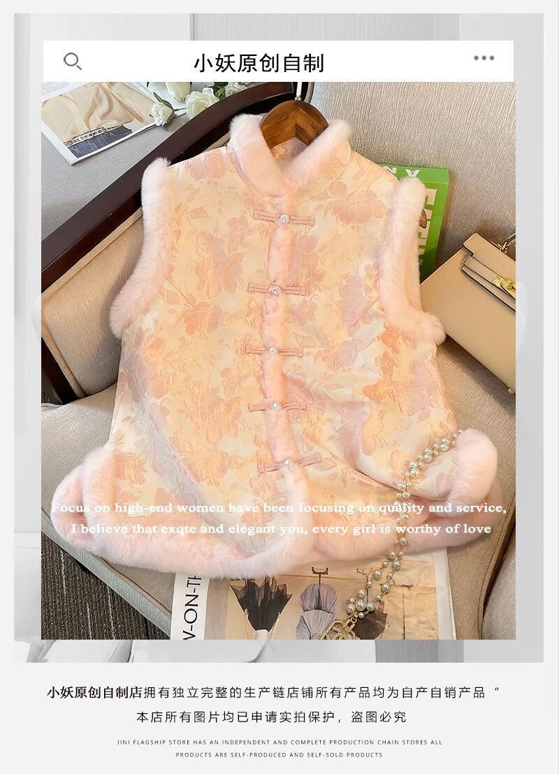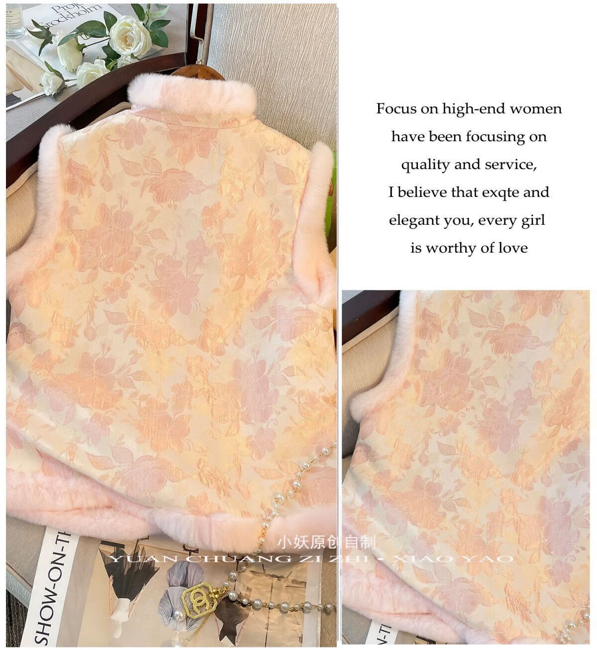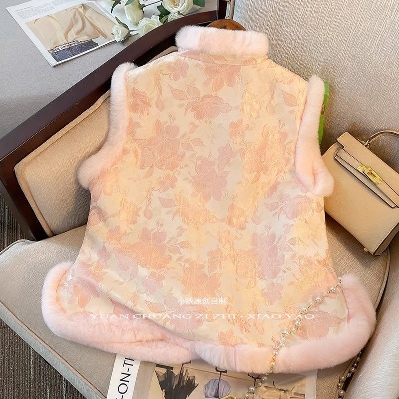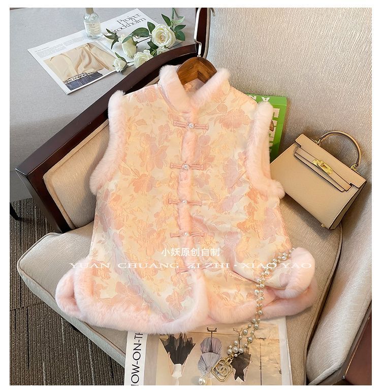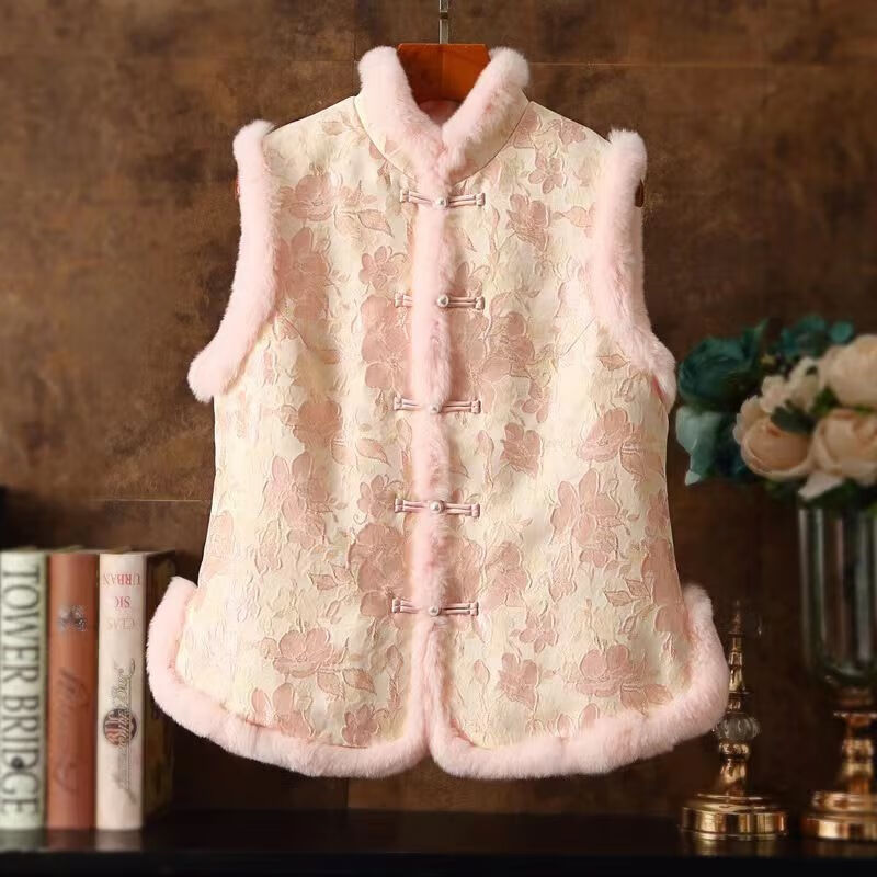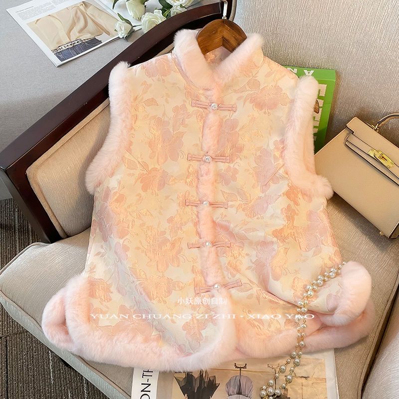 Playboy (PLAYBOY) Retro New Chinese Style National Style Thickened Velvet Improved Vest Women's Rabbit Fur Stand Collar Button Cheongsam Jacket Warm Top Pink Official Flagship Edition L