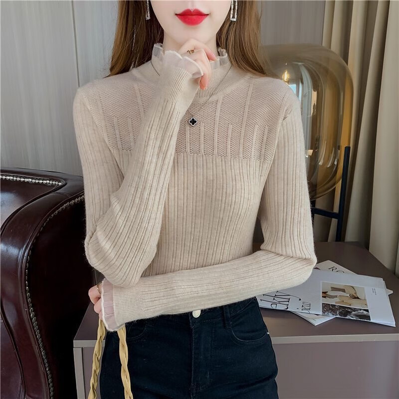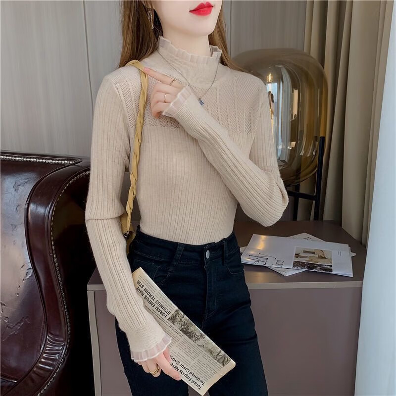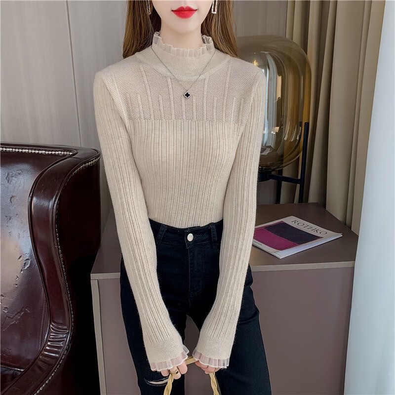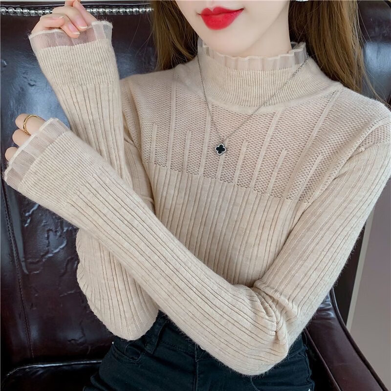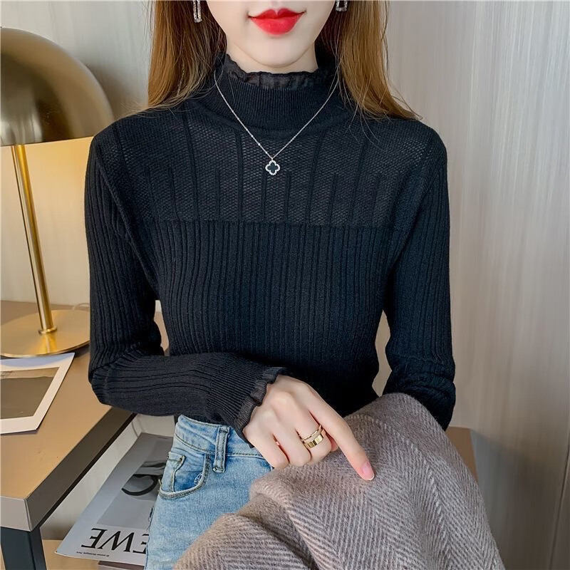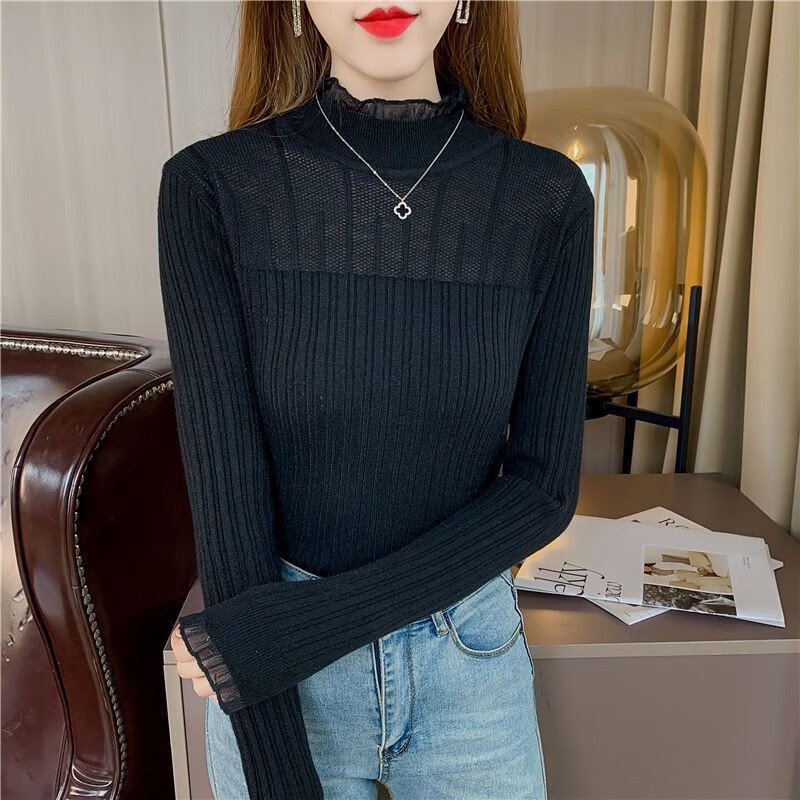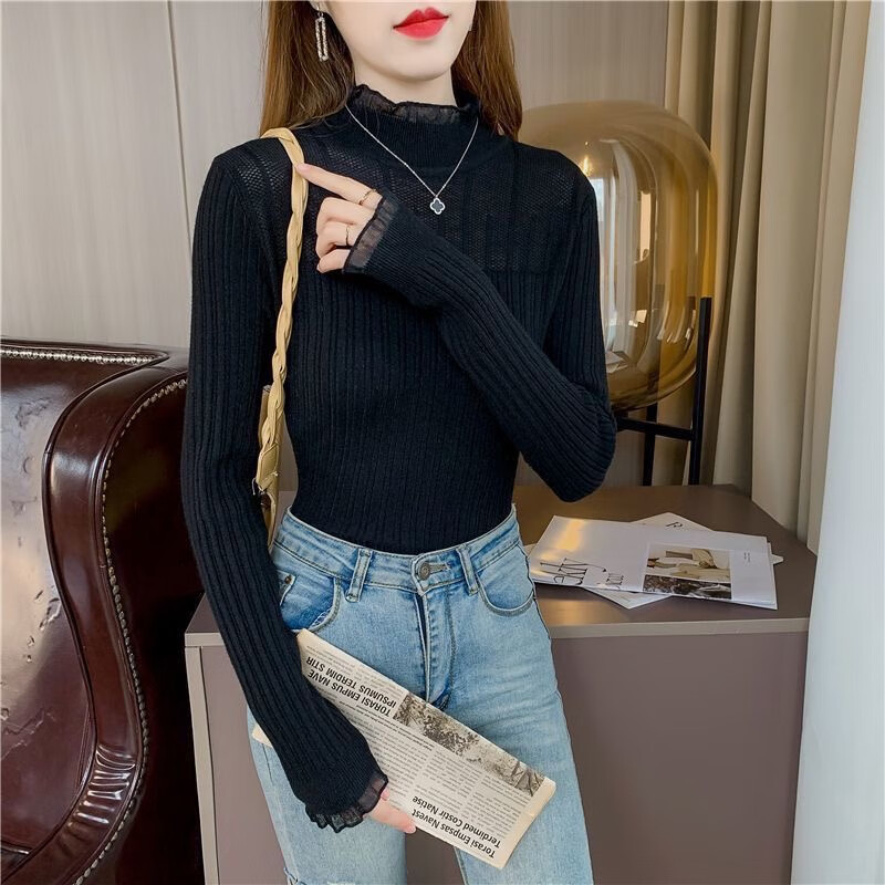 SHIYADA Lace Bottoming Shirt Women's Autumn and Winter New Half-High Collar Style Slim-fitting Character Knitted Sweater Top Black (Lace Style) L Recommended 100-110 catties