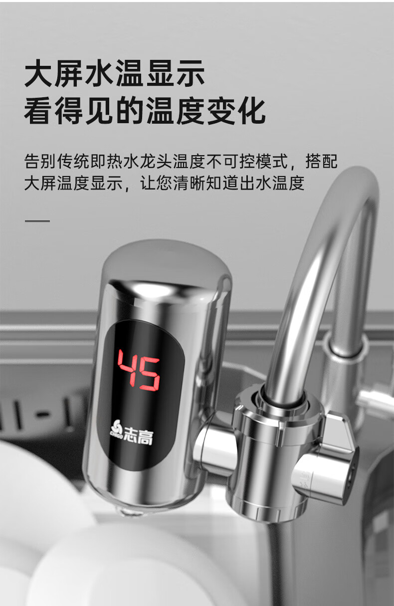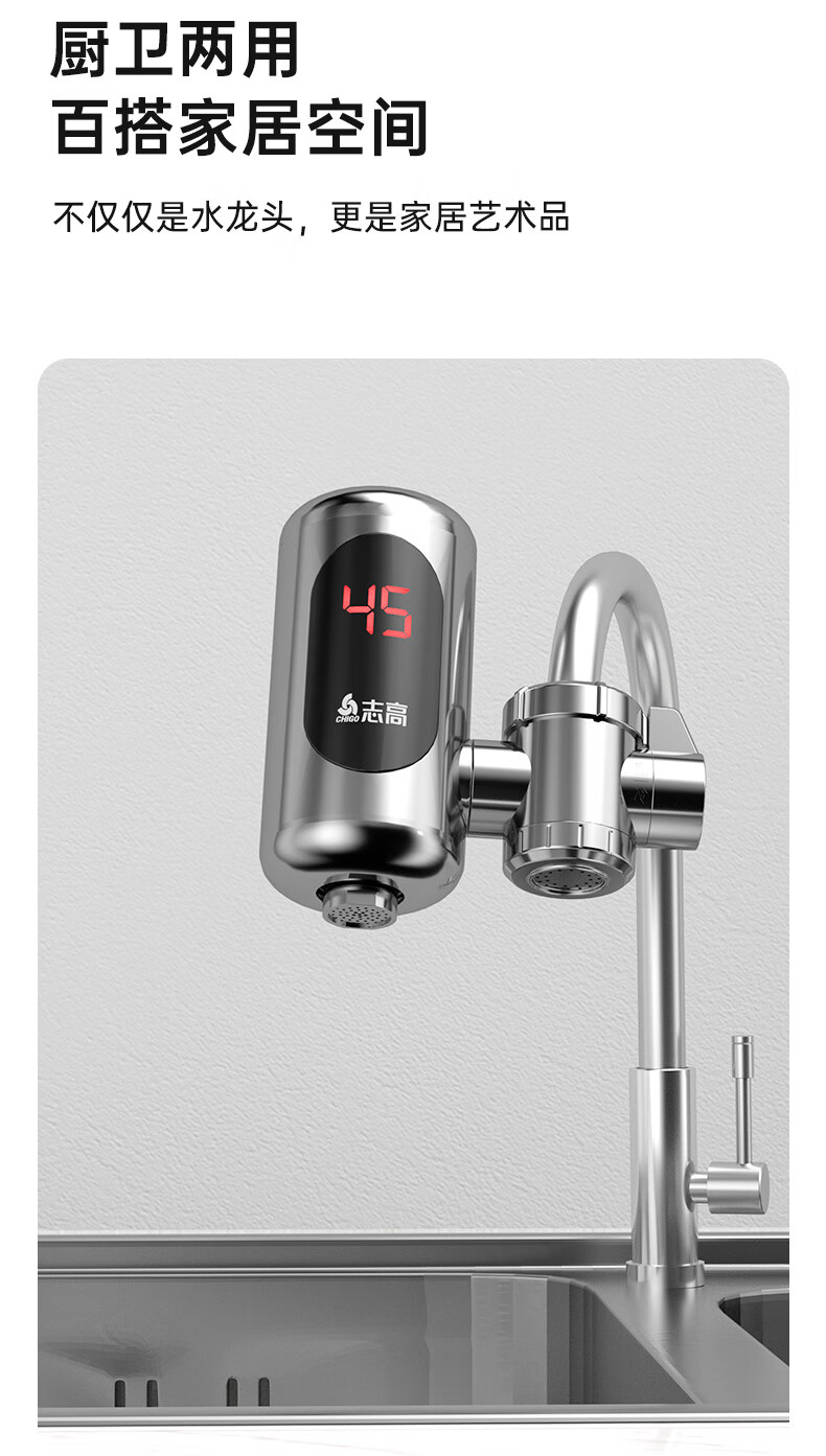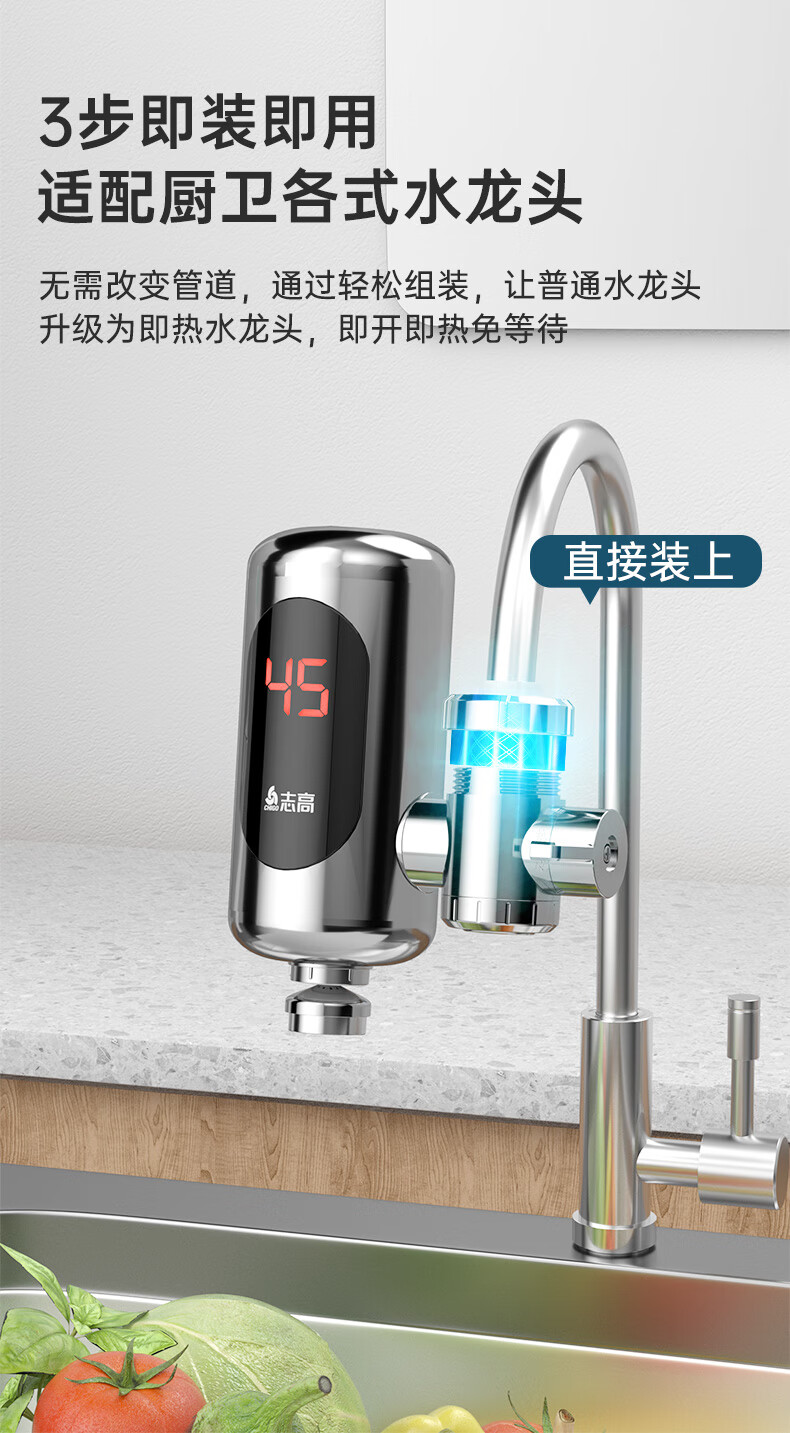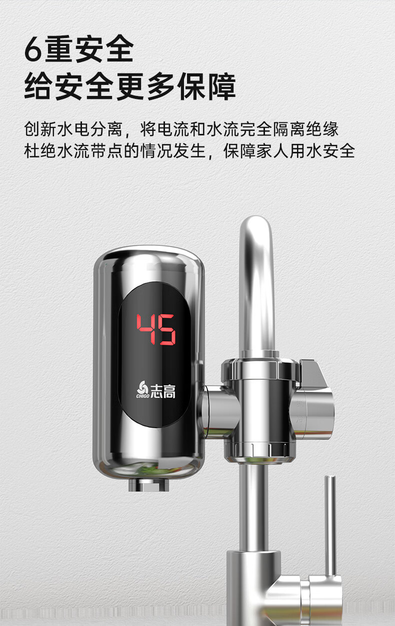 CHIGO electric hot water faucet installation-free stainless steel heating kitchen bathroom kitchen treasure instant hot water heater intelligent digital display snow mountain white + leakage protector
