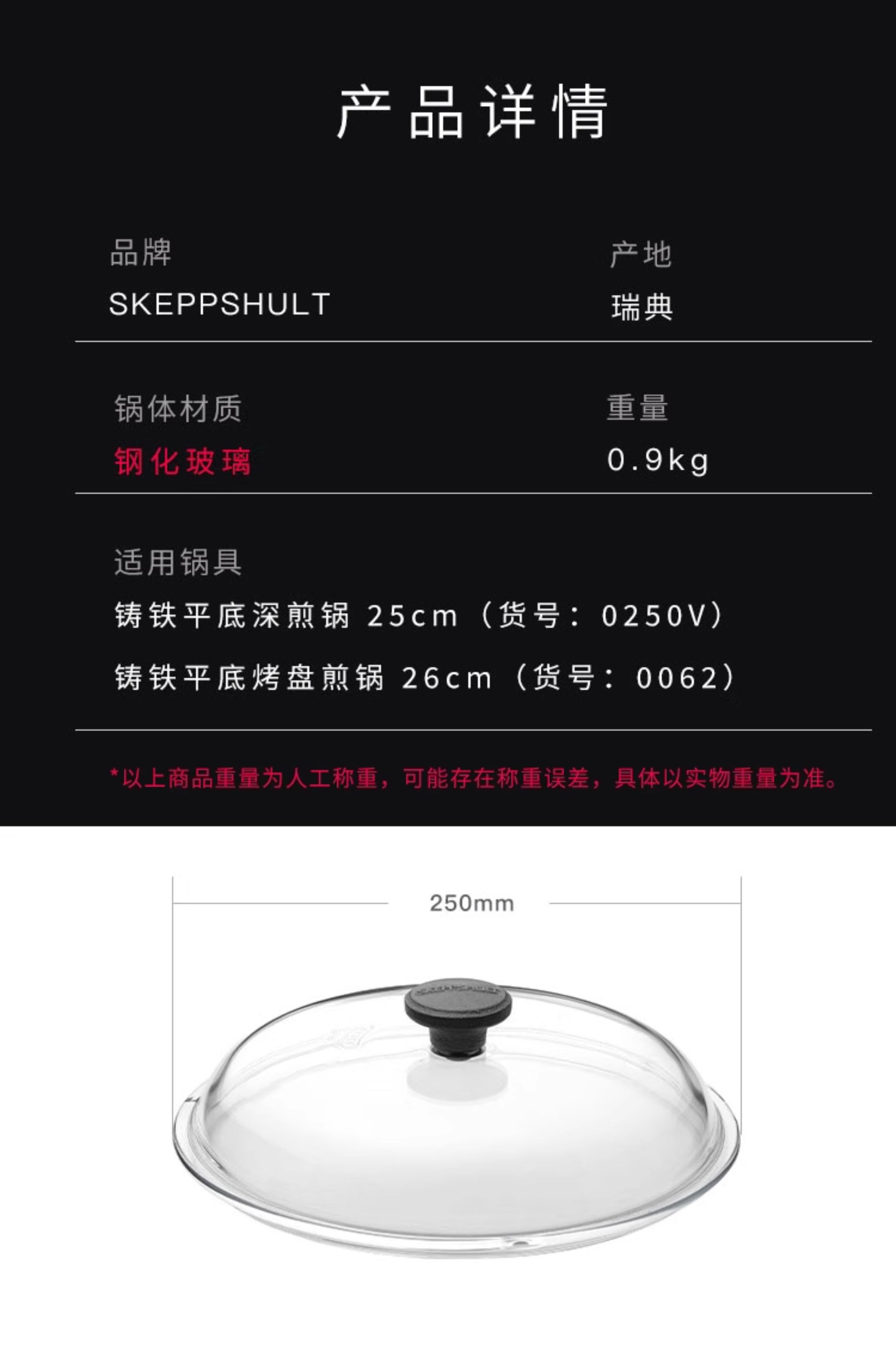 Skeppshult tempered glass 25cm pot lid 0120GL suitable for 0250V and 0062 frying pans
