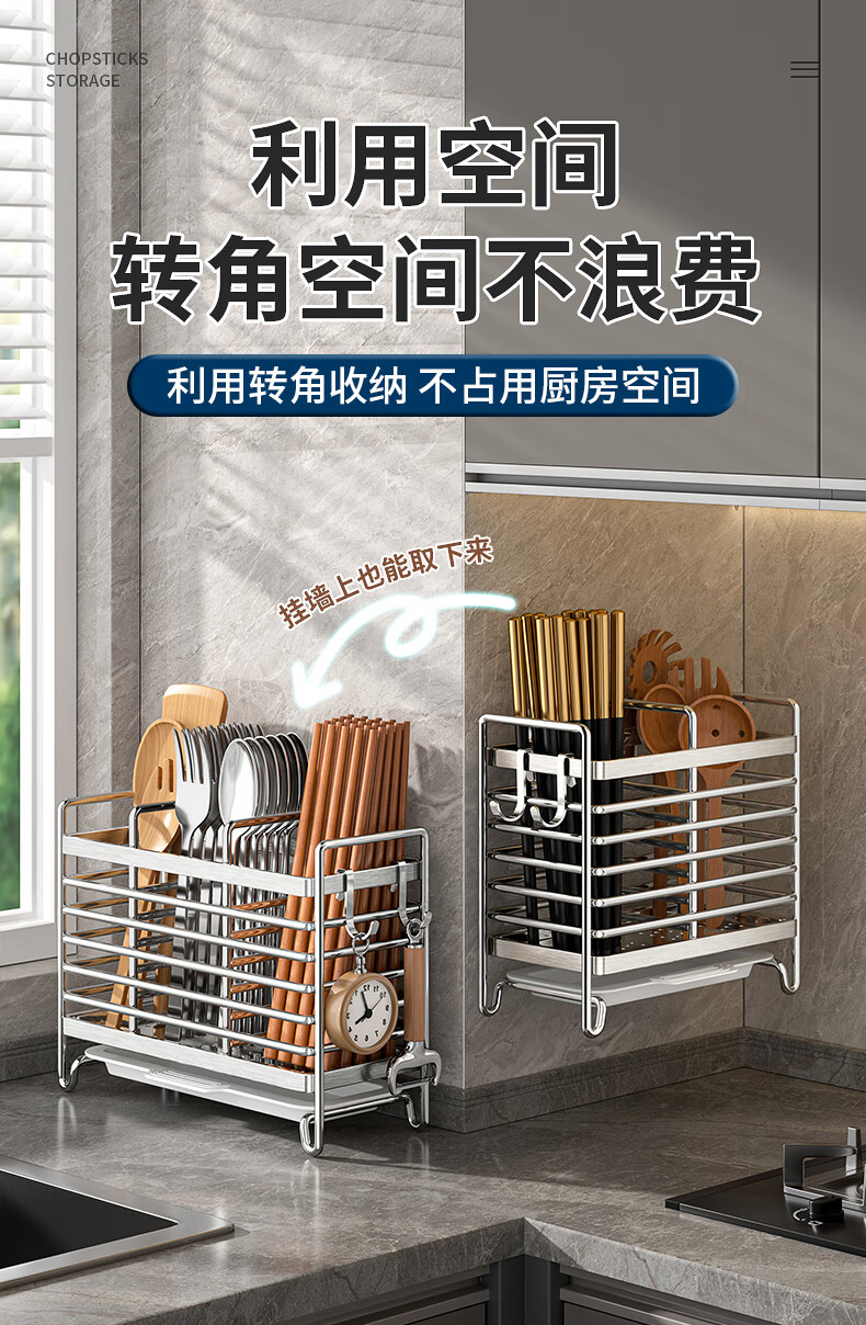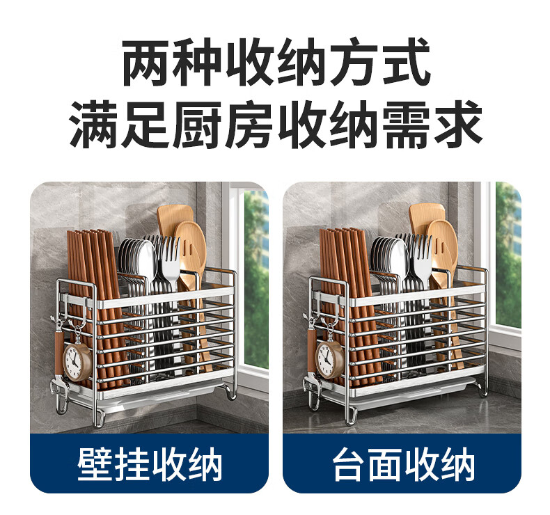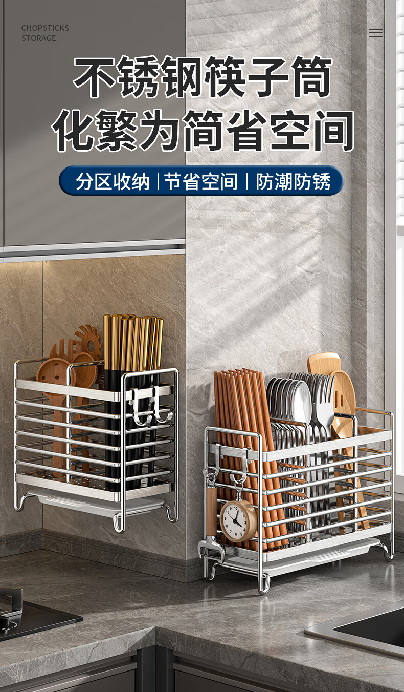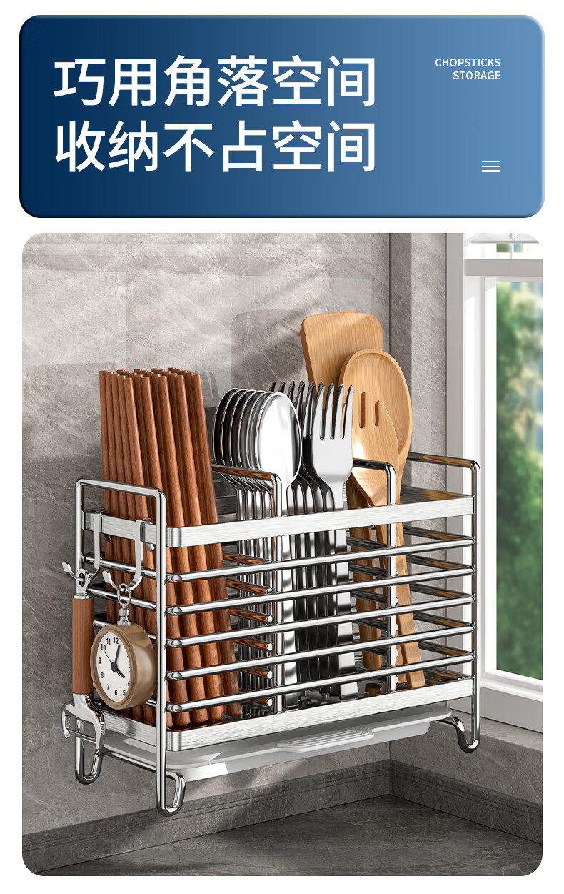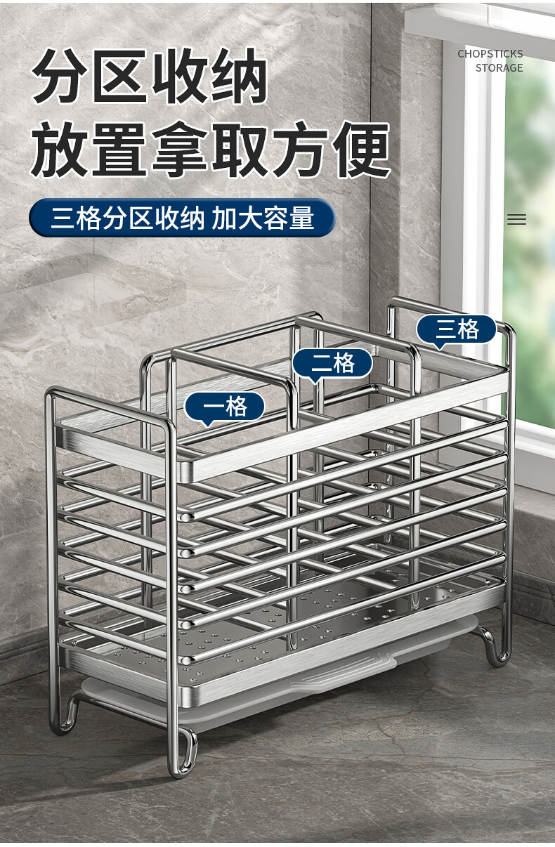 Kitchen rack stainless steel chopstick holder countertop wall hanging with drain tray stainless steel chopstick holder three compartments