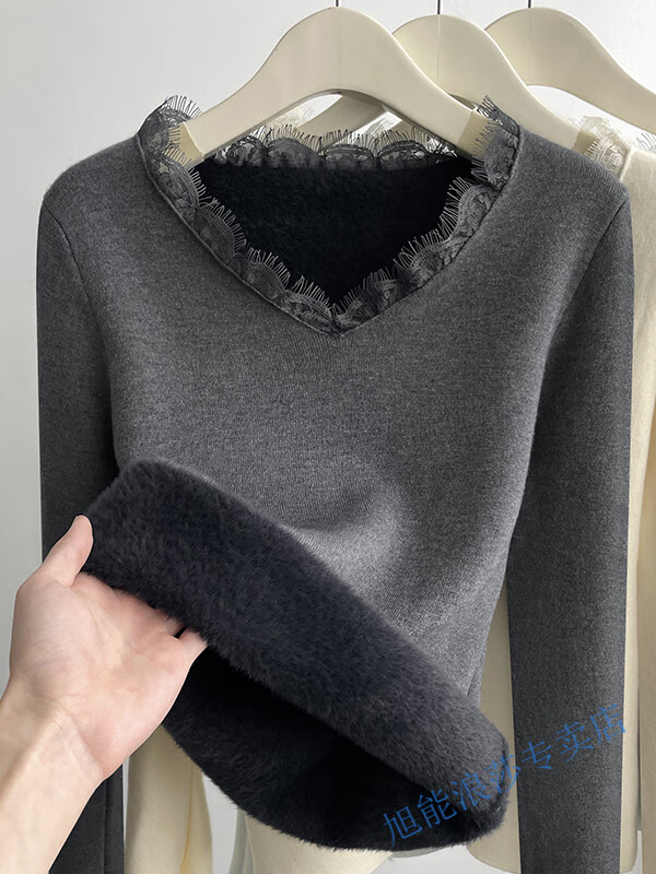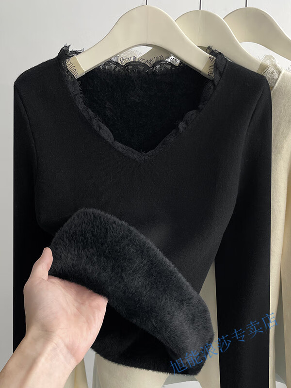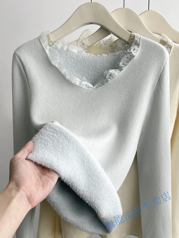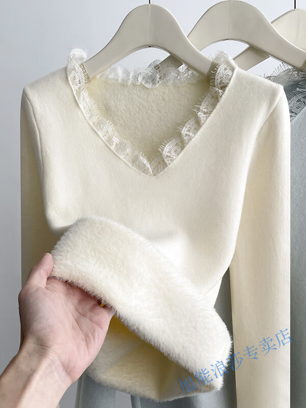 Langsha V-neck lace knitted bottoming shirt for women with velvet and thickened one-piece velvet inner wear new autumn and winter style long-sleeved top winter beige color high quality thickened 2XL recommended 125--145 catties