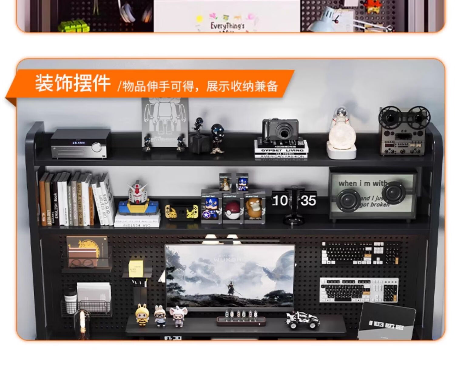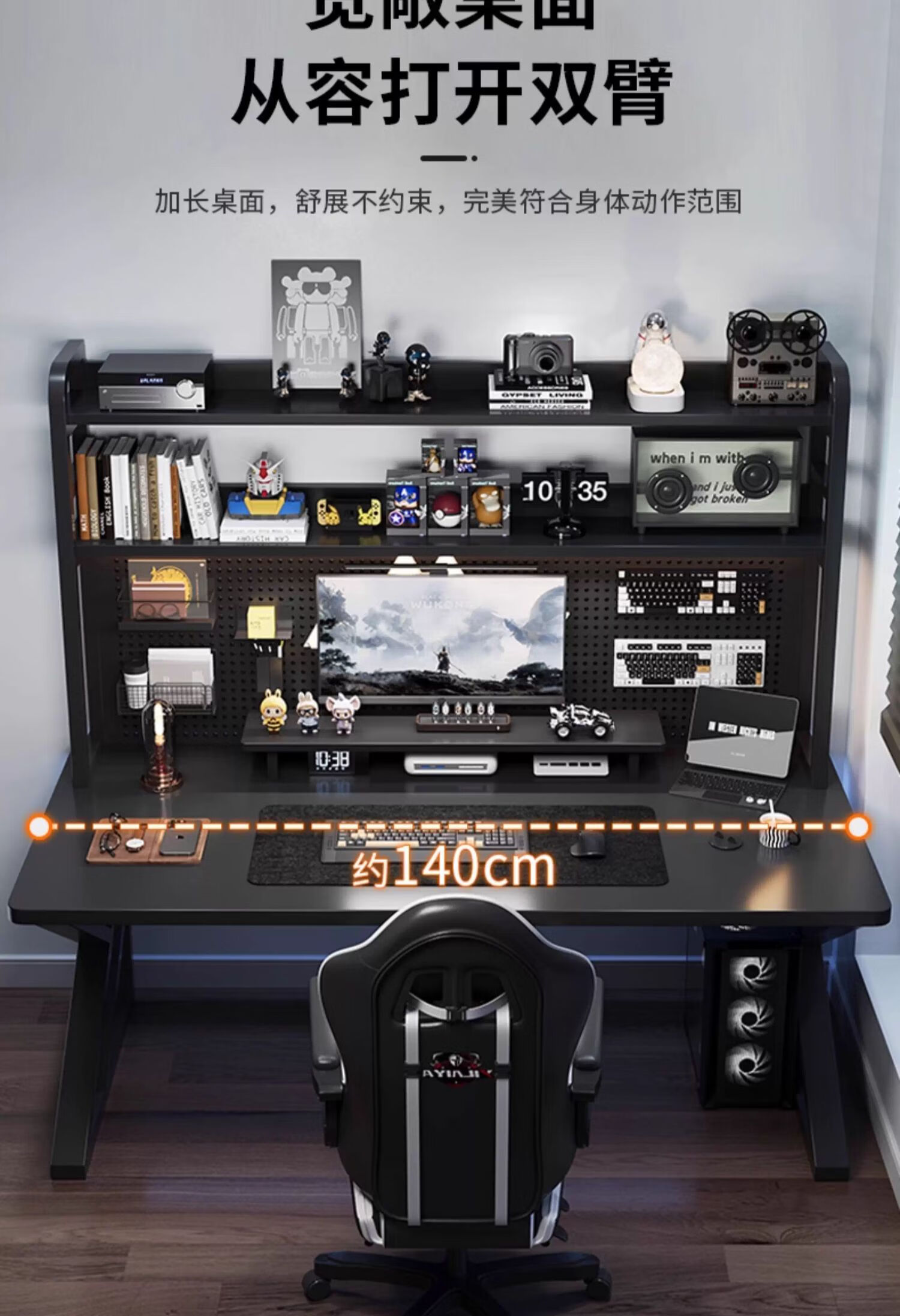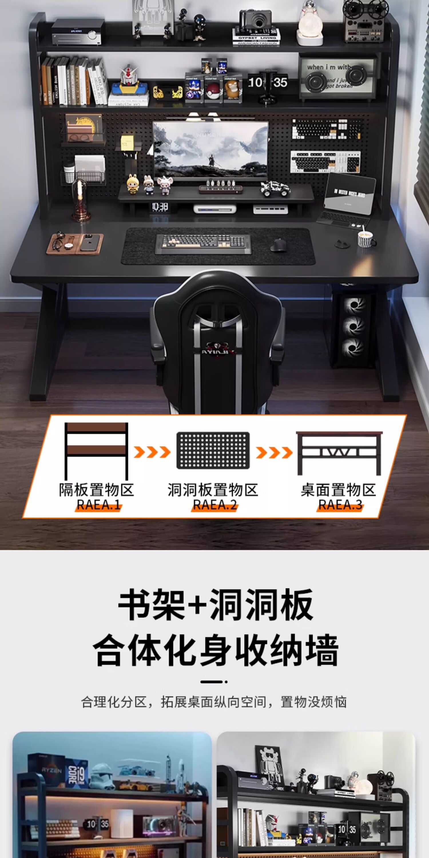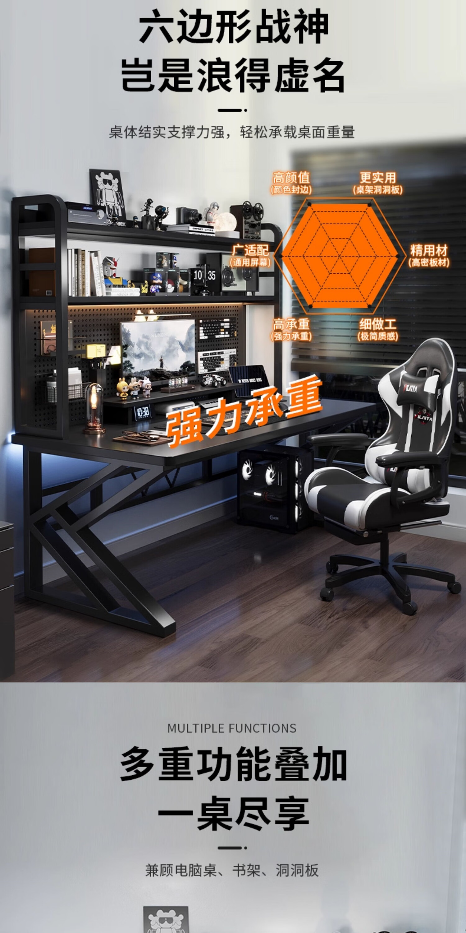 Humanities Chengjia Gaming Desk Desktop Computer Table Home Multi-Layer Bookshelf Integrated Perforated Board Computer Desk Office Writing Study Desk Double-Layer Shelf E-Sports Black (A complete set of perforated board accessories will be given when ordering) Length 120 Width 60 Height 165cm