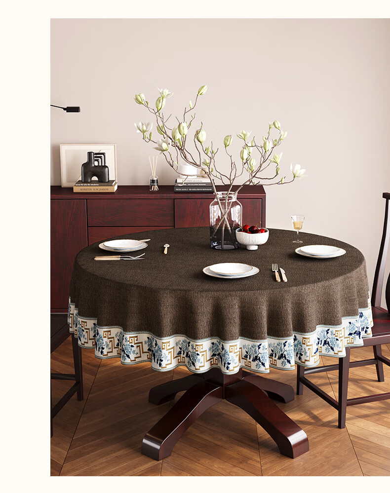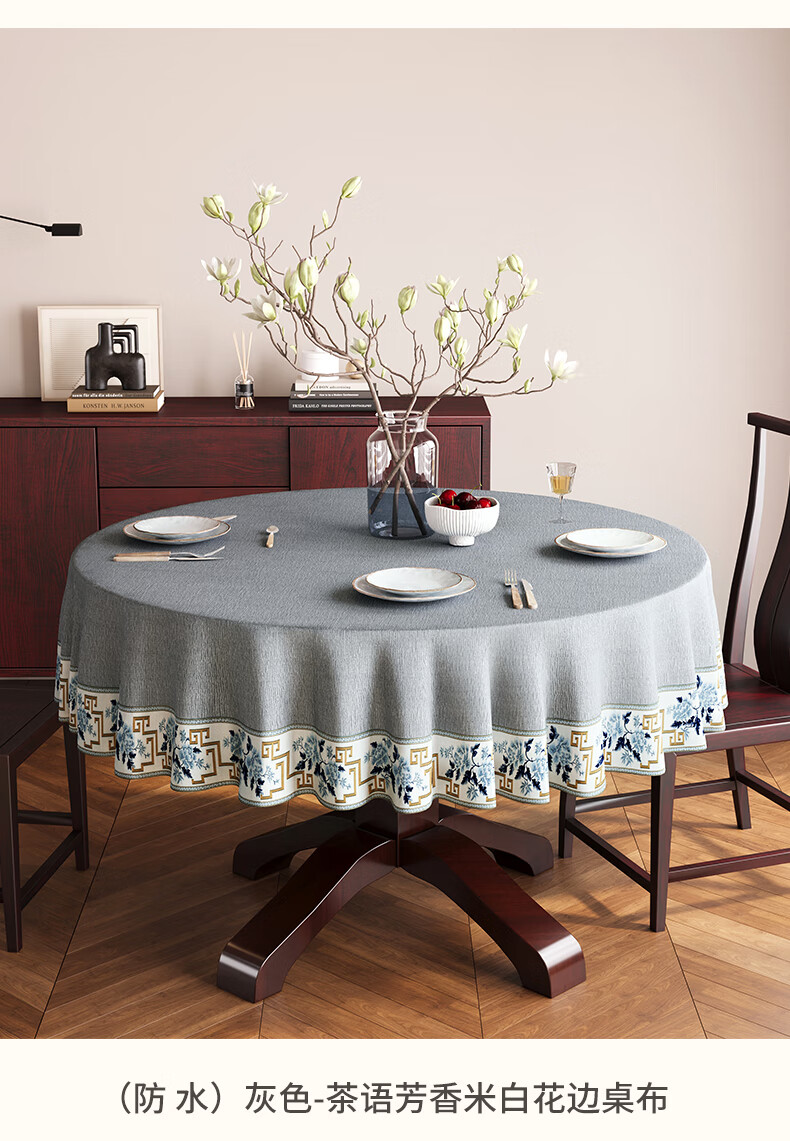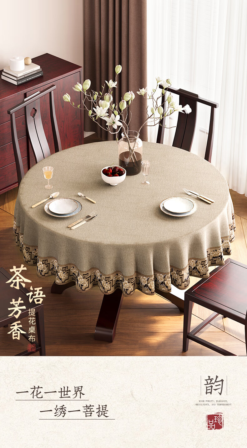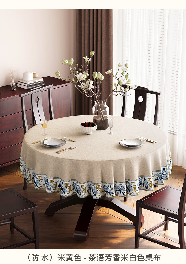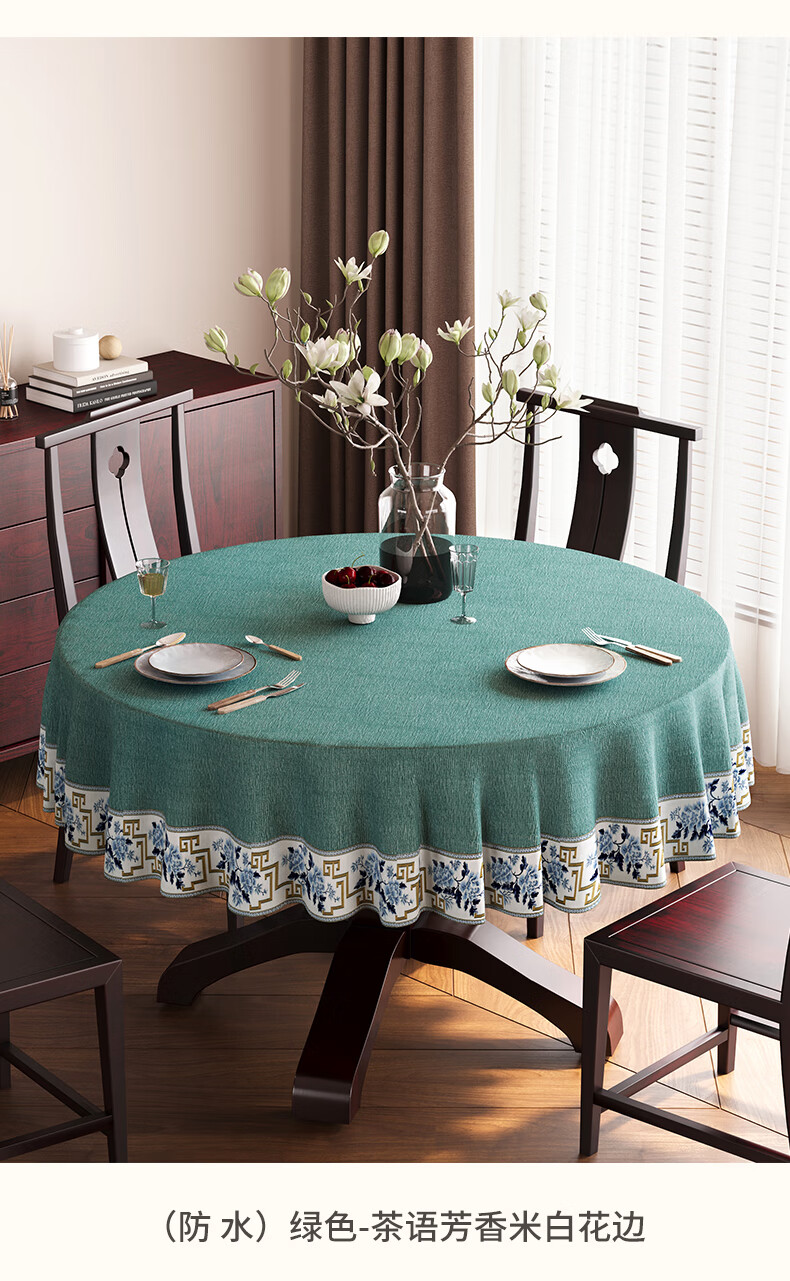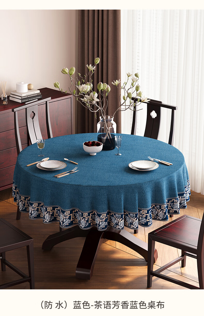 Beate Lesch new Chinese style tablecloth light luxury and high-end 2025 new large round table tablecloth cotton and linen fabric dining table coffee table tablecloth (waterproof) blue-tea color 2.6m round tablecloth (recommended for round tables with a diameter of less than 2.2m)
