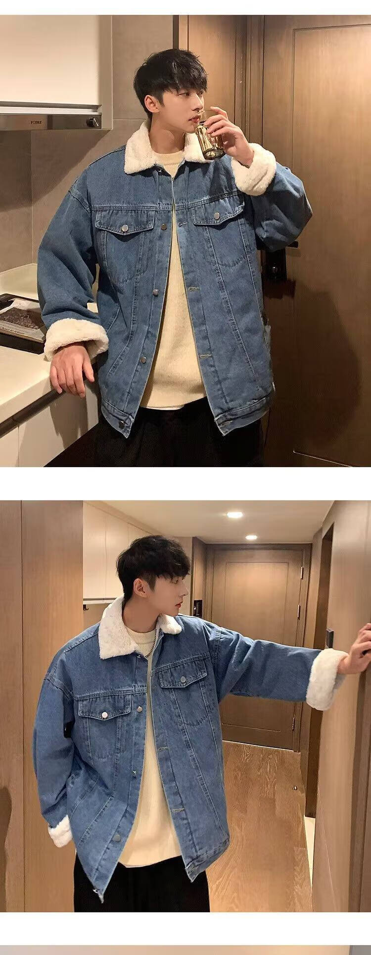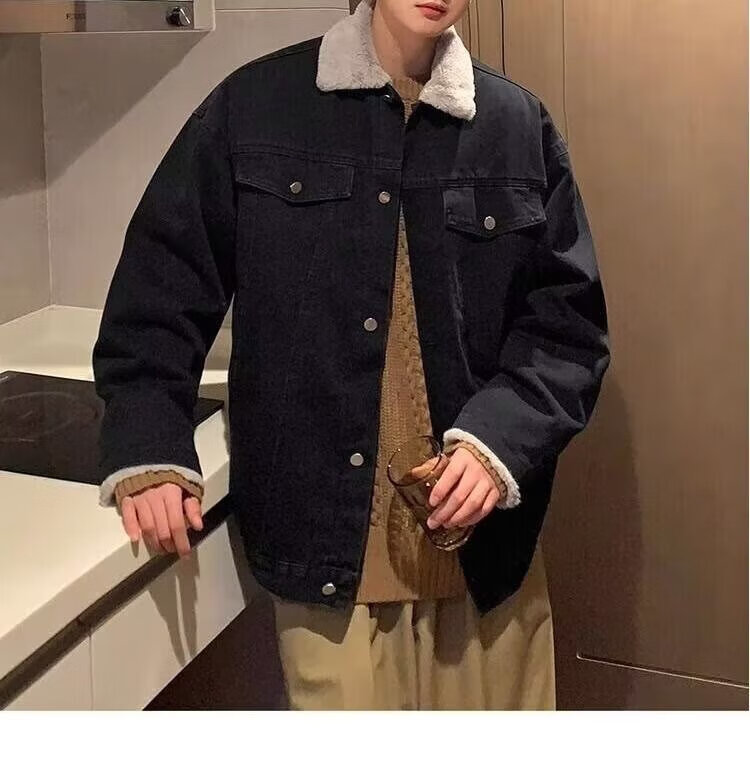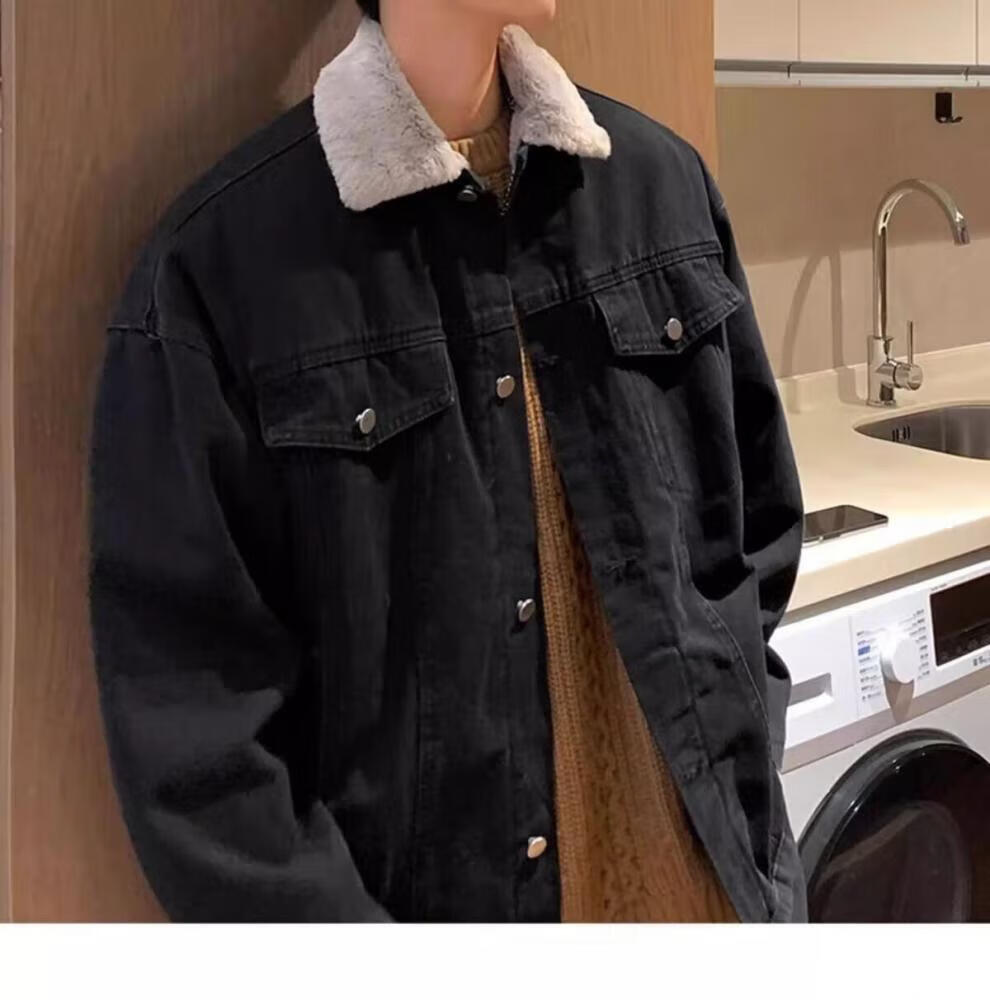 JEEP SPIRIT Autumn and Winter New Loose Lapel Denim Jacket Men's Casual Thickened Polar Fleece Jacket Top Cotton Clothes Upgraded Model 8662S Black L