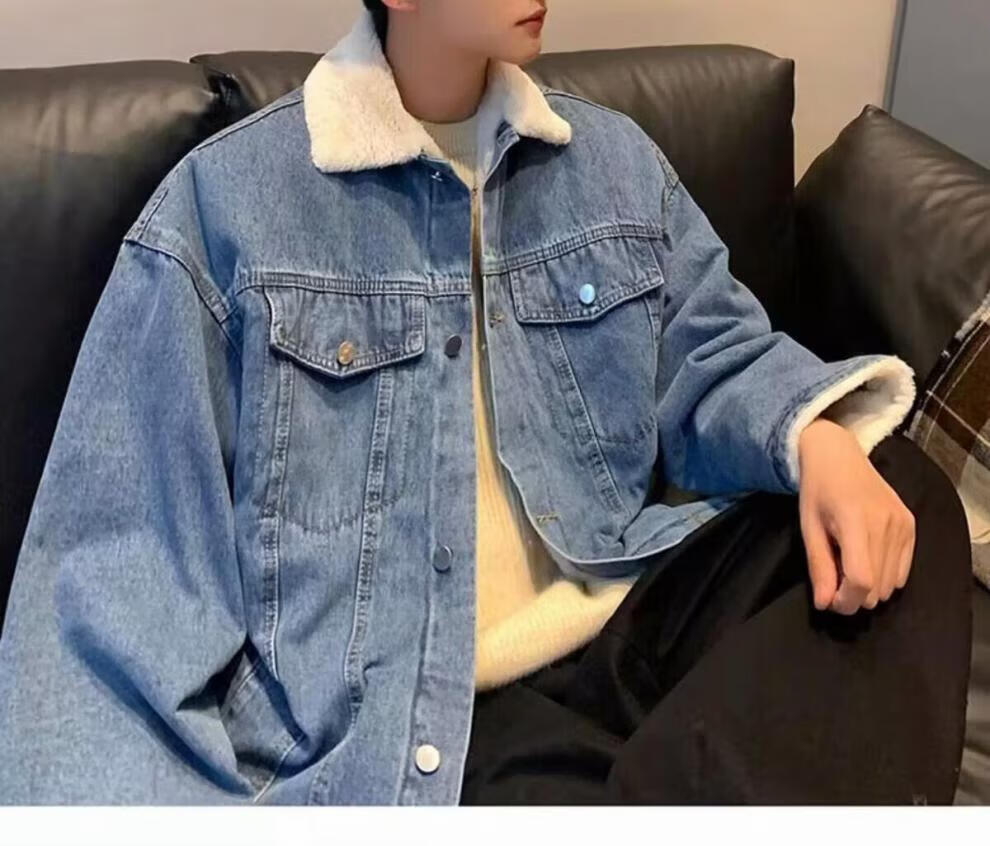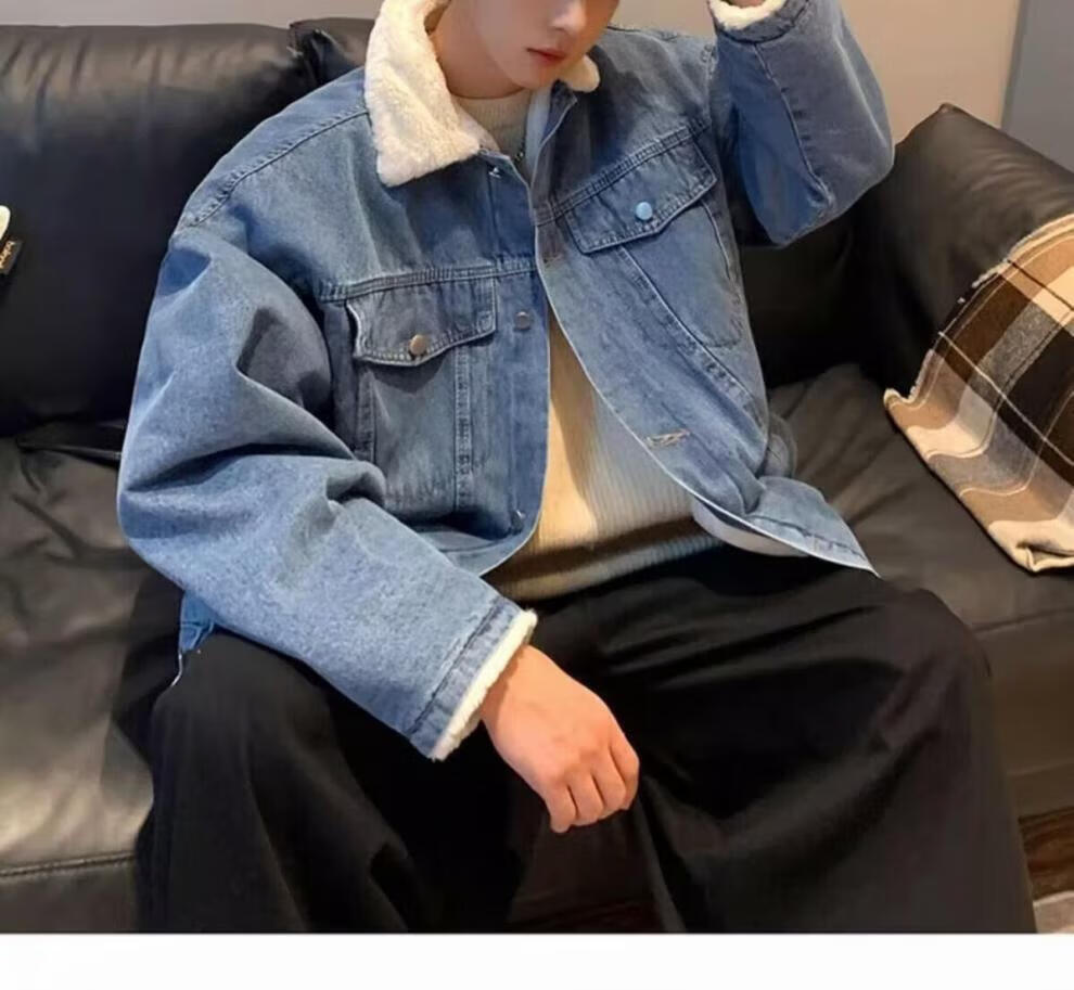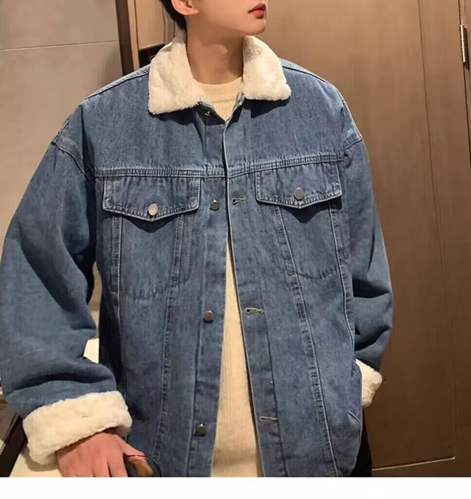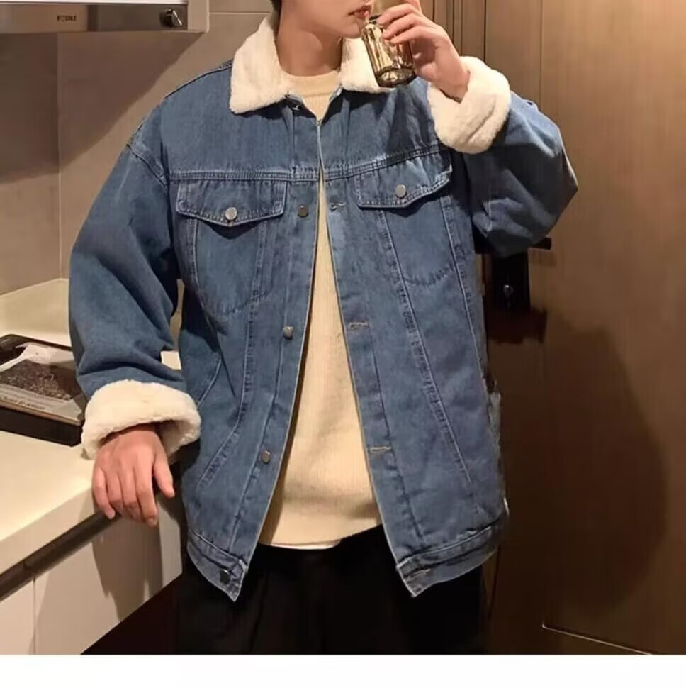 JEEP SPIRIT Autumn and Winter New Loose Lapel Denim Jacket Men's Casual Thickened Polar Fleece Jacket Top Cotton Clothes Upgraded Model 8662S Black L