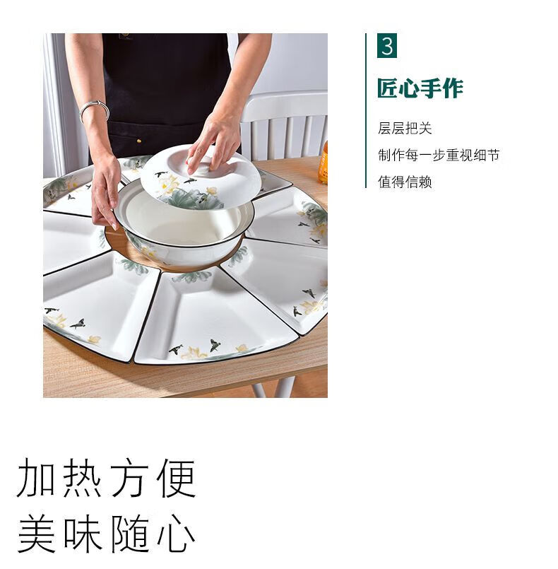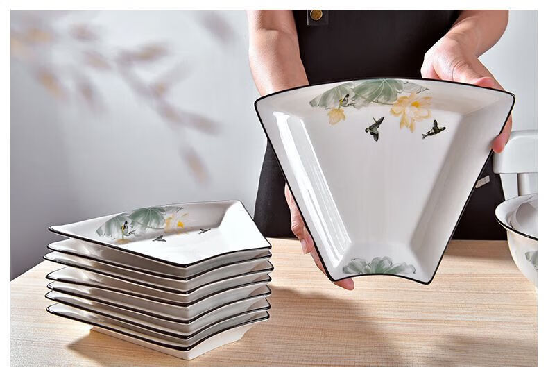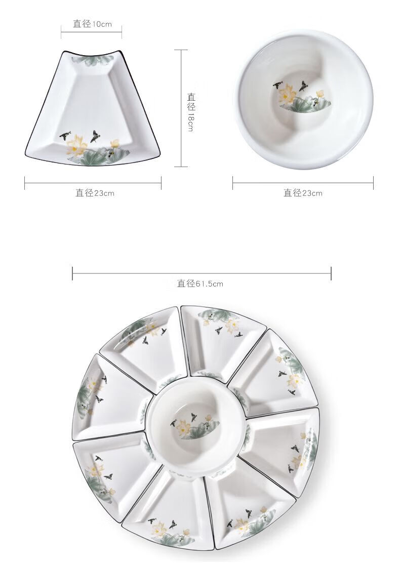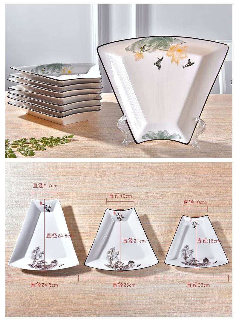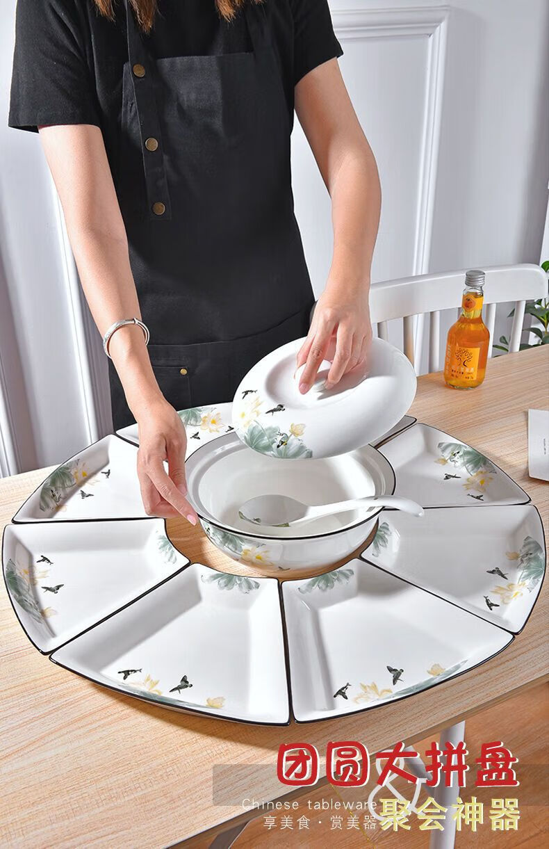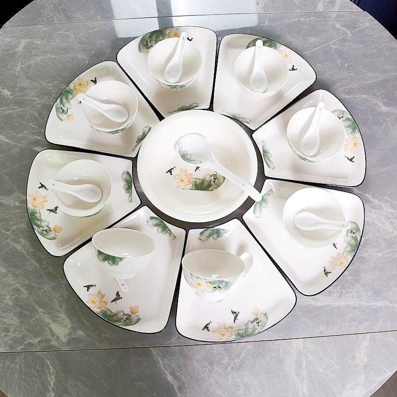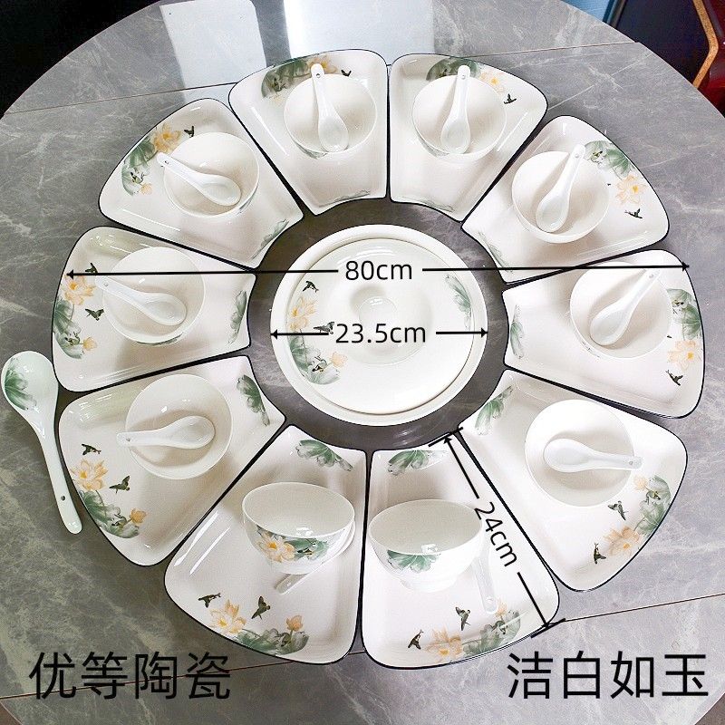 Xiongwochi Ceramics Household Reunion Bowls and Dishes Platter Reunion Dinner Tableware Combination Fan-shaped Dish Plate Creative Set 520 Lotus Nine-piece Uncovered Platter Diameter 60cm