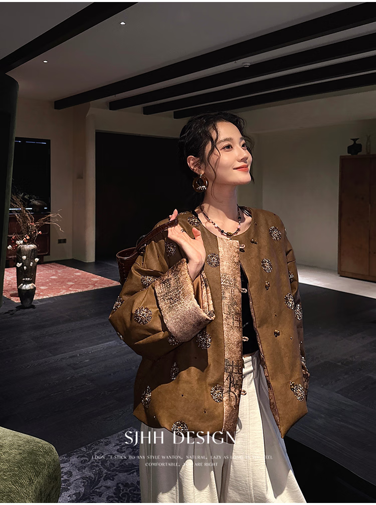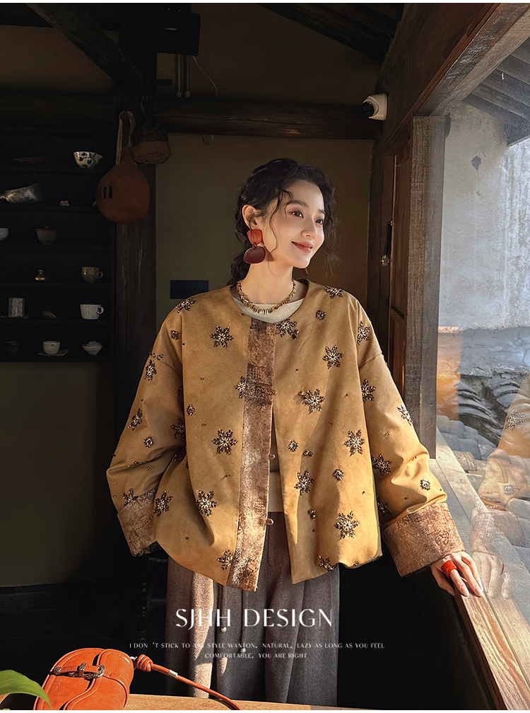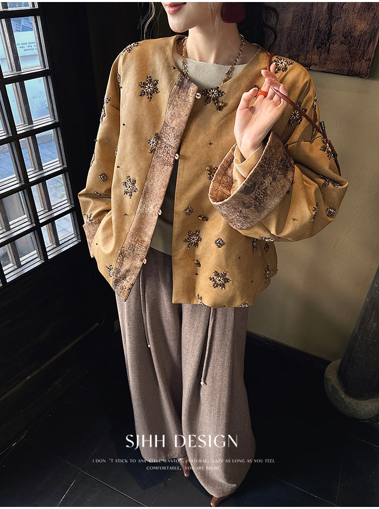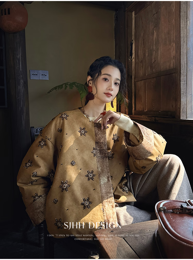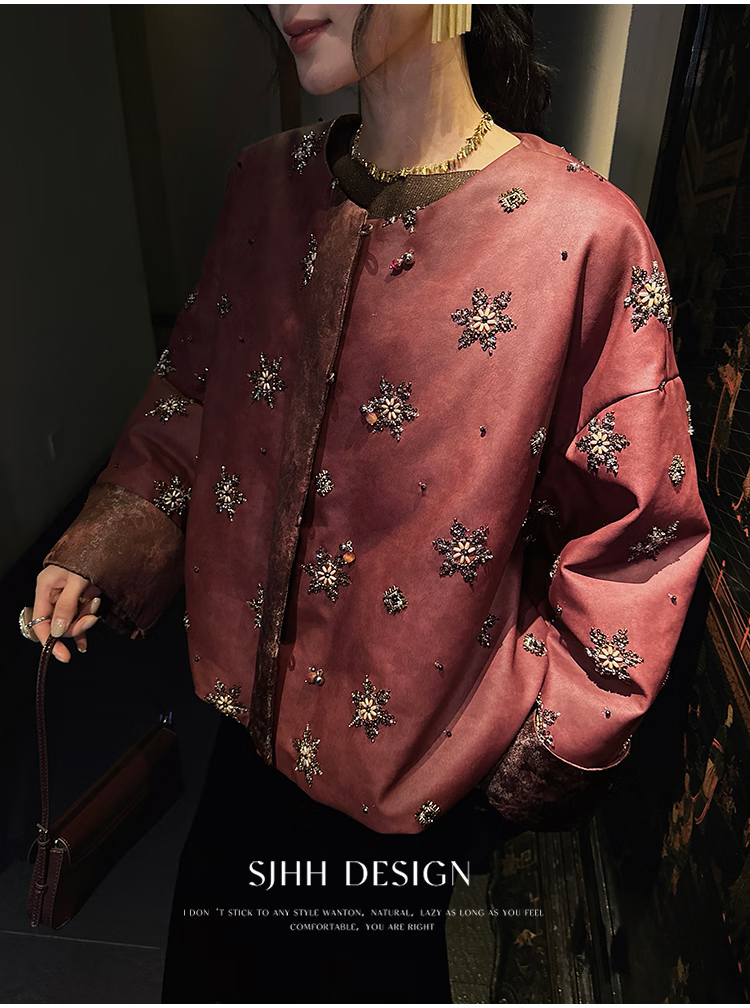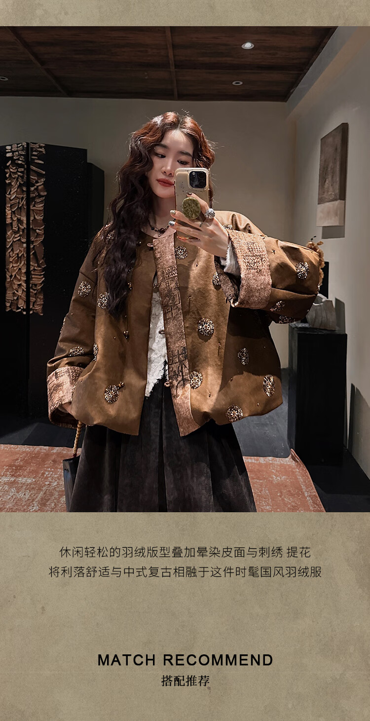 Sanji Black Flower Xin Nian New Chinese Style Short Bead Embroidered Down Jacket Winter Women's Jacket Very Beautiful Winter Clothes Moon White (Snowflake Bead Pattern) S