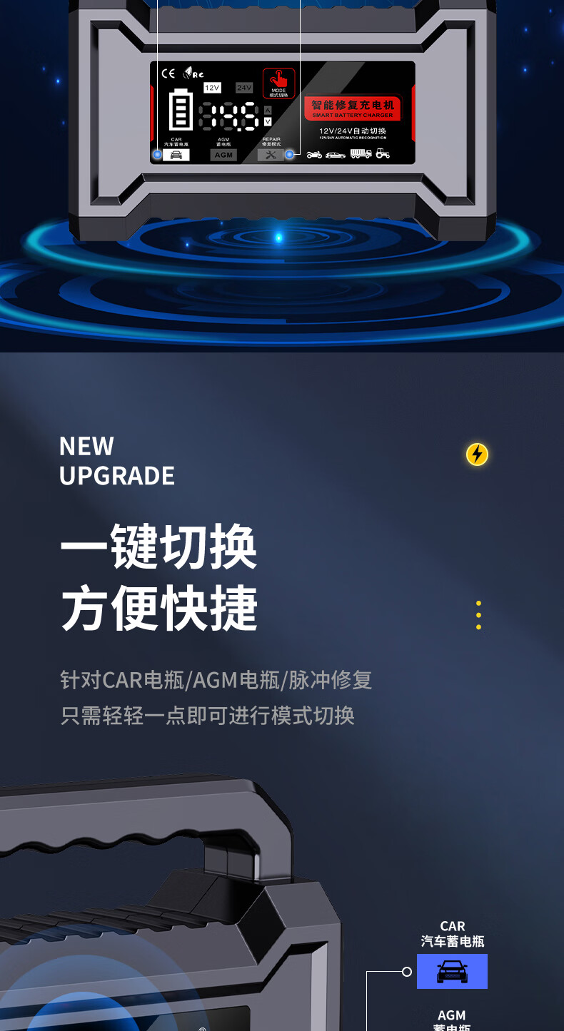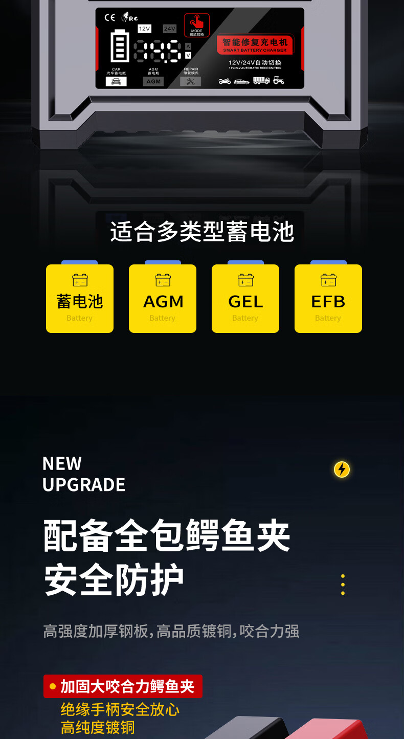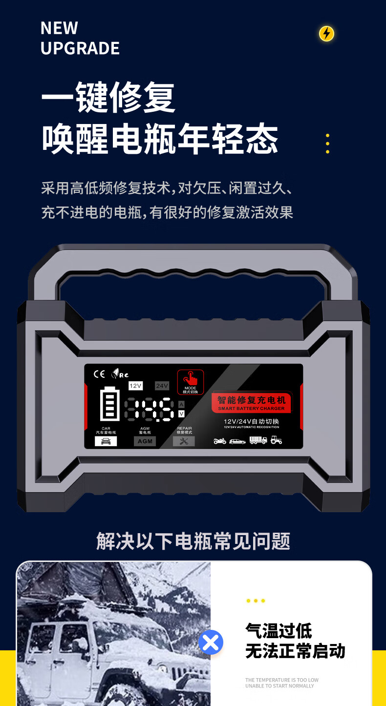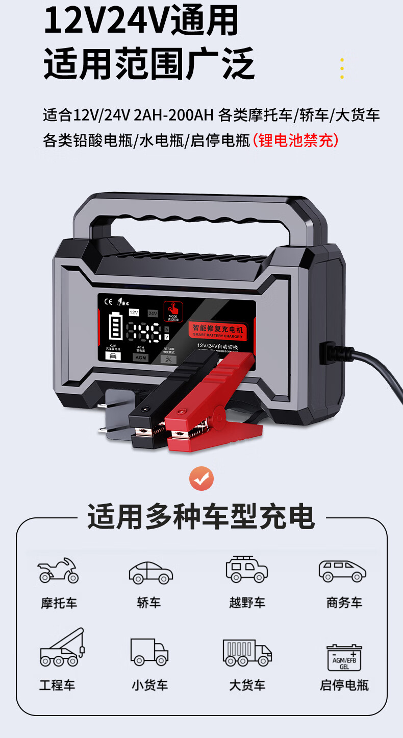 Car battery charger 12v24v universal pure copper fully automatic intelligent repair all-in-one machine fast full charge self-stop LED large screen display 200% improvement pulse repair + rapid activation
