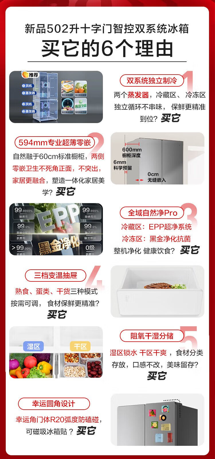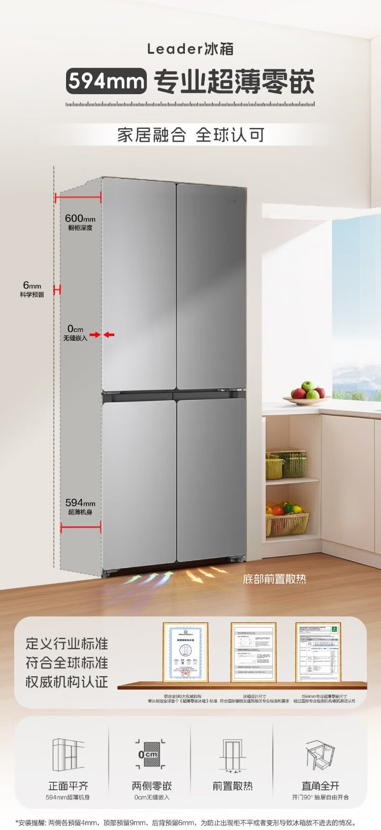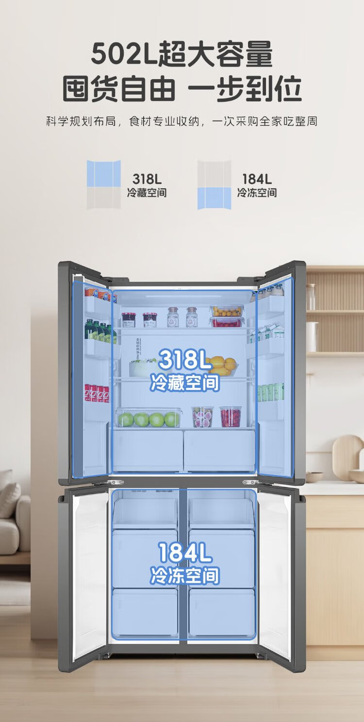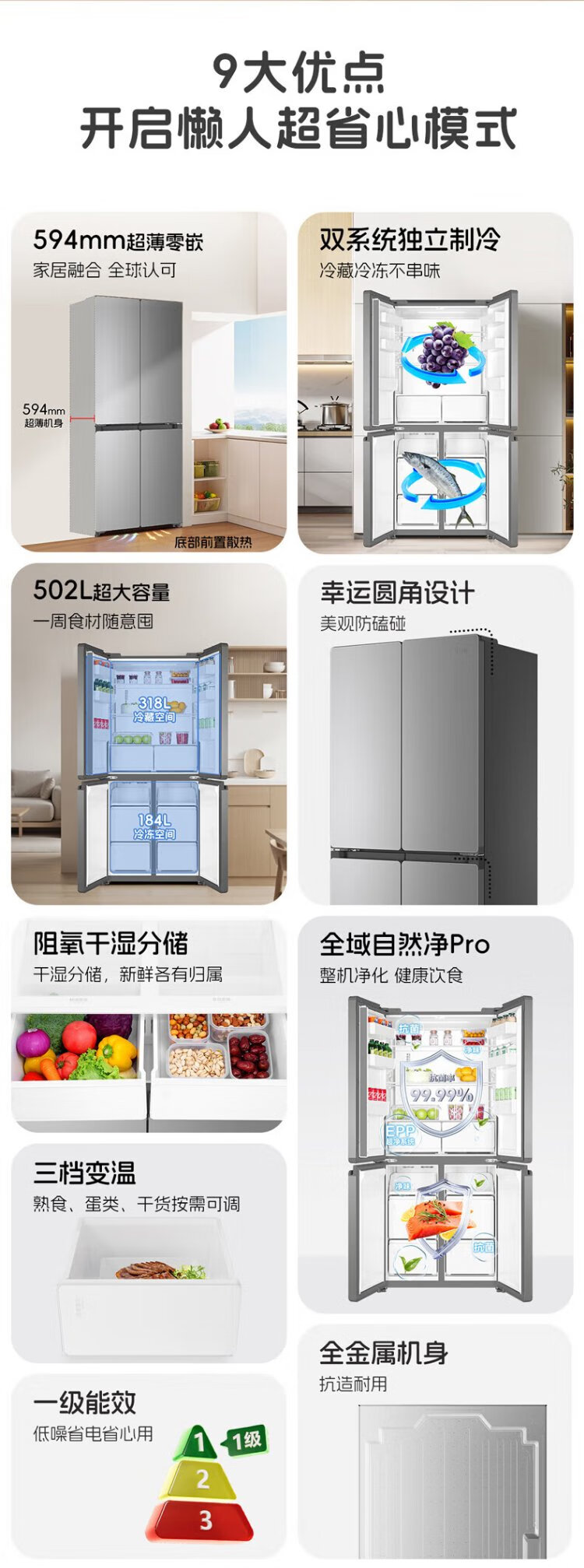 Haier Refrigerator produces 521 Commander dual-system dual-cycle ultra-thin zero-embedded 60cm household 502L four-open cross-door first-class dual-frequency EPP ultra-clean refrigerator with dual systems and no odor. 502L ultra-thin zero-embedded + full-area sterilization and purification + dual systems without odor