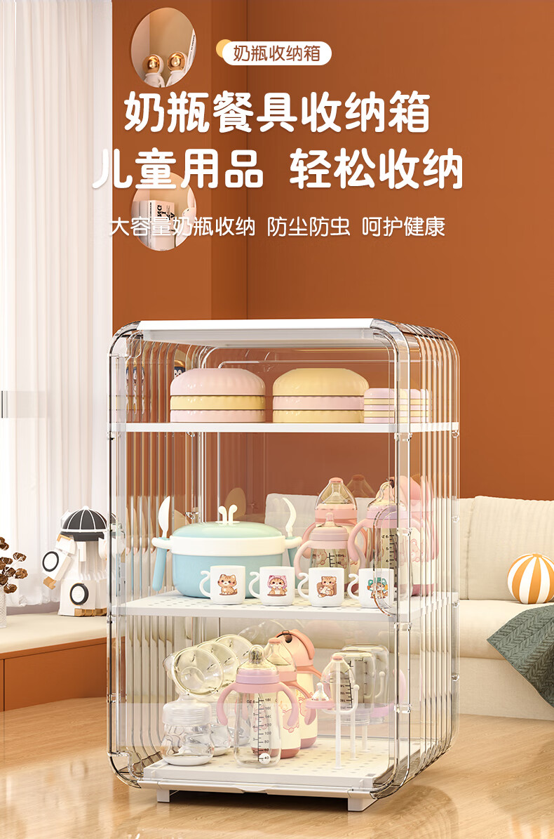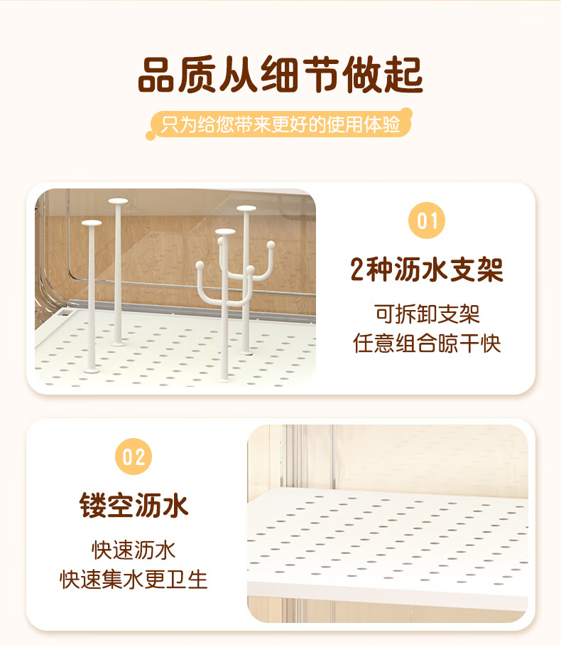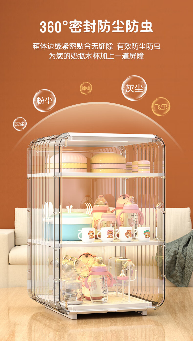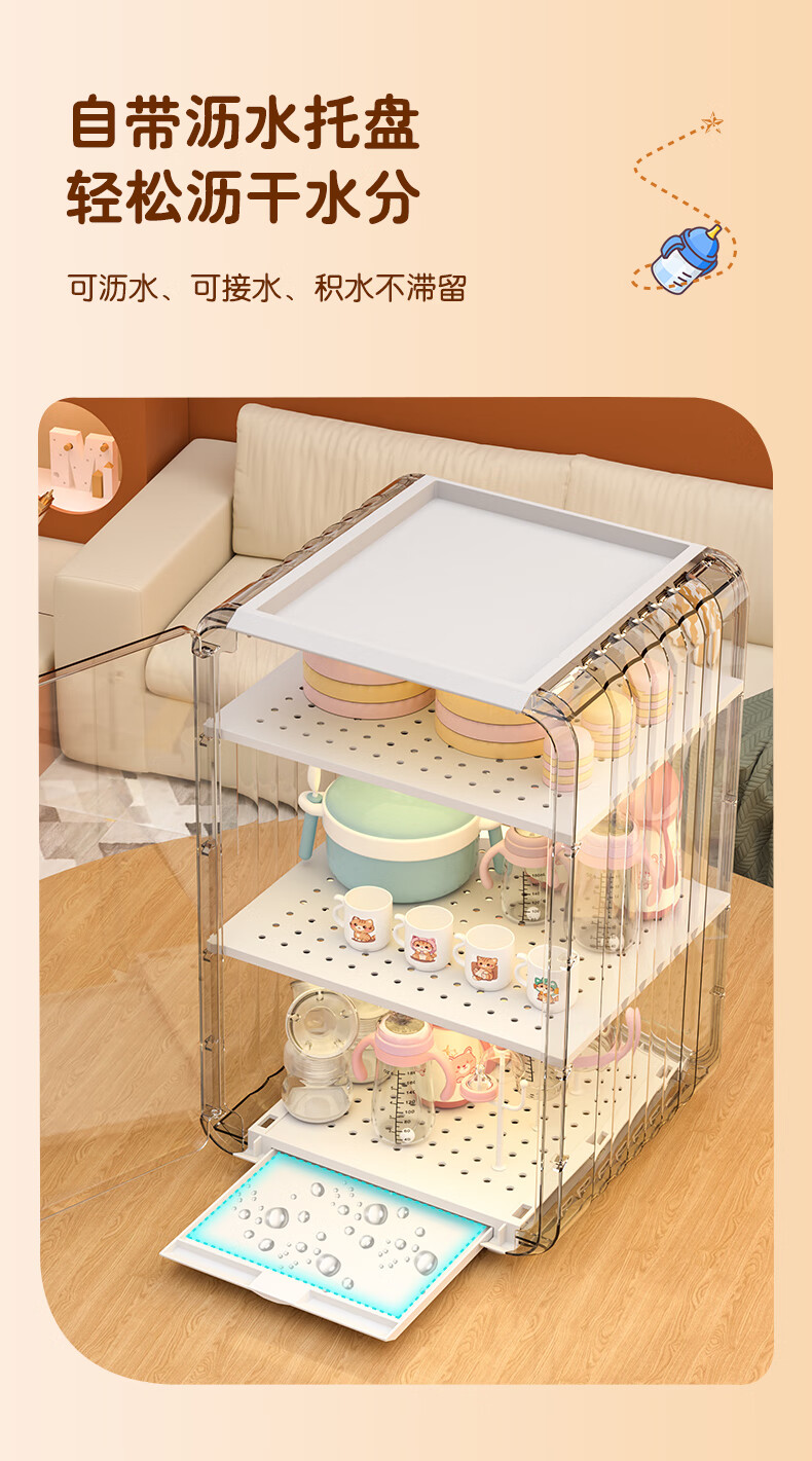 Midele milk bottle storage box, baby tableware storage box, non-staple food tools, breast pump storage, baby-specific dust-proof and drainable, high model, 3 layers, Aisha White, drain stand + drawer-type drain tray, free hook