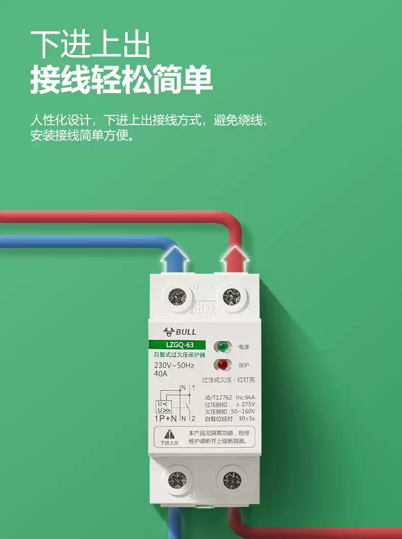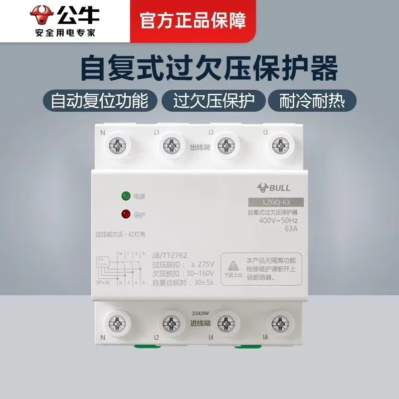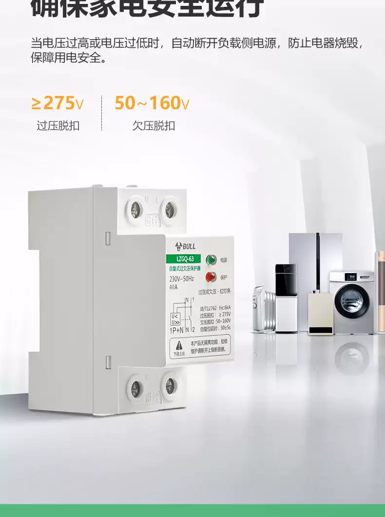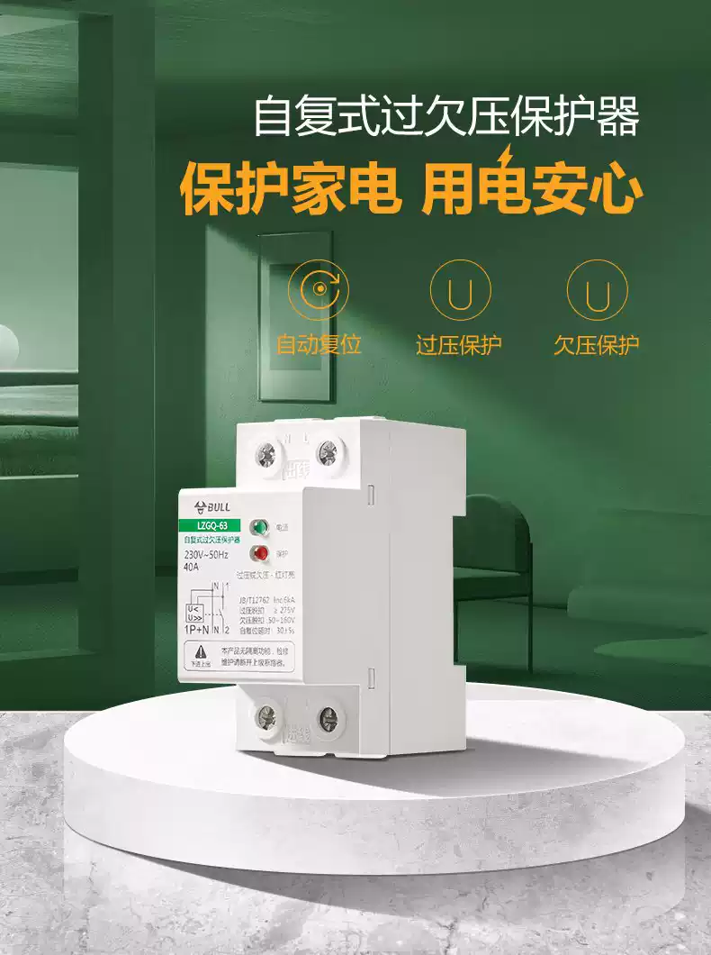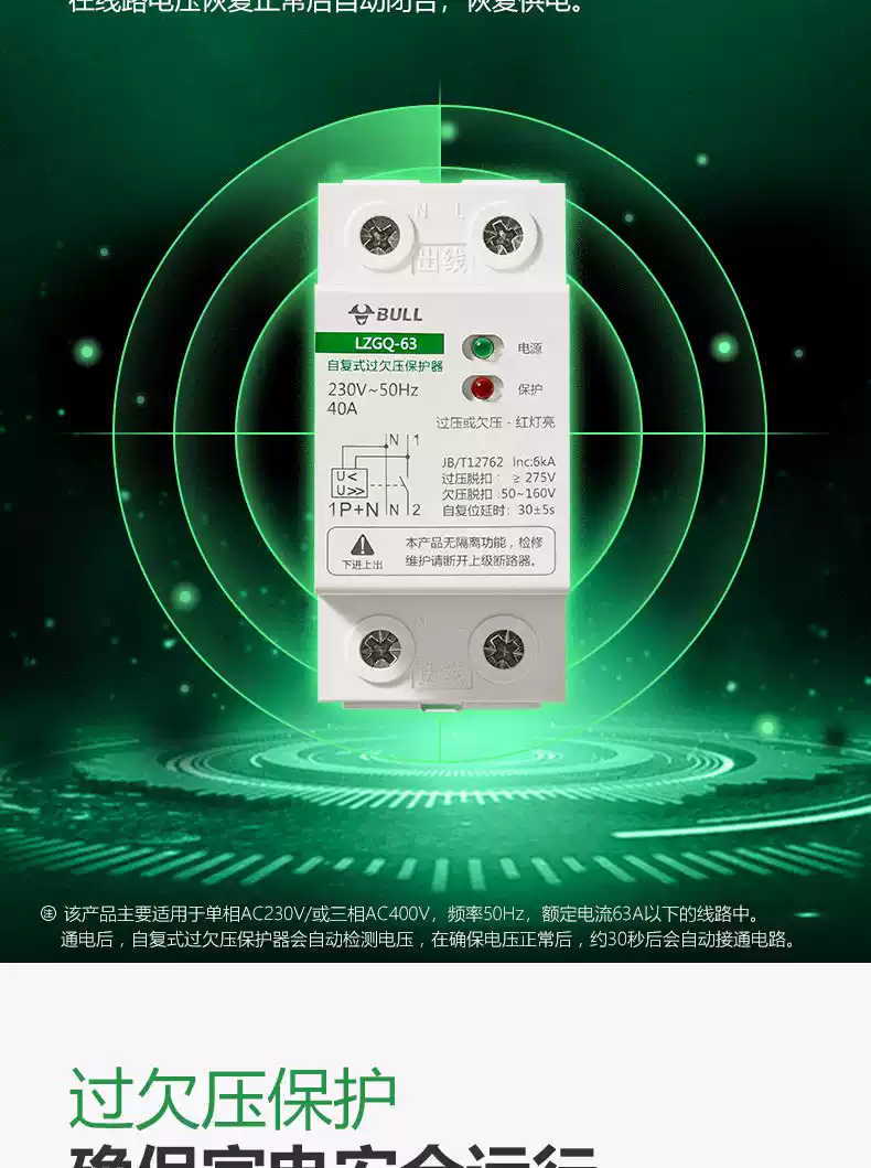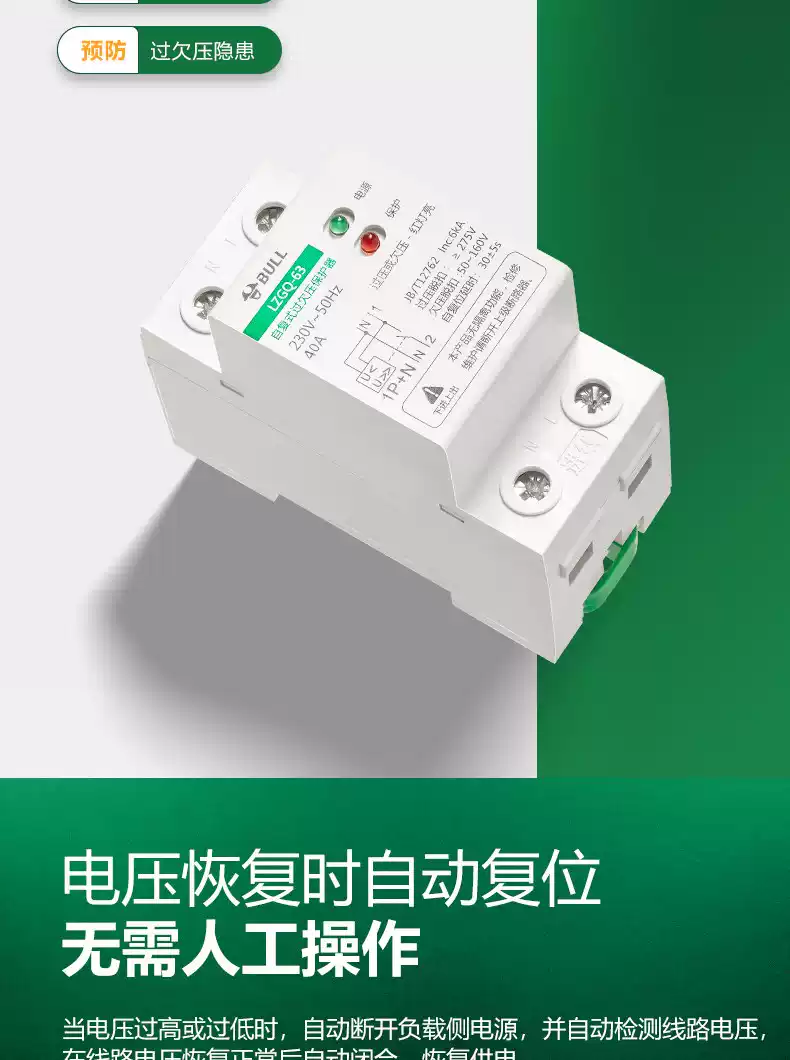 Bull self-resetting overvoltage and undervoltage protector LZGQ-63 tripper automatic reset 63A household 220V rail upper incoming line 40A 1P+N