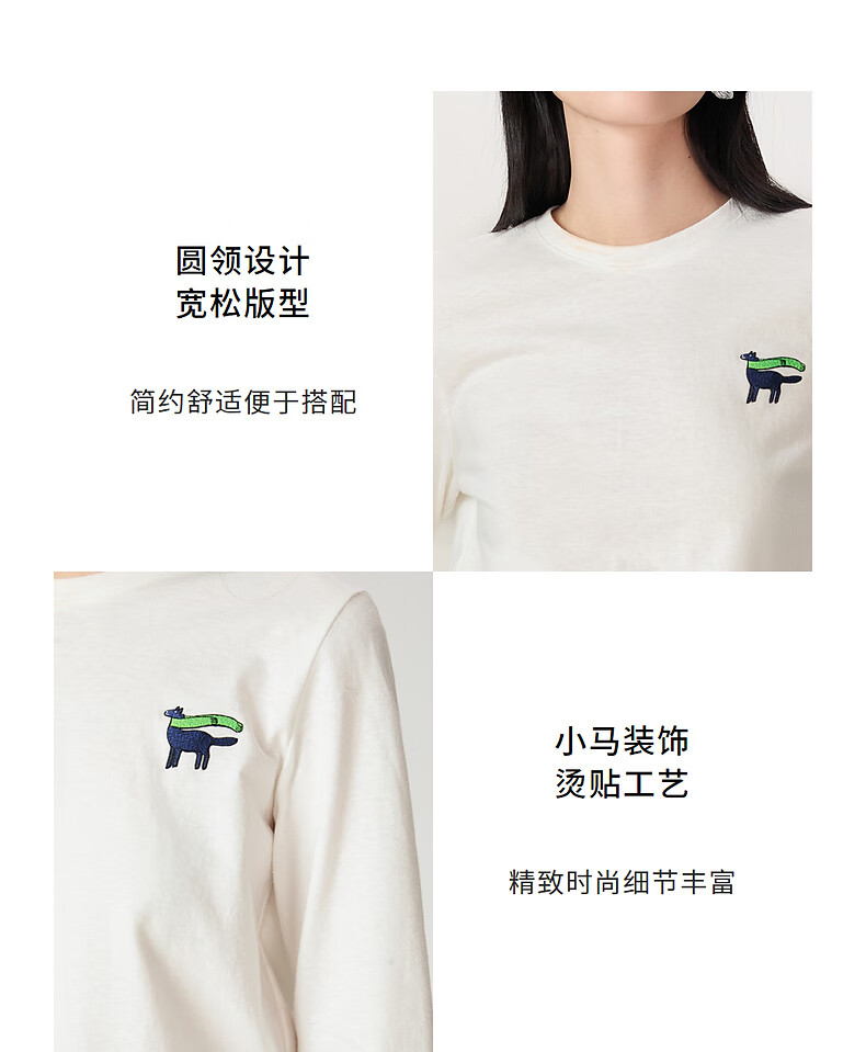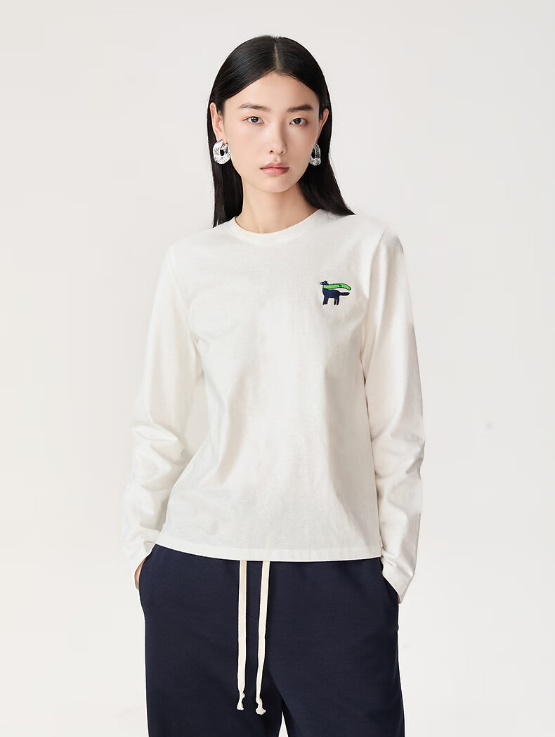 LANCY/LANCY Horse Stepping on the Spring Breeze 2026 Spring New Cotton and Linen Simple Versatile Round Neck Long Sleeve Short T-shirt for Women White M