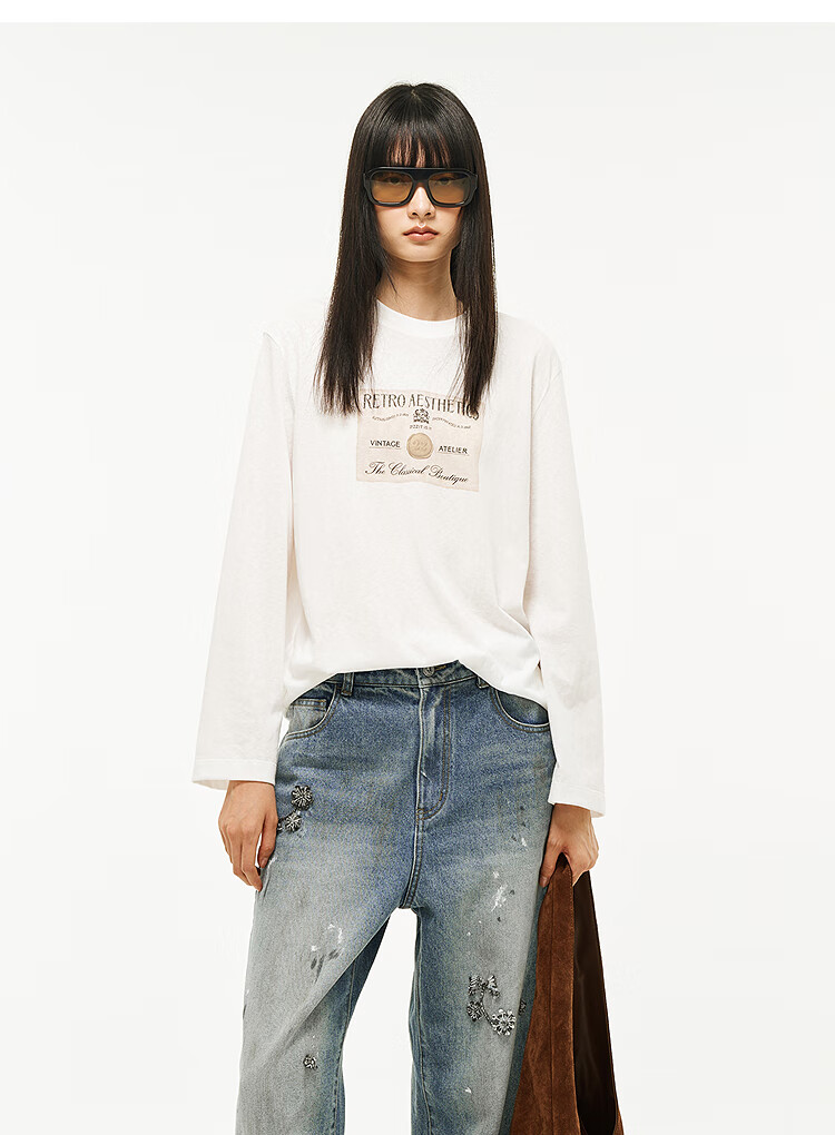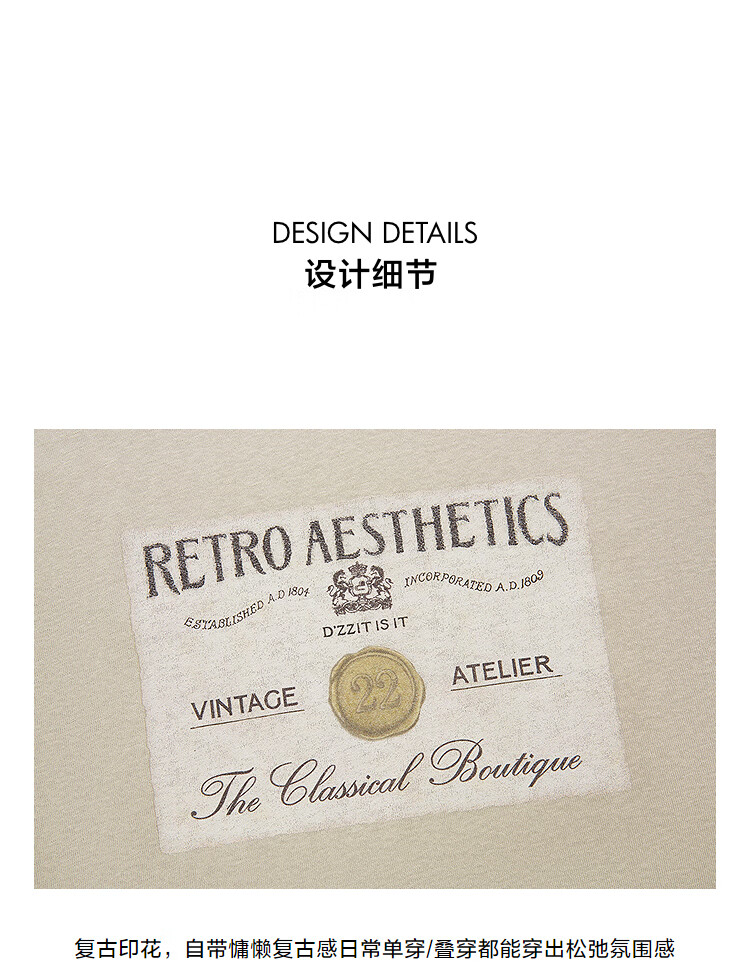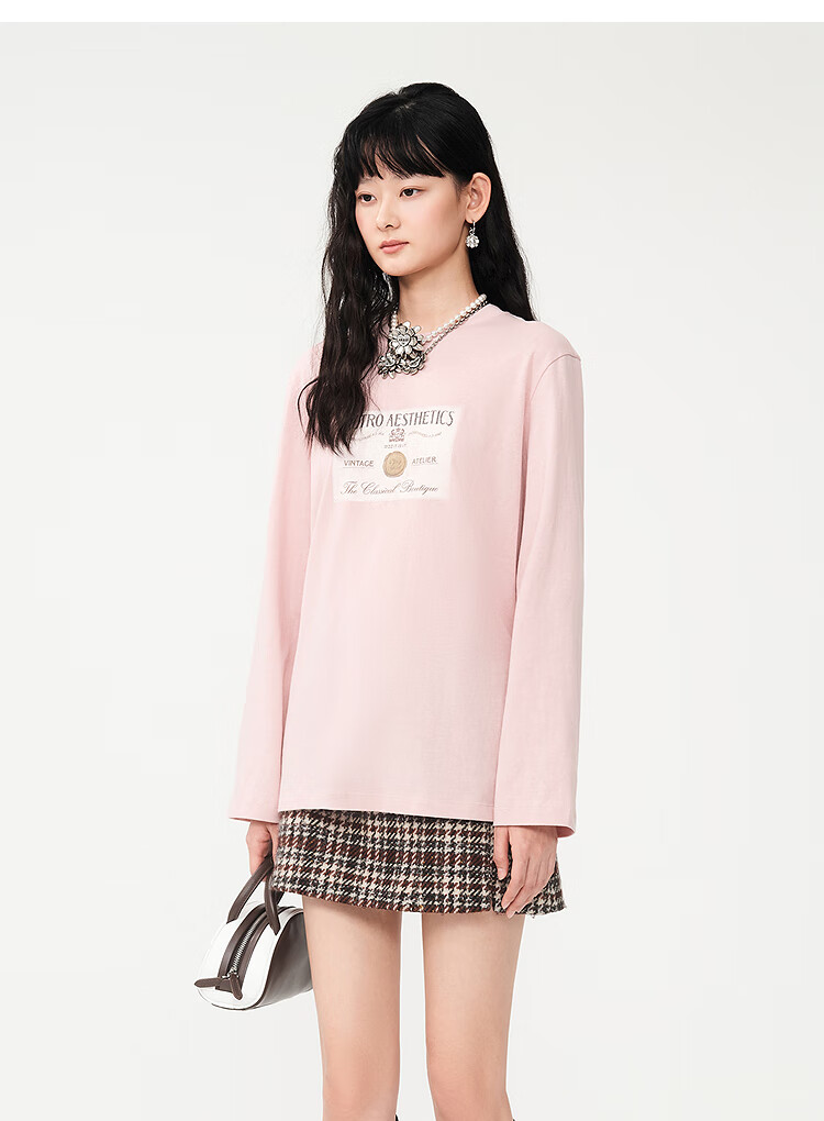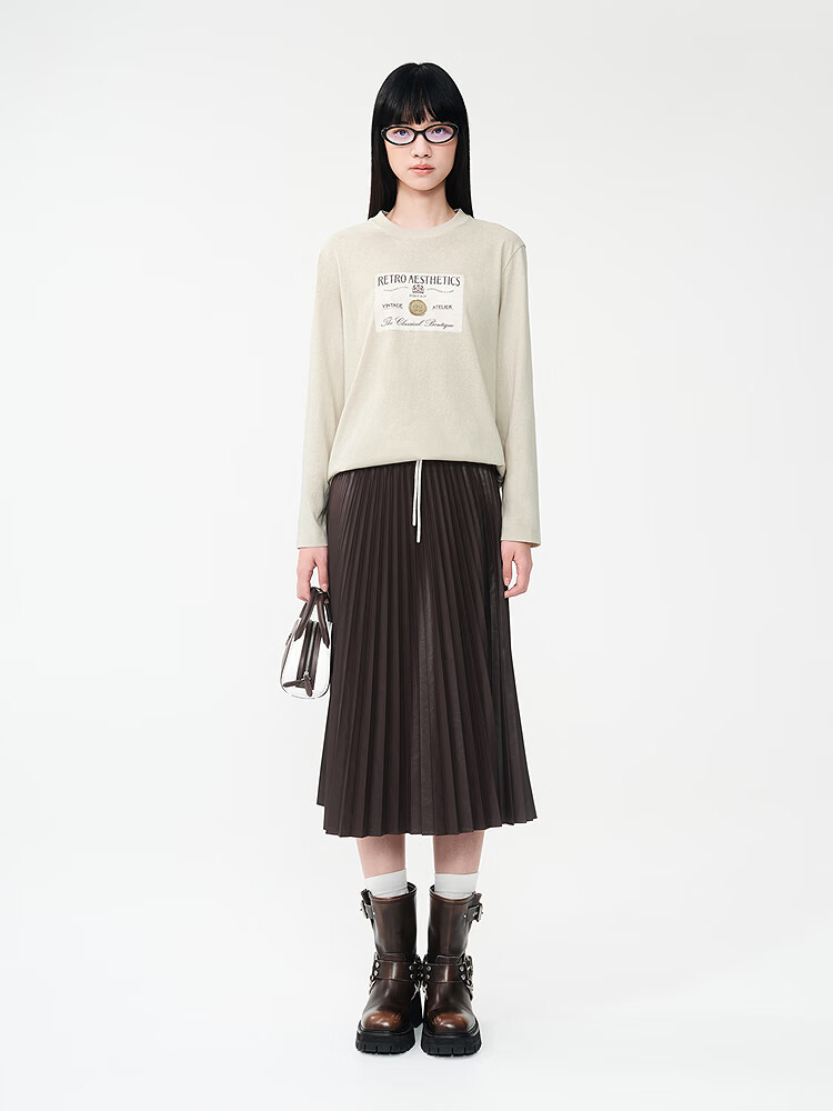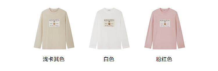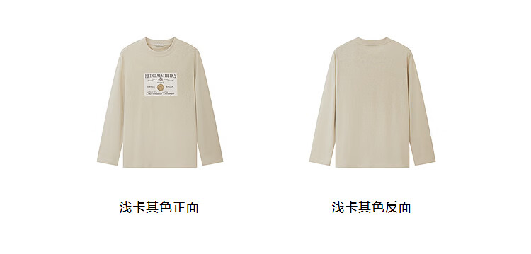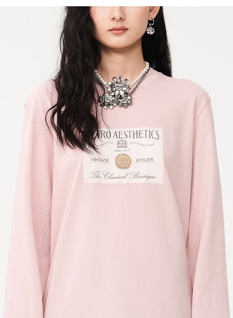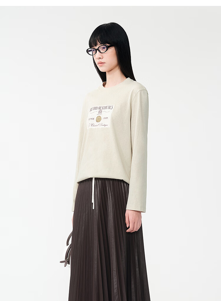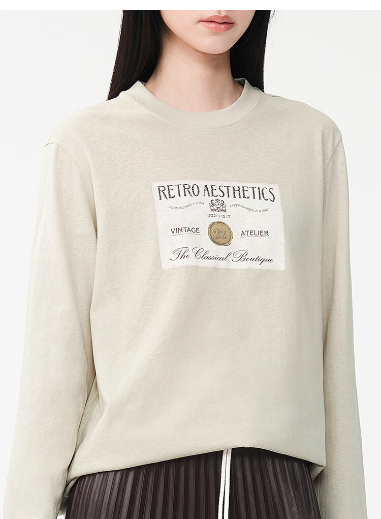 DZZIT long-sleeved T-shirt 2026 spring new style simple retro printed round neck loose top for women 3K1BA079J light khaki XS
