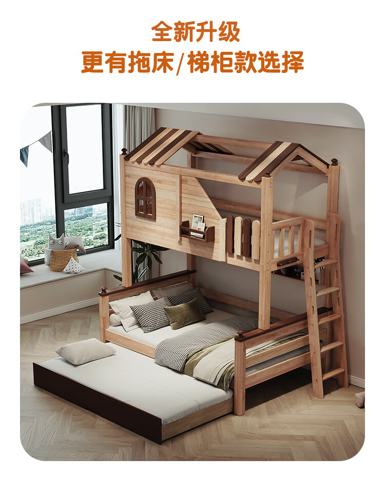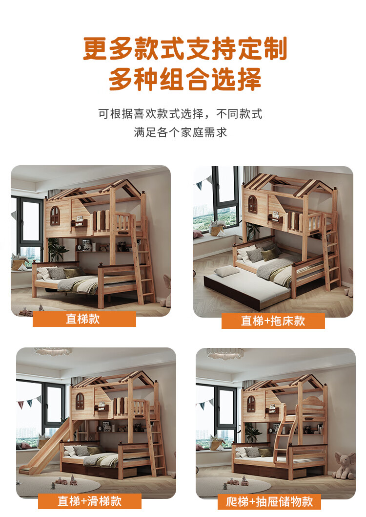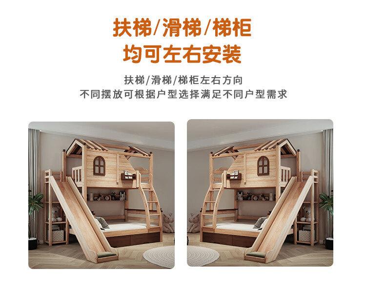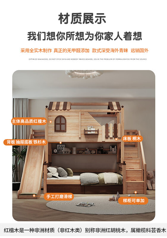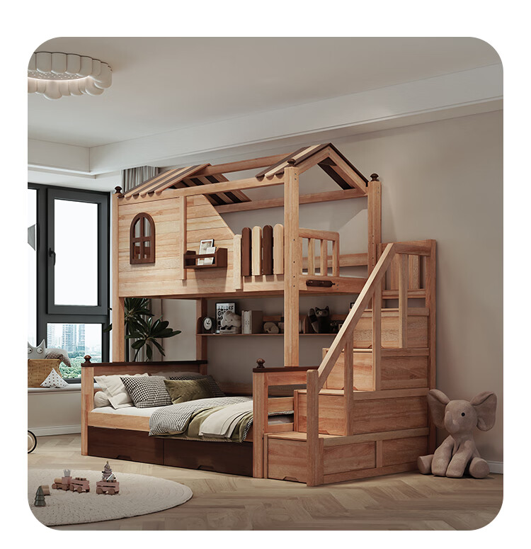 Children's solid wood high and low bed with slide and ladder cabinet, customized tree house bed and lower bed, red sandalwood, all solid wood storage, tree house upper and lower bed + ladder 1350mm*2000mm