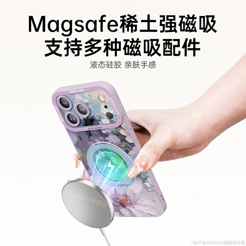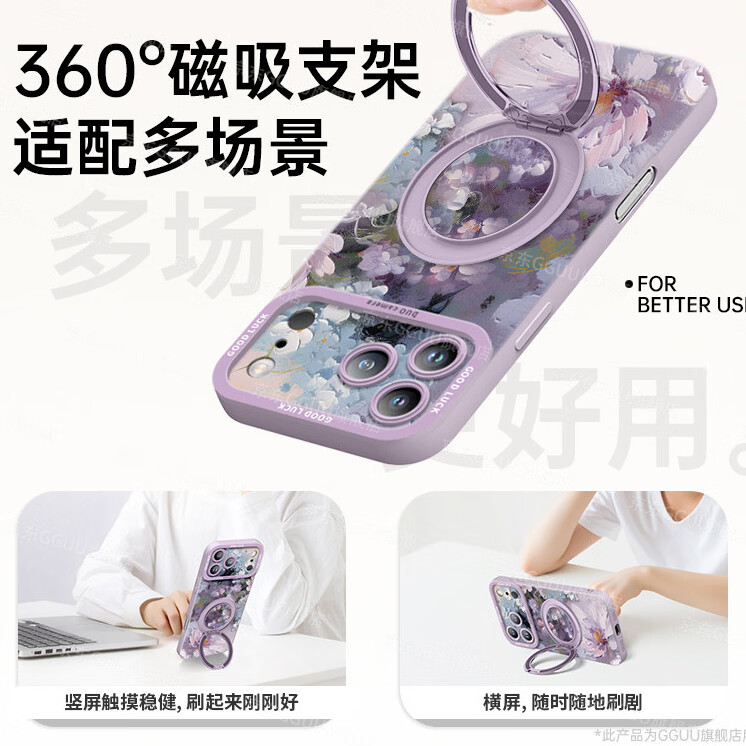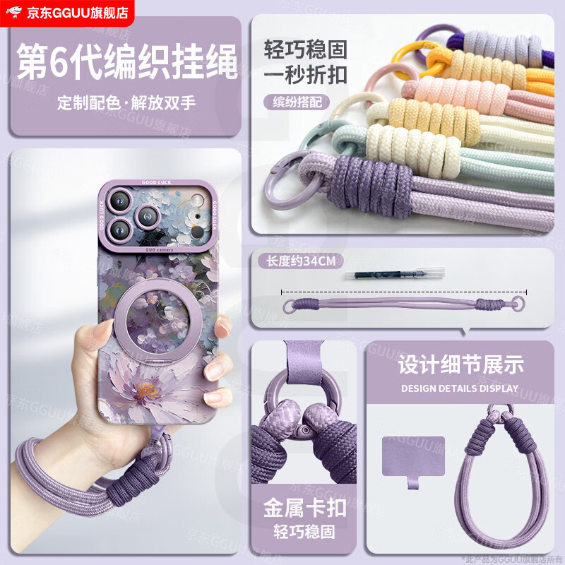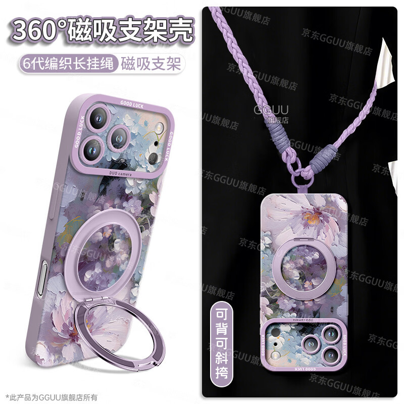 GGUUMagsafe magnetic suction suitable for Apple 17promax mobile phone case iPhone17 protective cover 17pro crossbody air new 16 stand liquid silicone 15 women's 14 lanyard Grass Purple - Brilliant Flowers Magnetic Suction Stand + Long Lanyard iPhone17