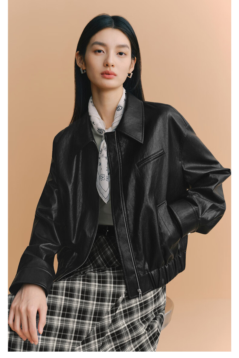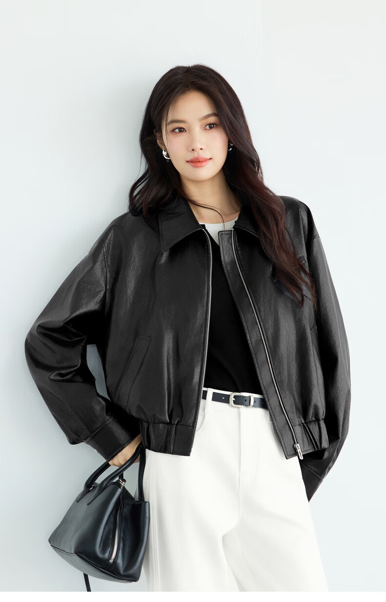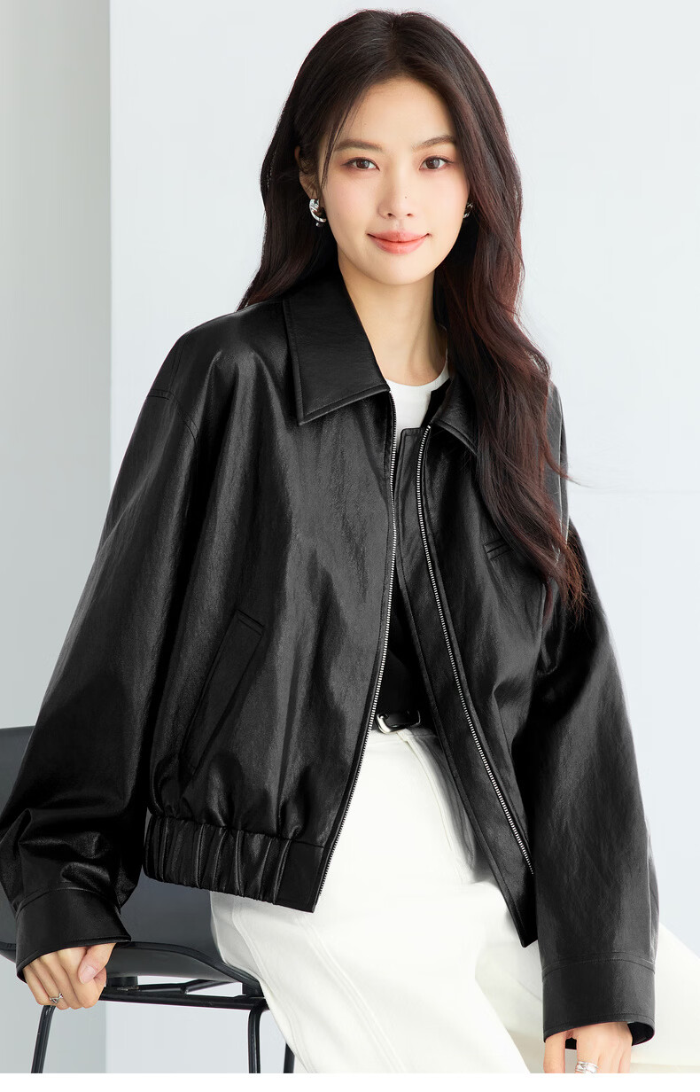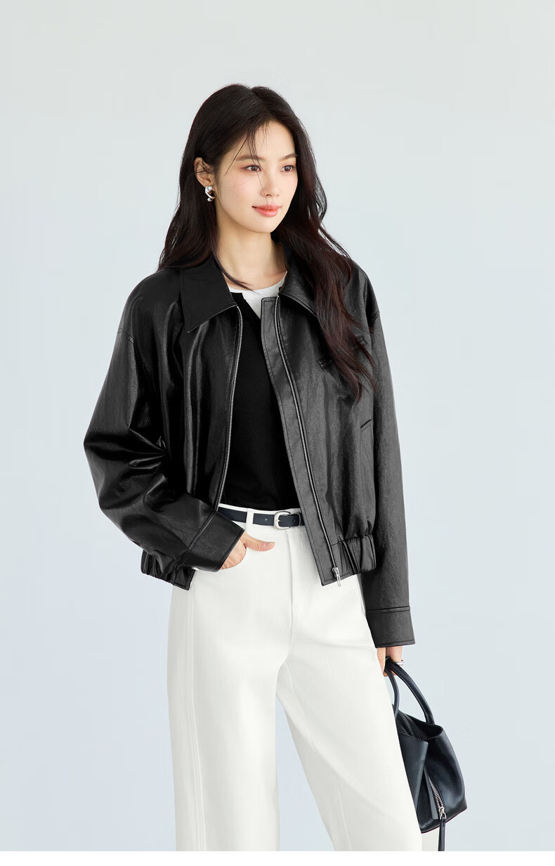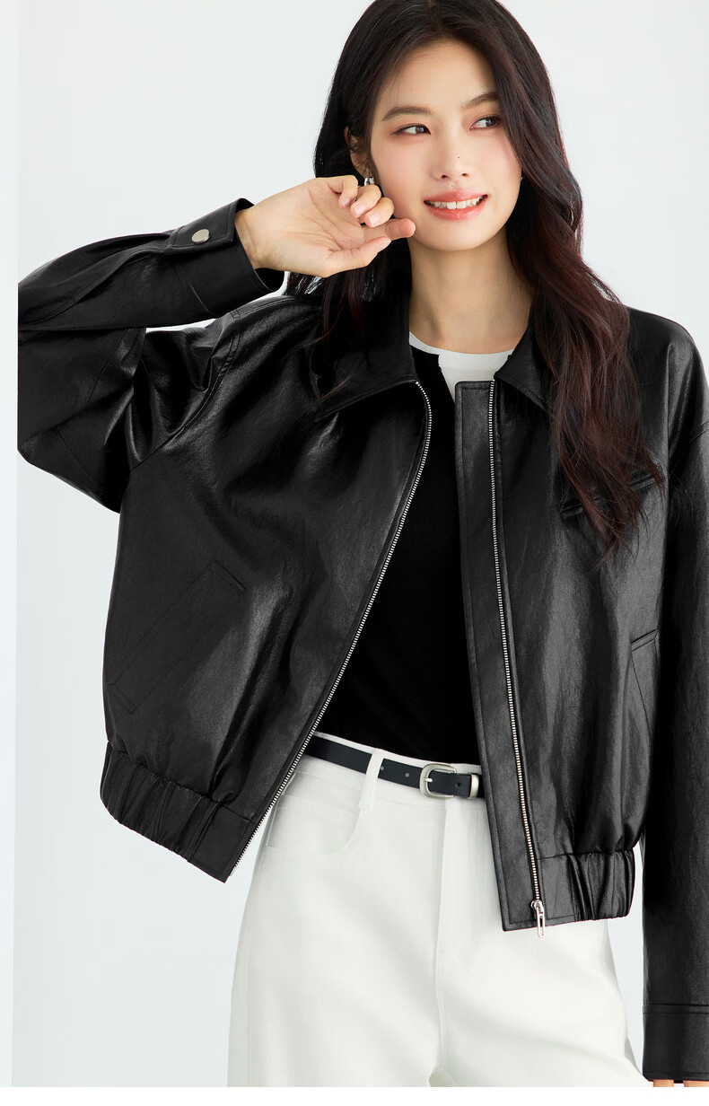Eveli (eifini) Eveli silhouette short lapel leather jacket 2026 spring new fashionable casual handsome jacket for women black M 105-115 catties