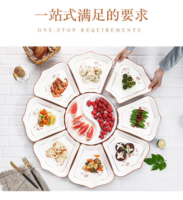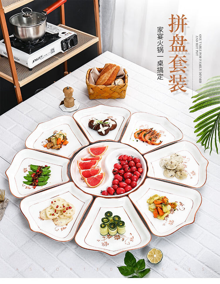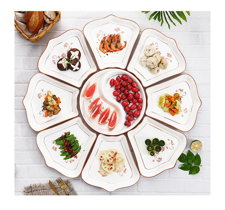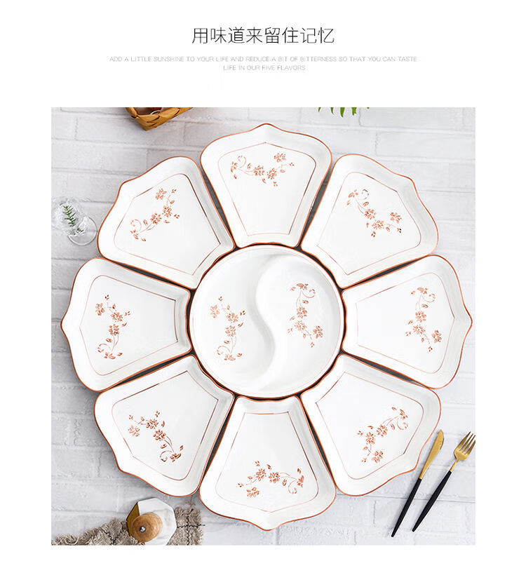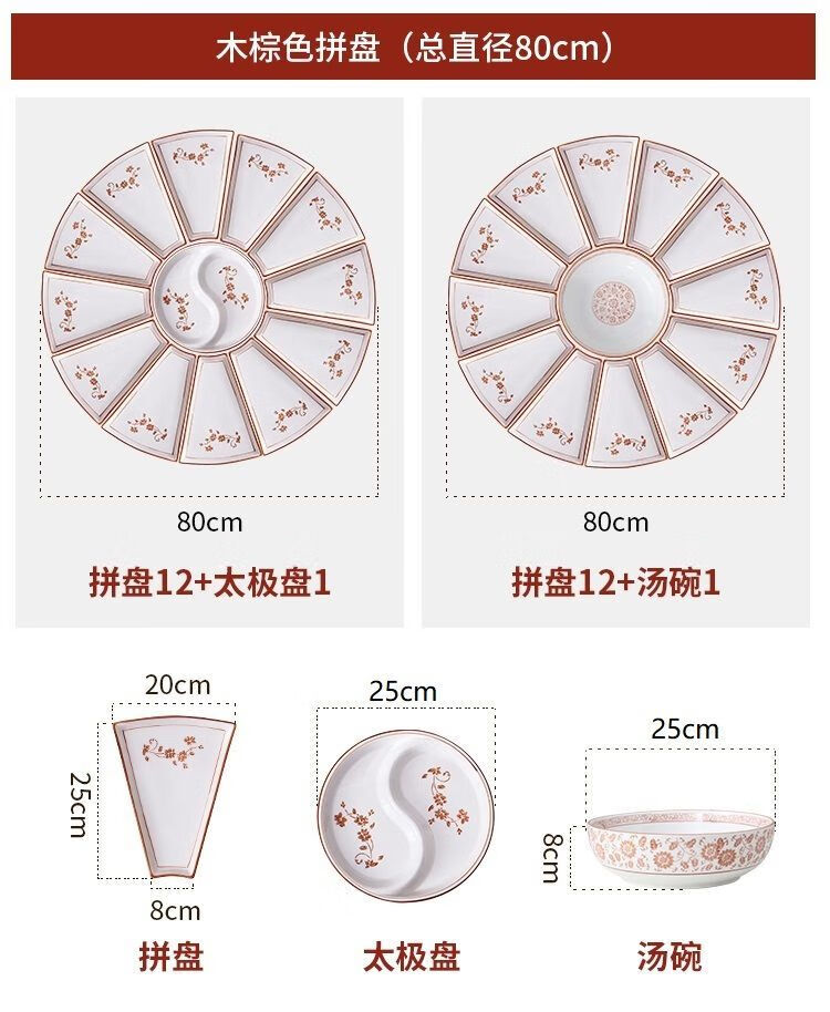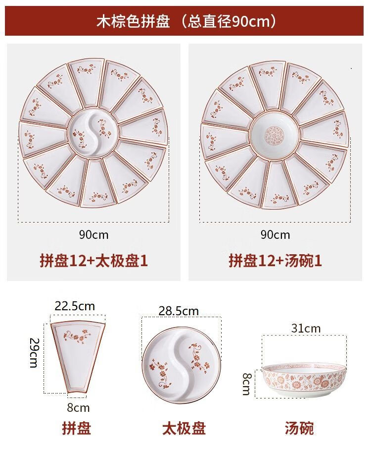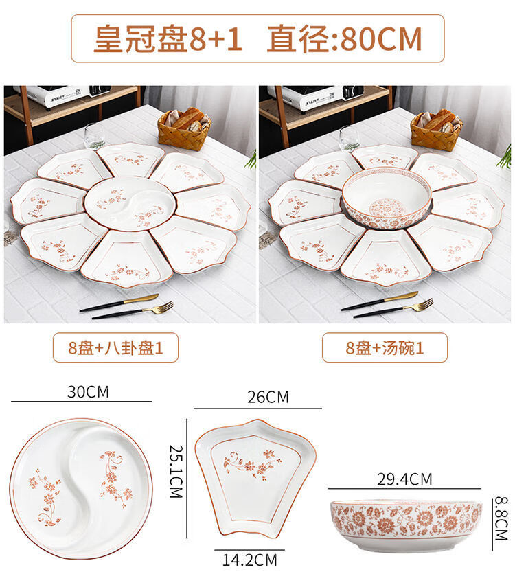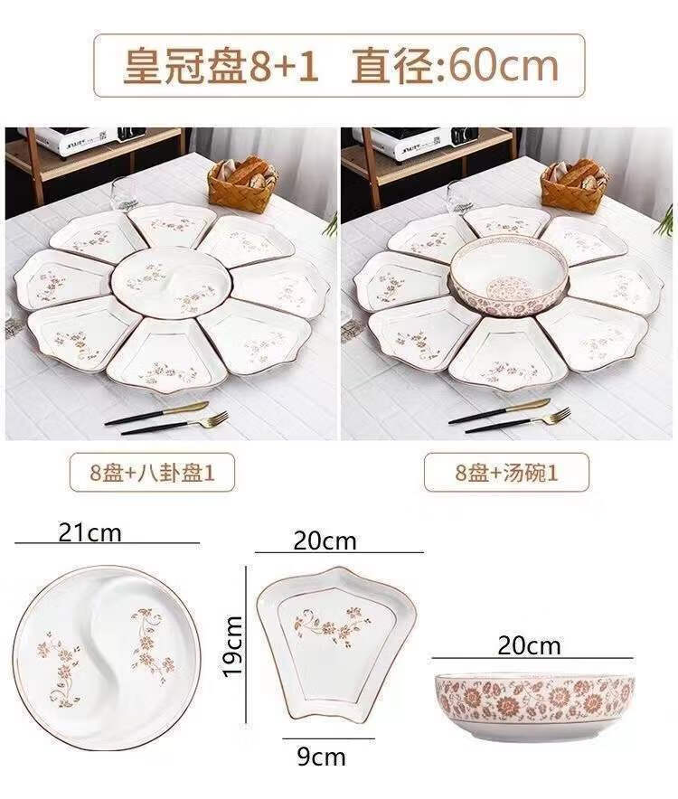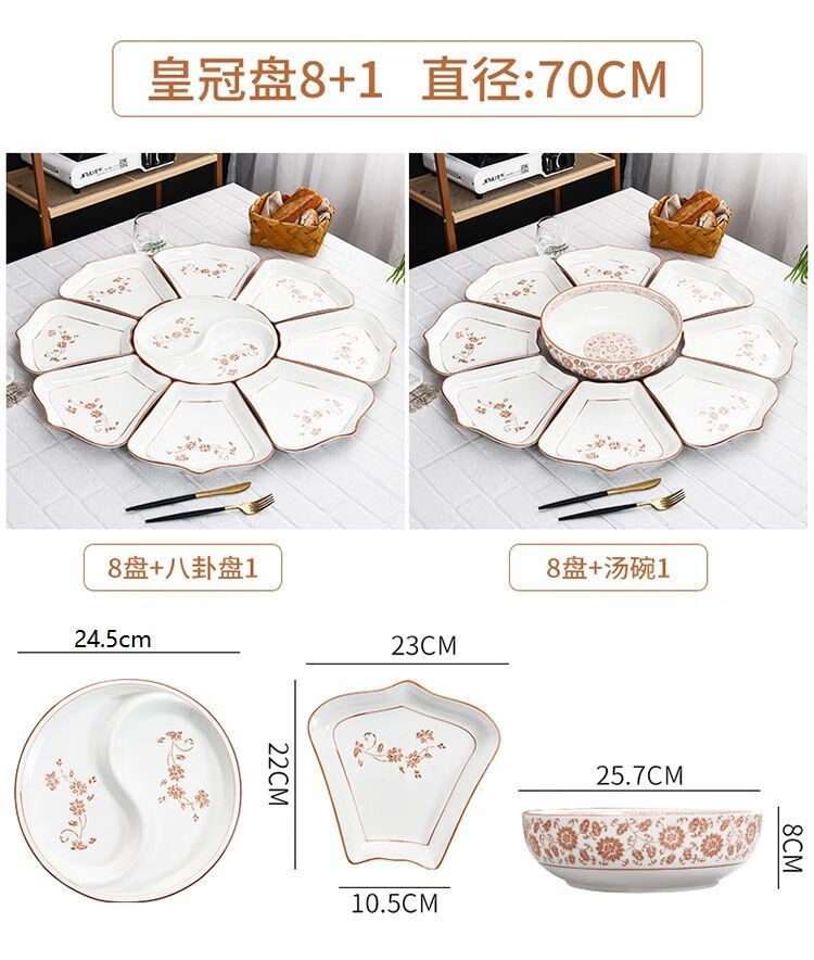 Hualeji Plate Set Platter 10 Plate Dinner Plate Round Table Reunion Plate Dinner Plate Set Household Tableware Brown Flower Shape 60cm 8 Plates + Tai Chi Plate
