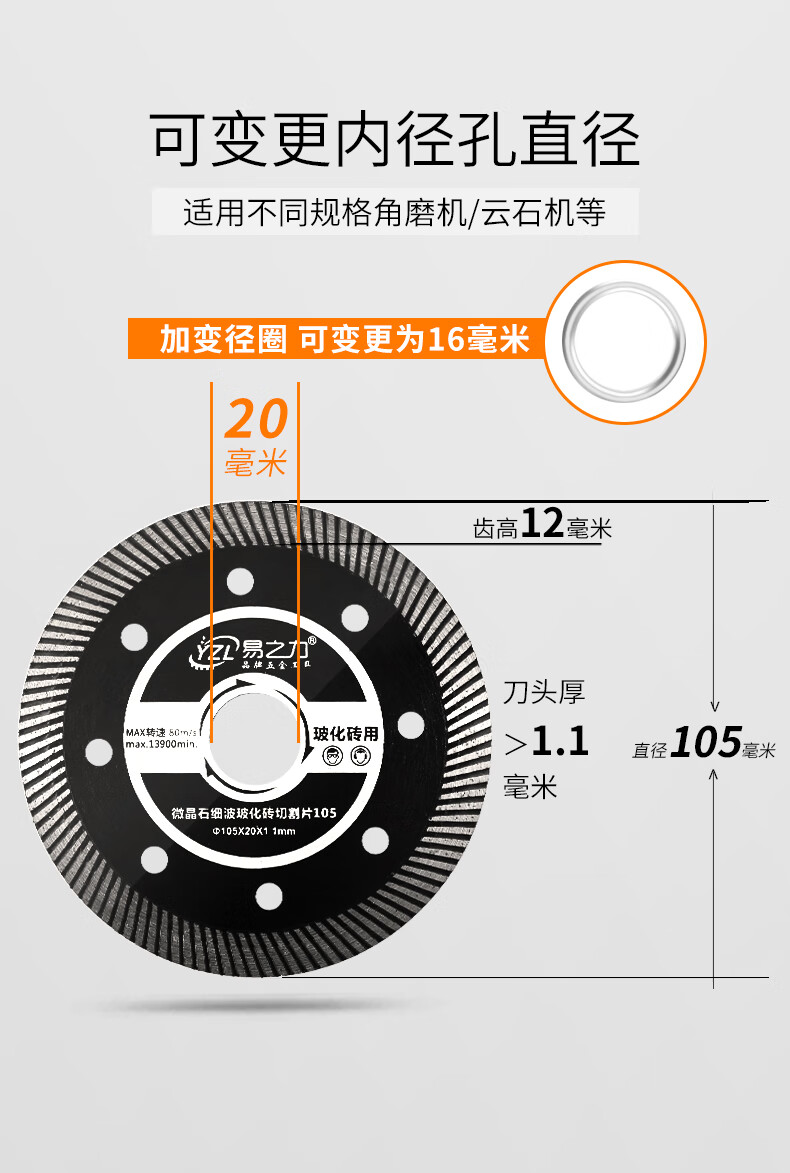 Huili's ceramic tile cutting blade dry cutting non-collapsing stone concrete saw blade masonry cutting blade cutting machine comes with 2 pieces of reducing ring ceramic tile cutting blades