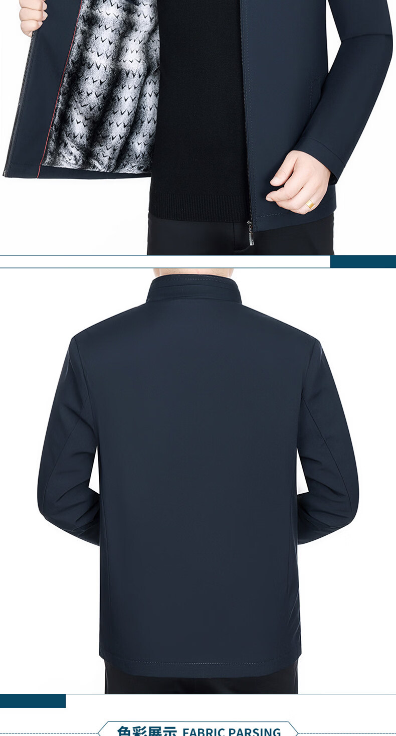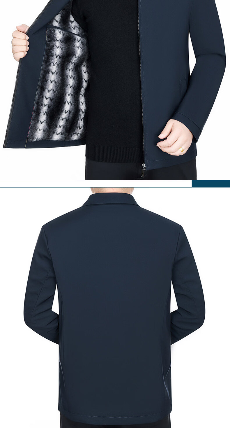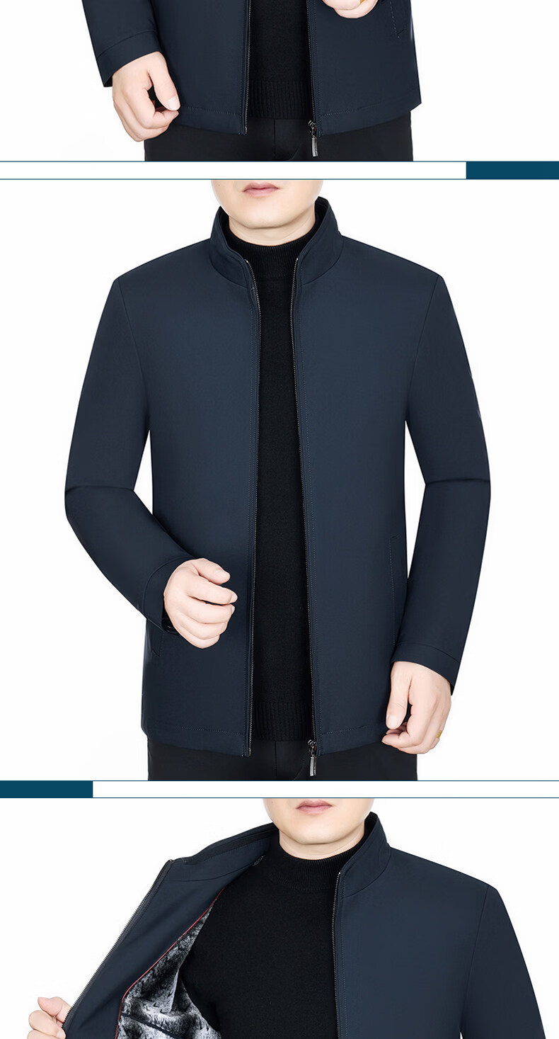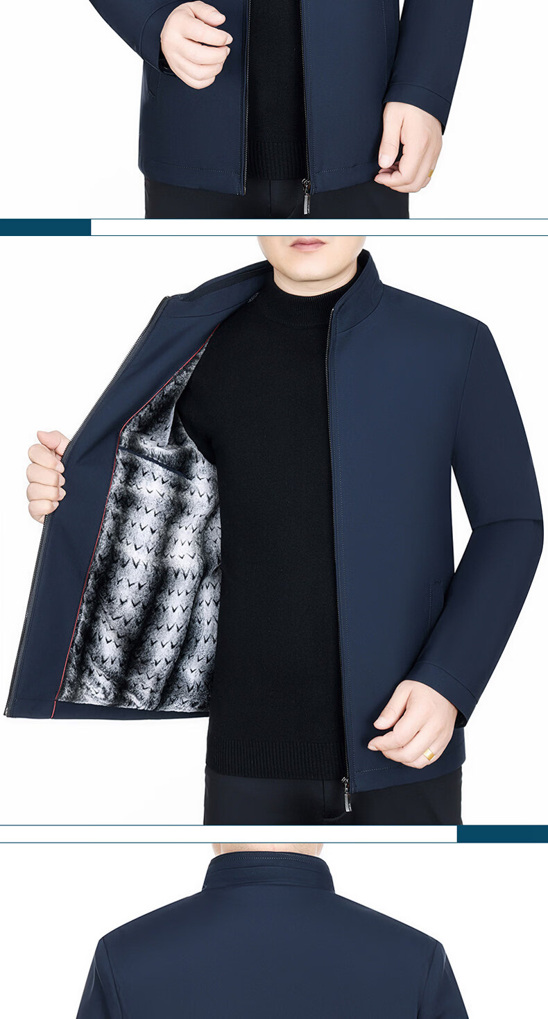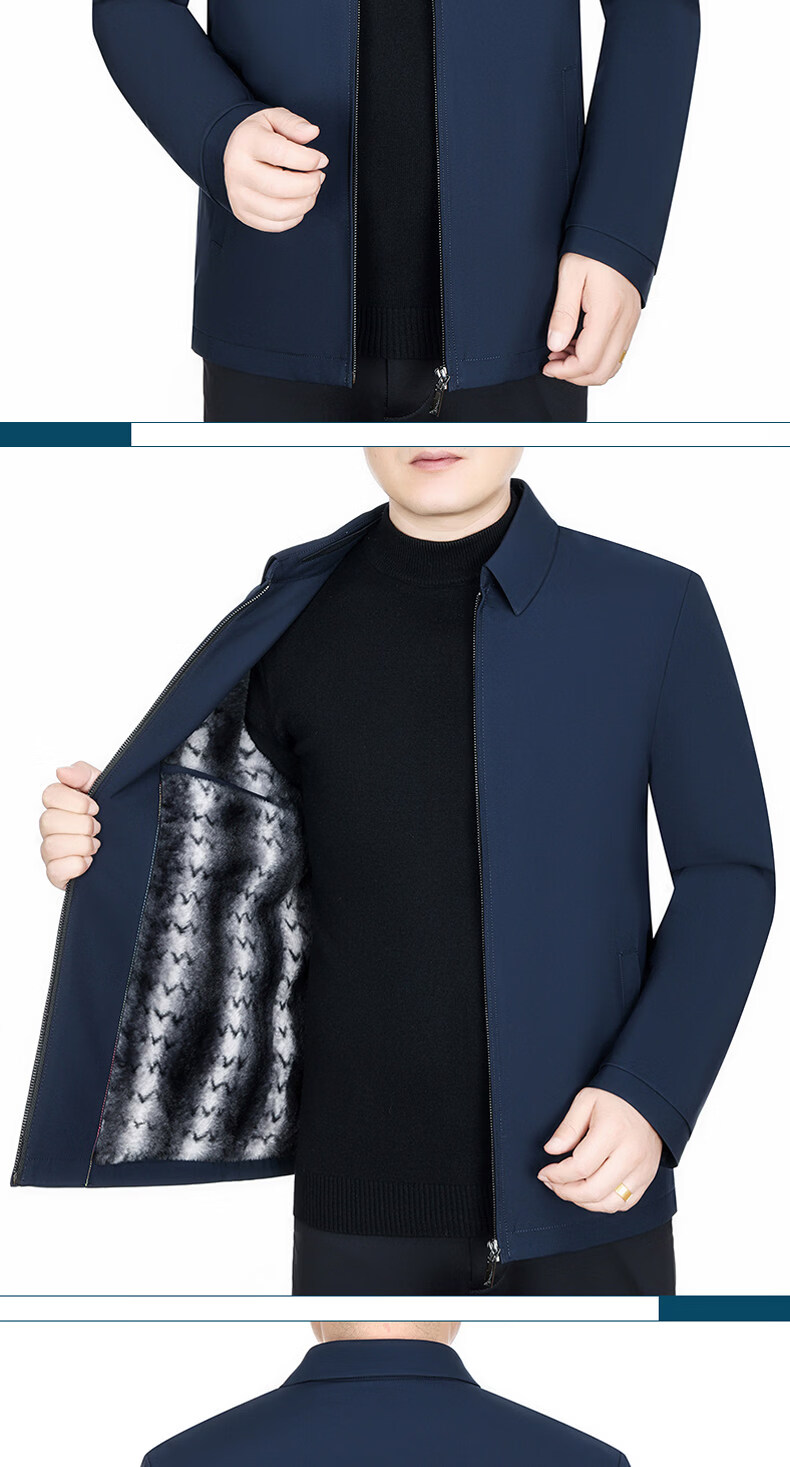 JEEP SPIRIT men's jacket stand collar cotton coat autumn and winter velvet thickened cotton coat casual jacket middle-aged dad wear navy blue lapel style 3XL 190/104A 170-185 catties