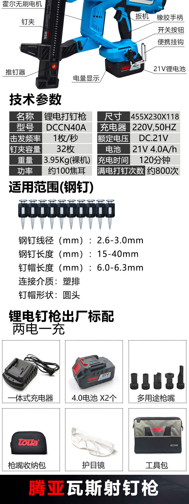 Tenya lithium battery steel hydroelectric special nail shooting no gas lithium battery Makita feet Makita bare metal DCCN40A bare metal 32 pieces