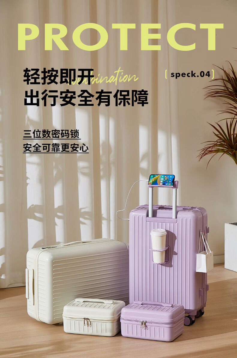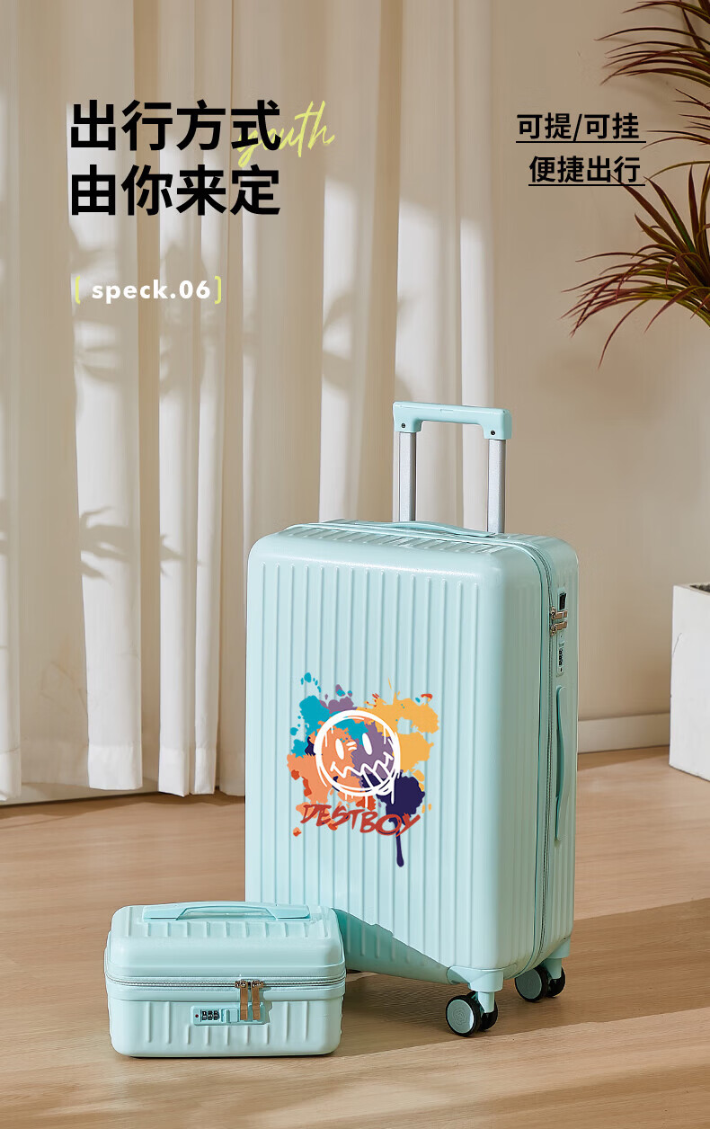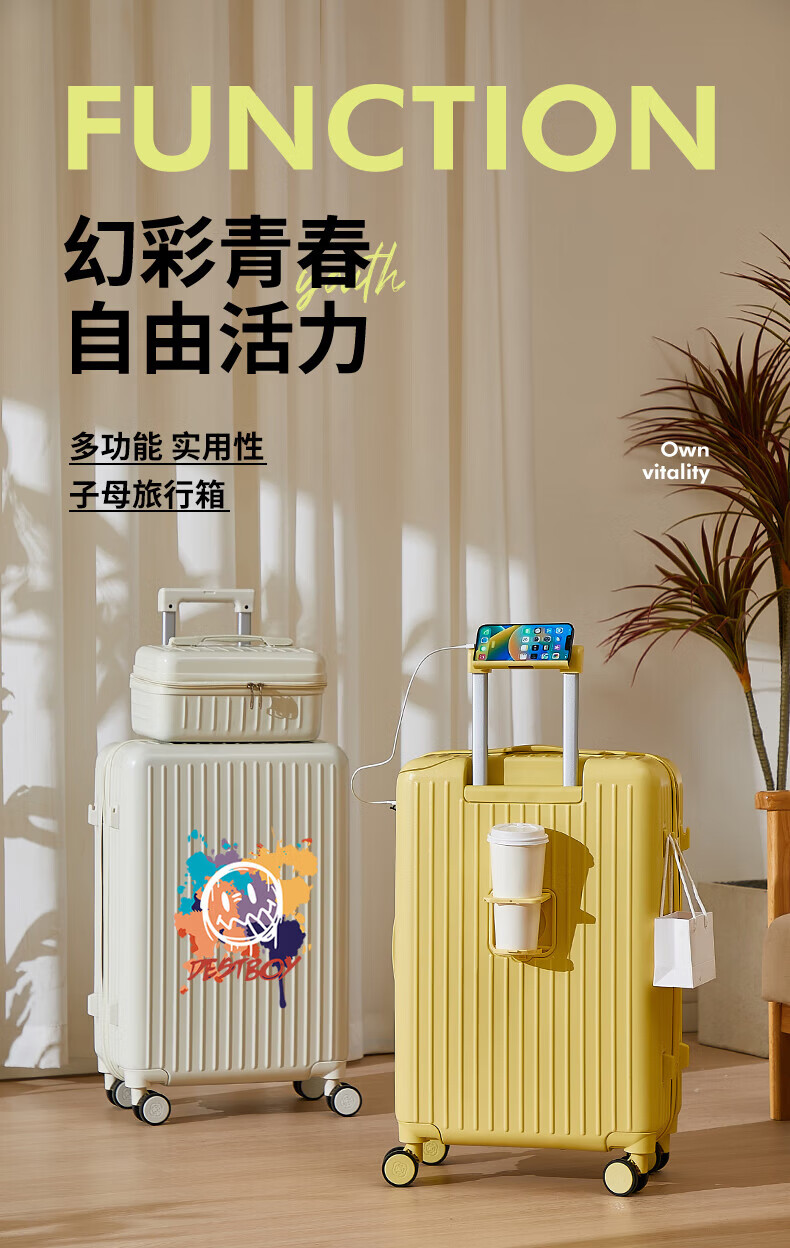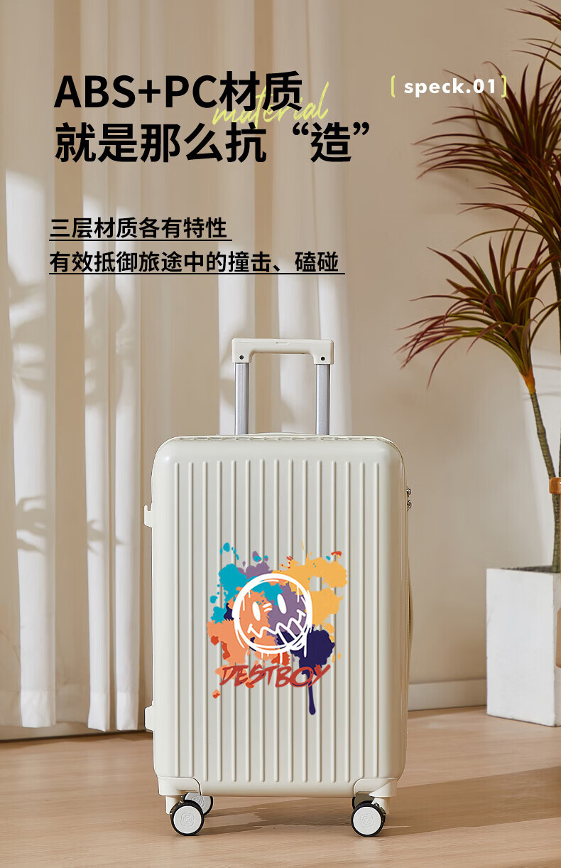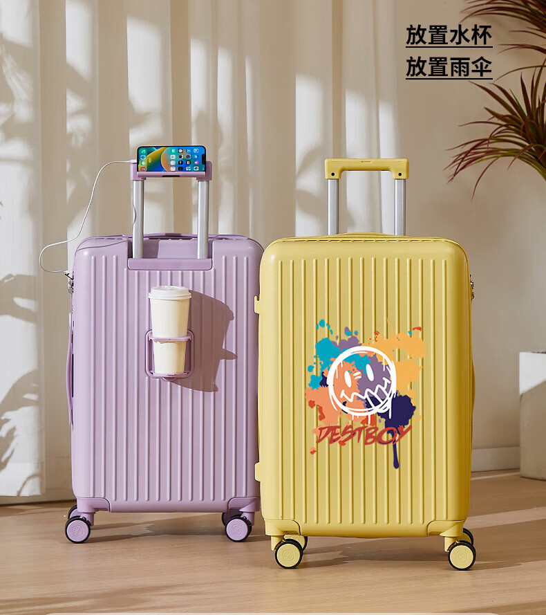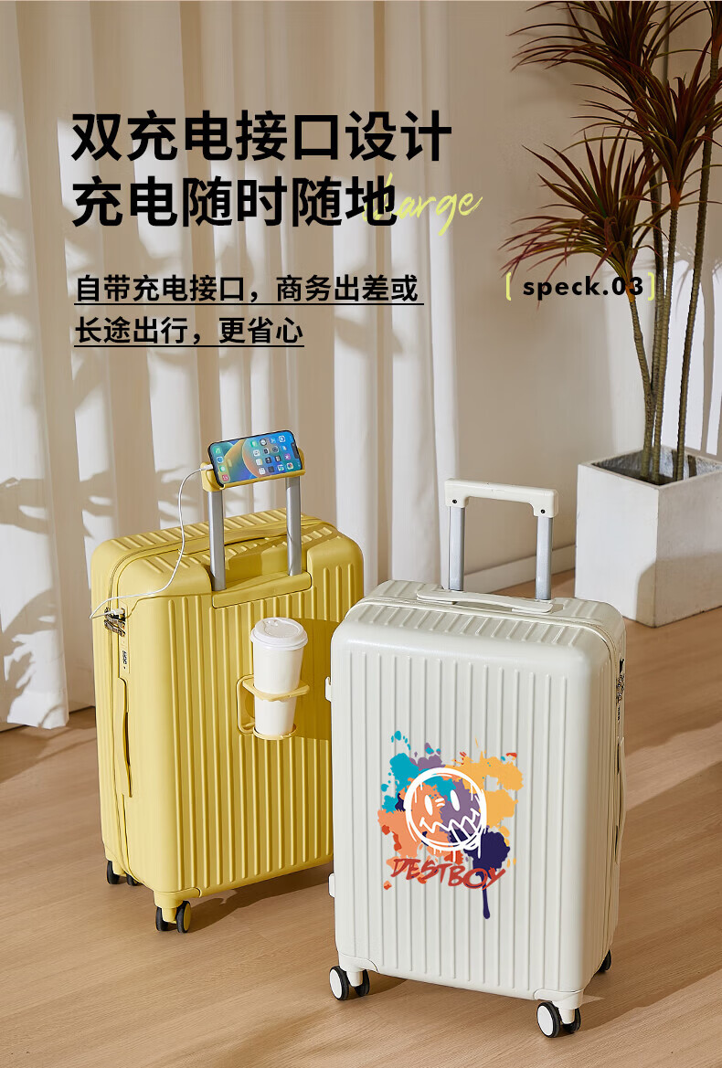 VENDOGERL suitcase for girls with good looks 2025 new 20-inch trolley case with personalized password travel leather case cute cartoon zipper single box cream white_graffiti smiley 24-inch USB dual charge + mobile phone holder + water cup holder