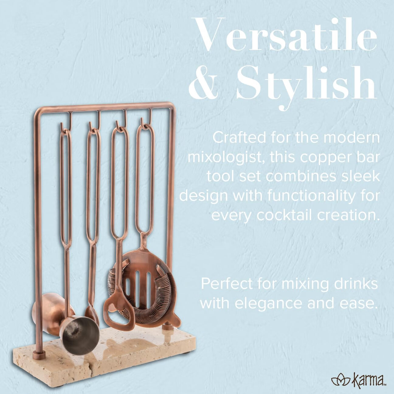 Karma Bartender Set 5-Piece Bar Tool Set with Marble Stand Home Bartending Set Copper