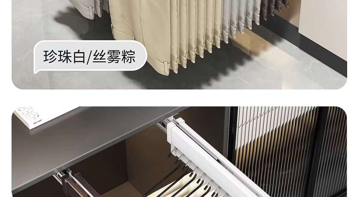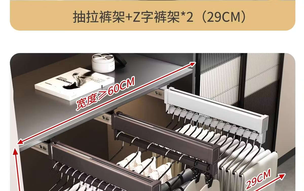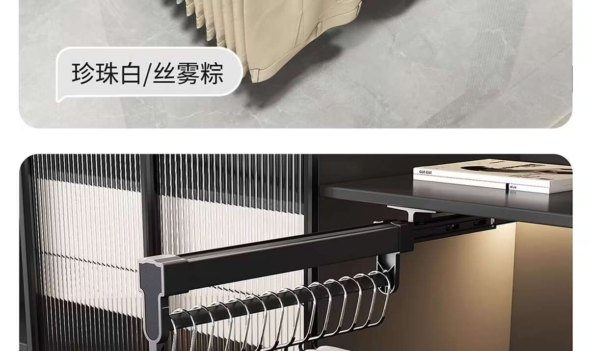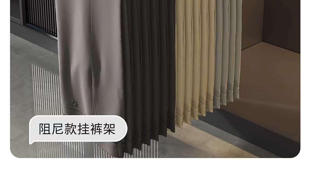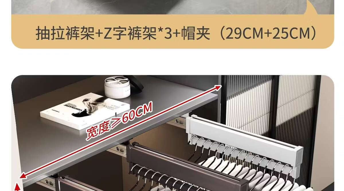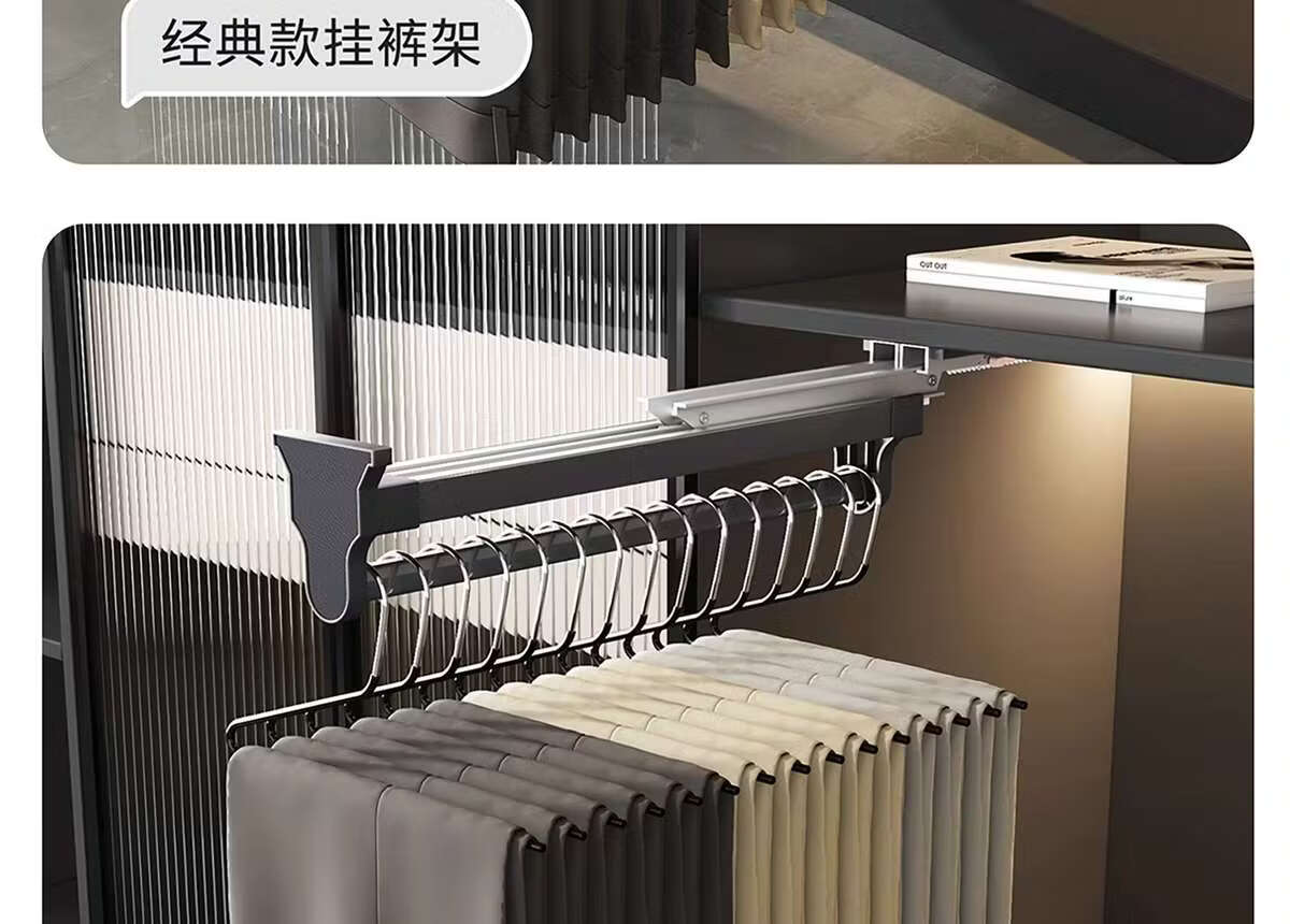 Fantasy pull-out trouser rack with retractable slide rails and built-in top-mounted trouser storage. Modern gray leather damping anti-slip striped cabinet. Interior depth 47.5cm