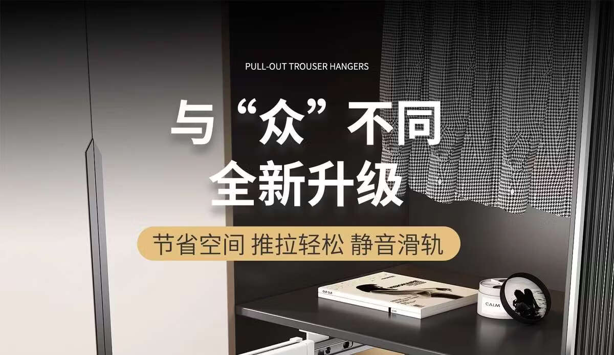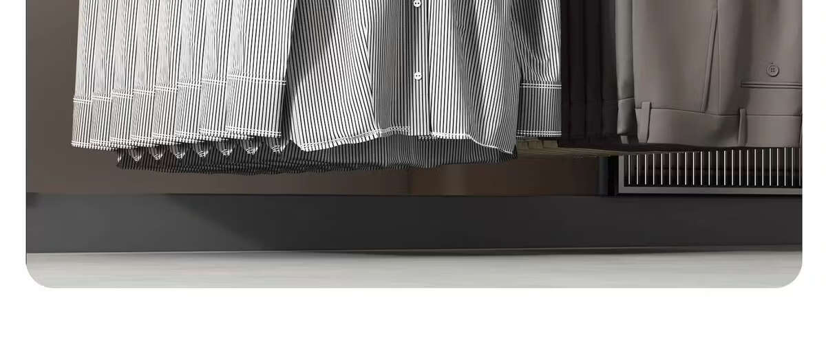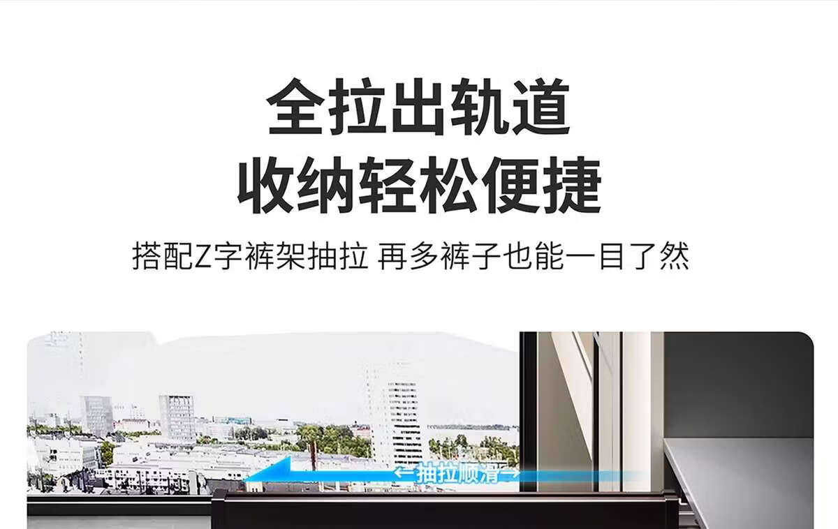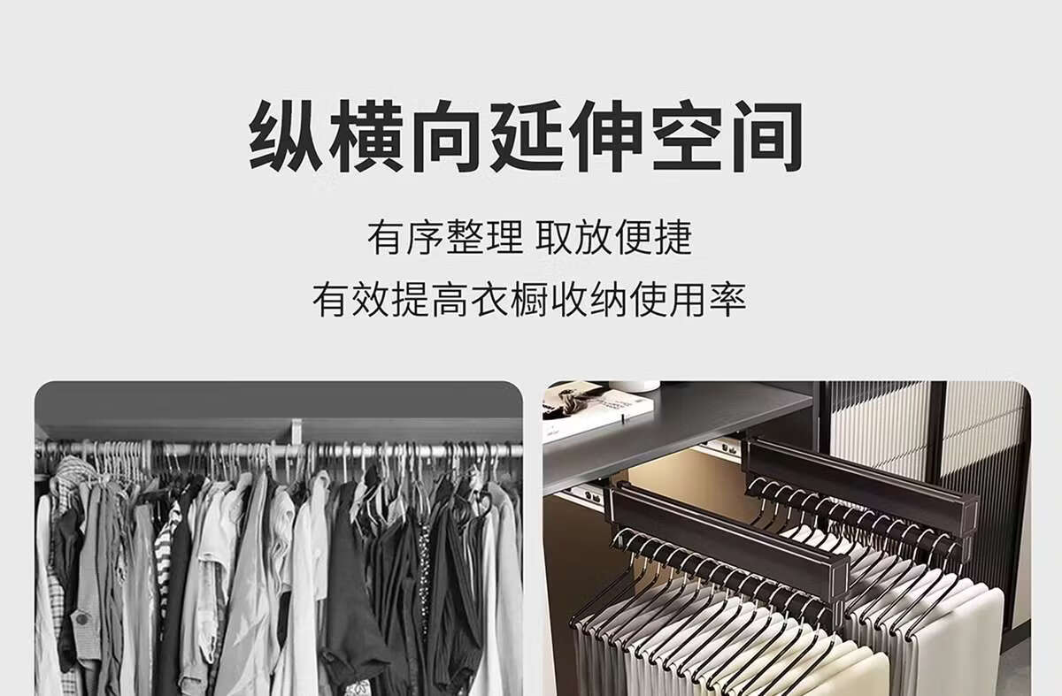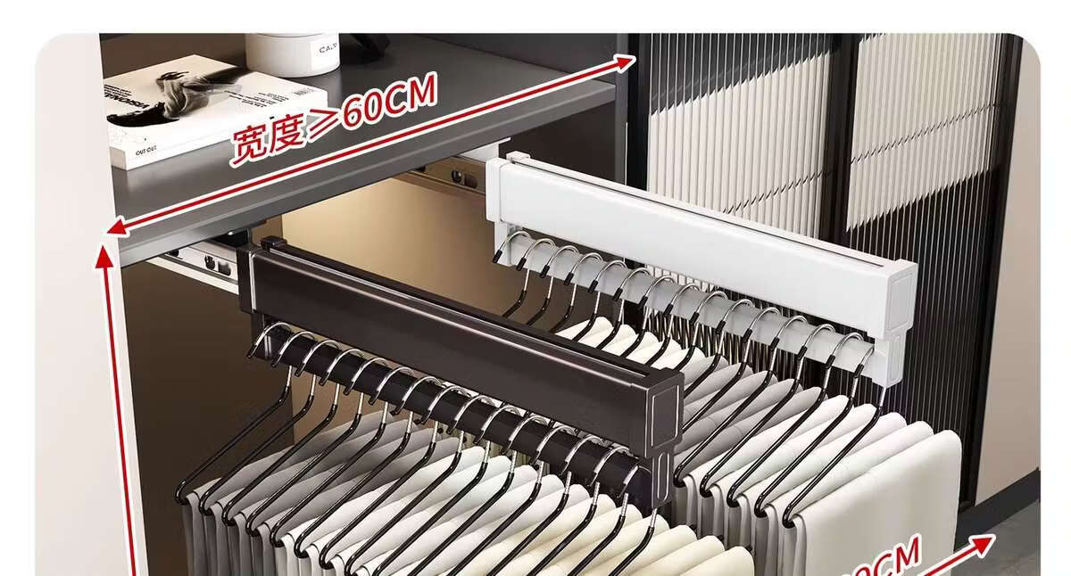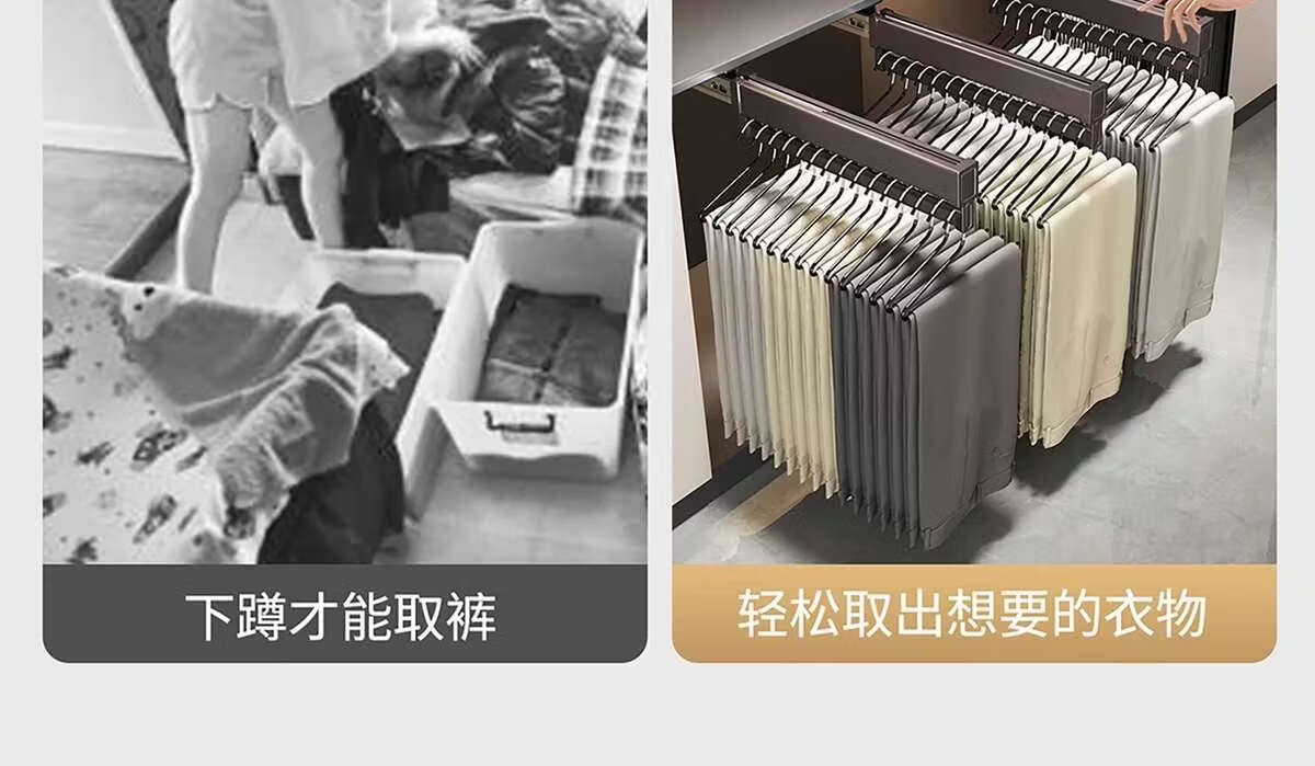 Fantasy pull-out trouser rack with retractable slide rails and built-in top-mounted trouser storage. Modern gray leather damping anti-slip striped cabinet. Interior depth 47.5cm