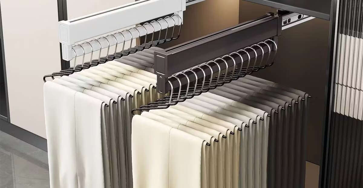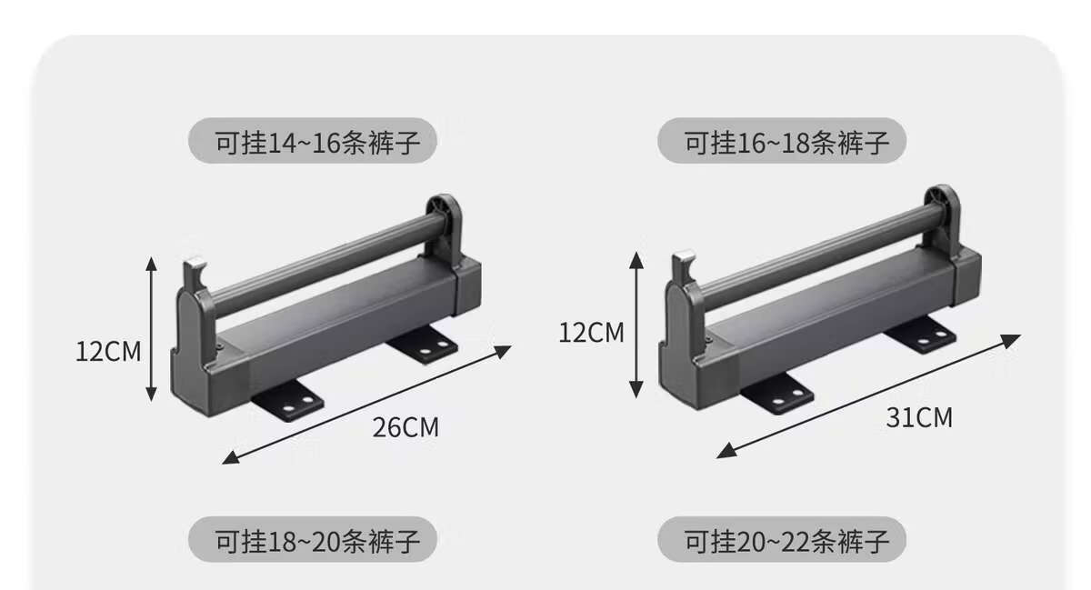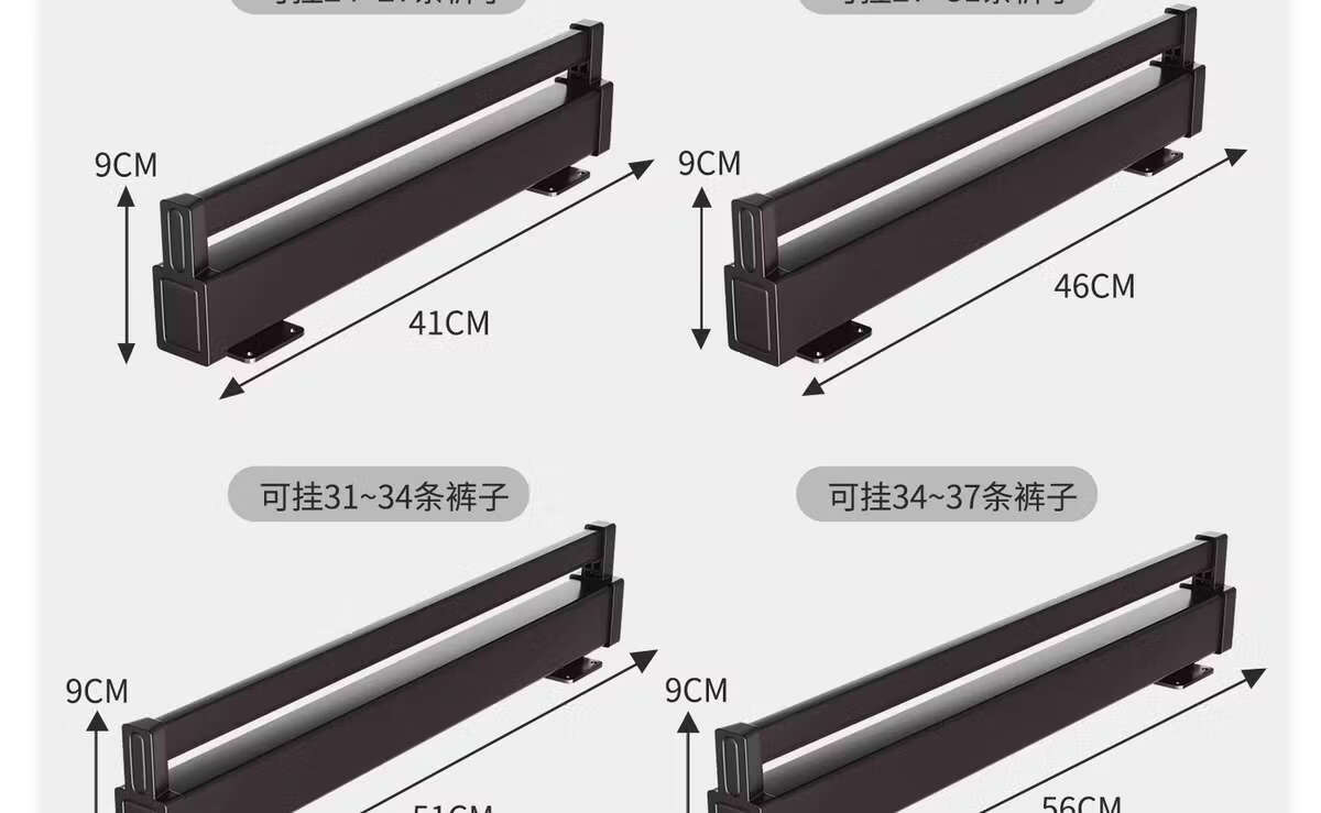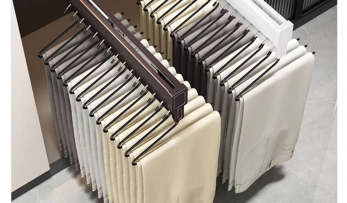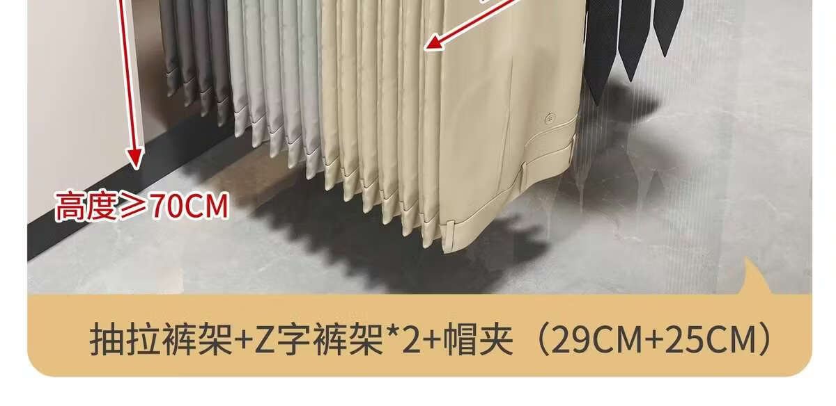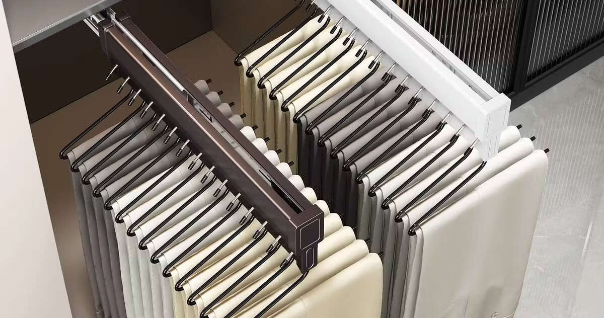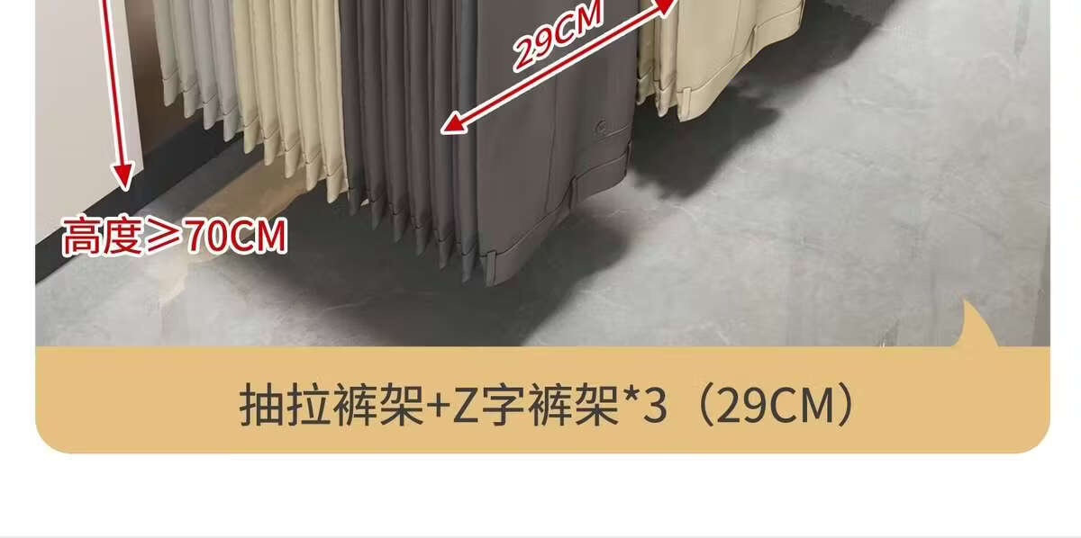 Fantasy pull-out trouser rack with retractable slide rails and built-in top-mounted trouser storage. Modern gray leather damping anti-slip striped cabinet. Interior depth 47.5cm
