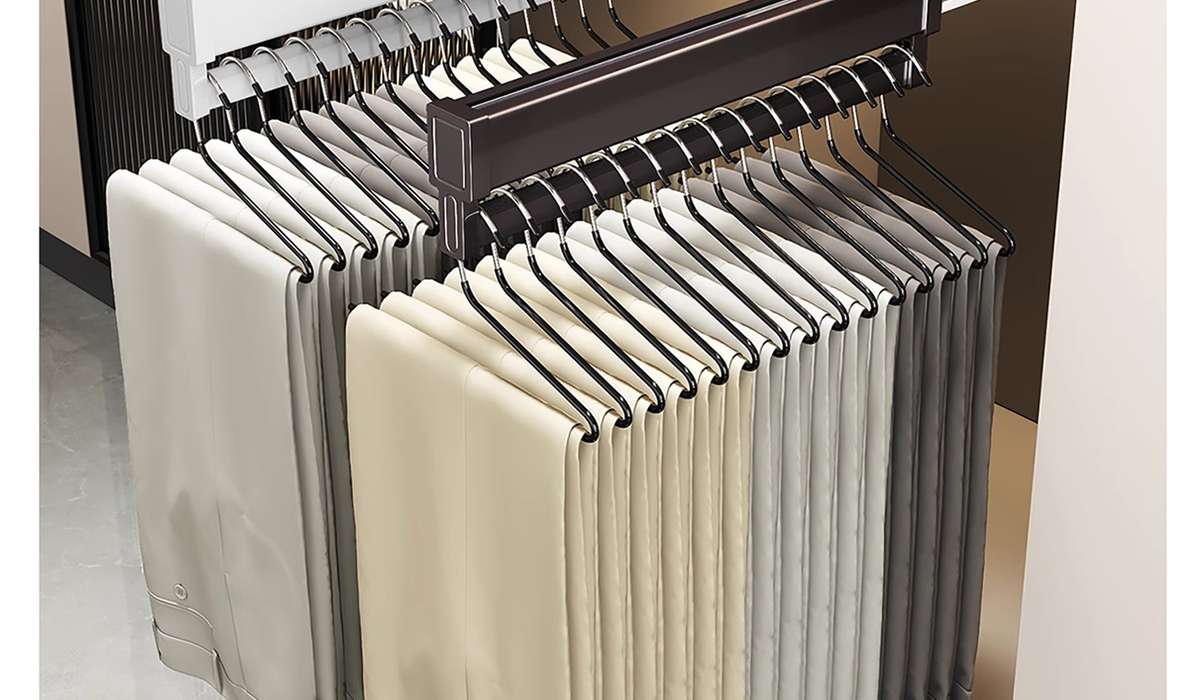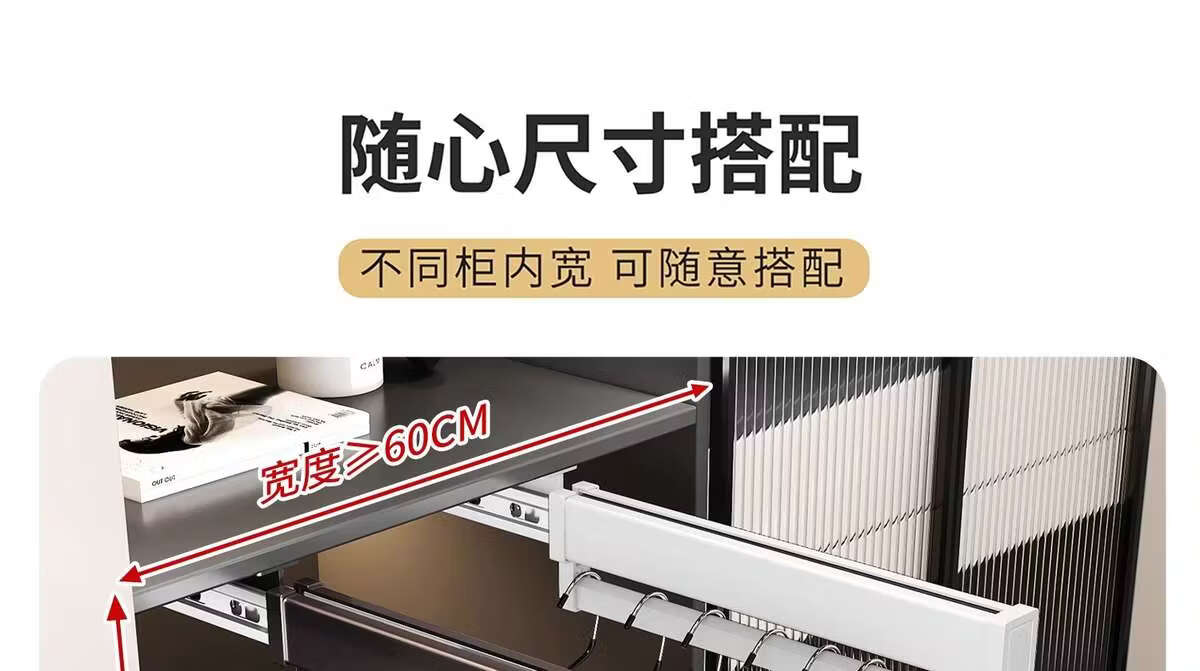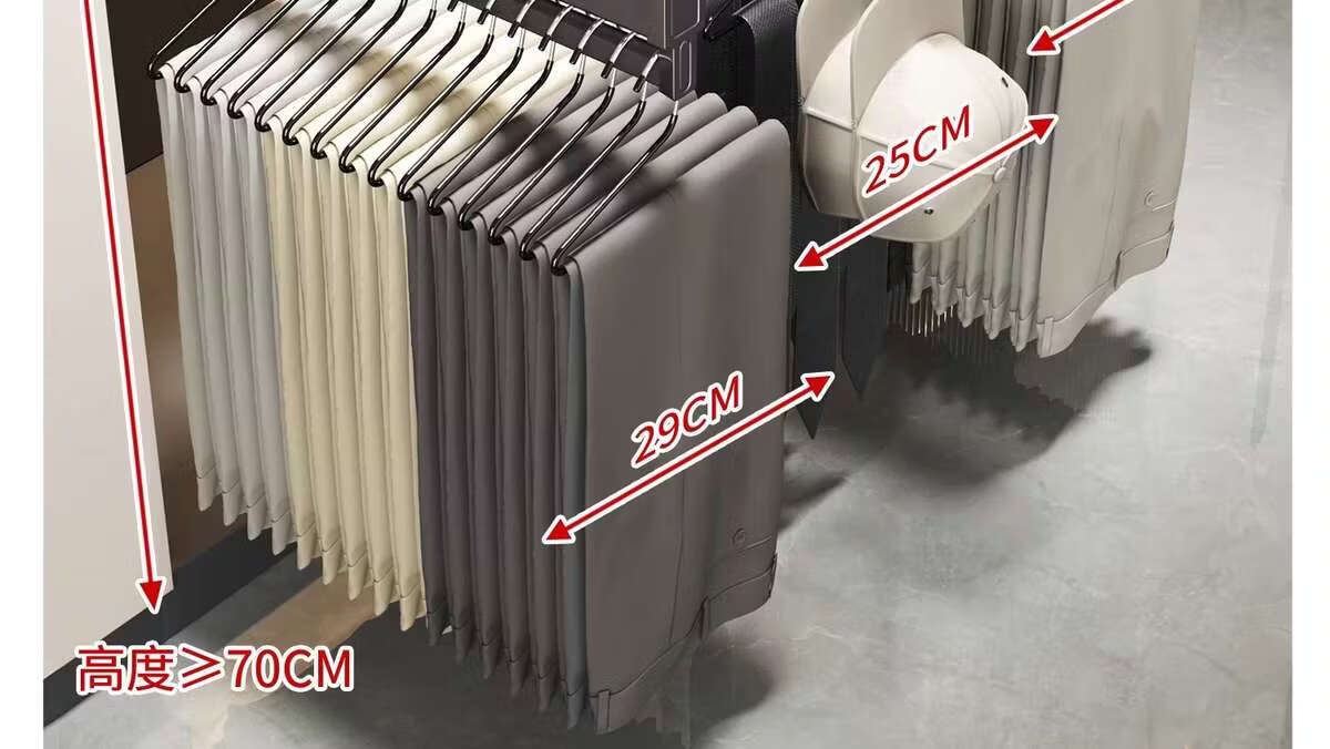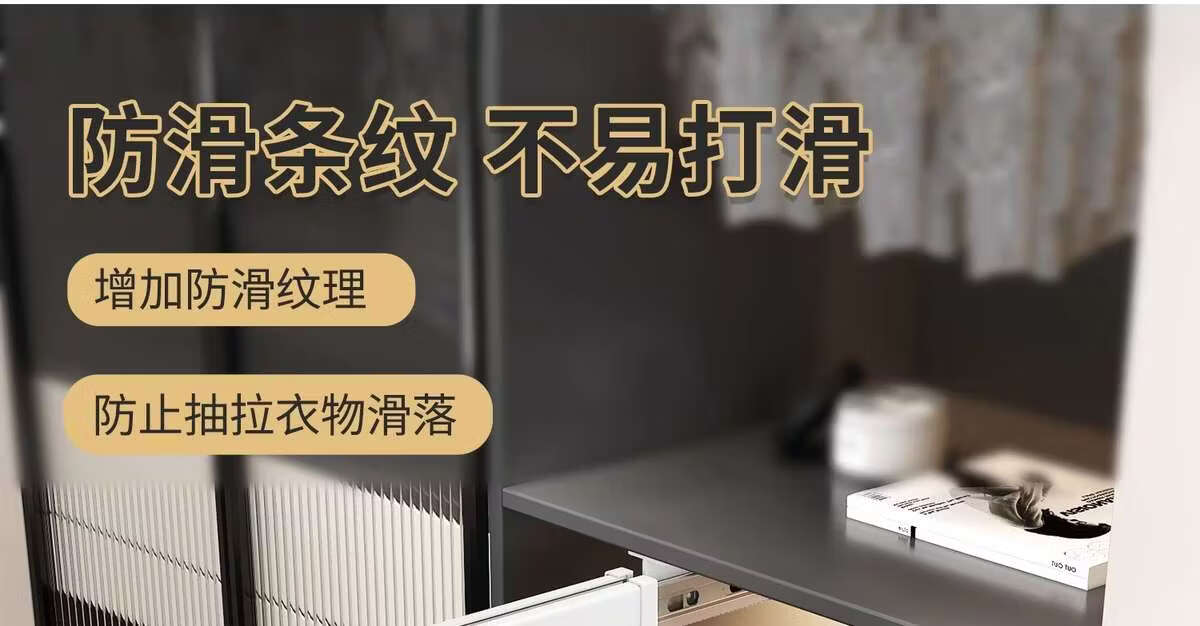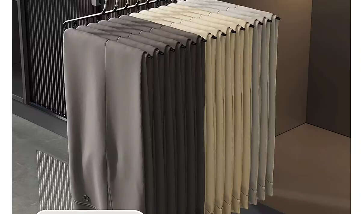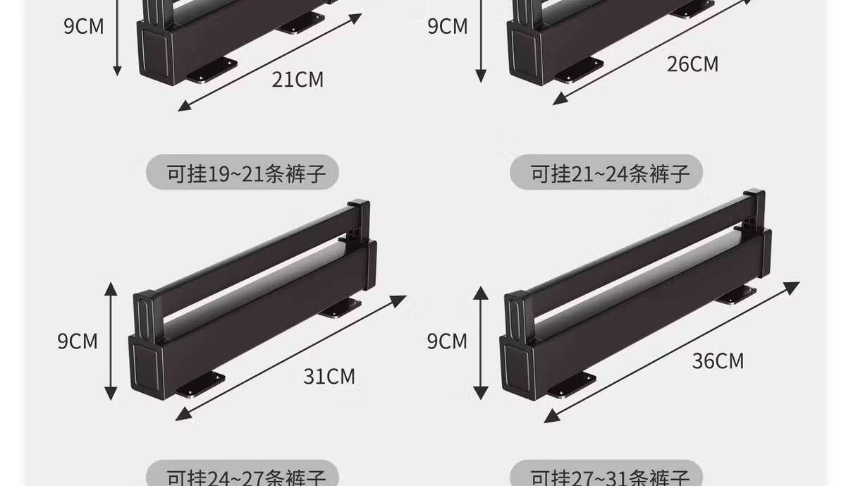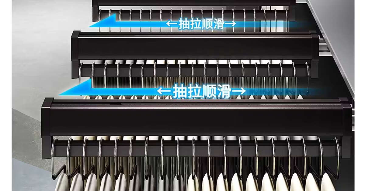 Fantasy pull-out trouser rack with retractable slide rails and built-in top-mounted trouser storage. Modern gray leather damping anti-slip striped cabinet. Interior depth 47.5cm