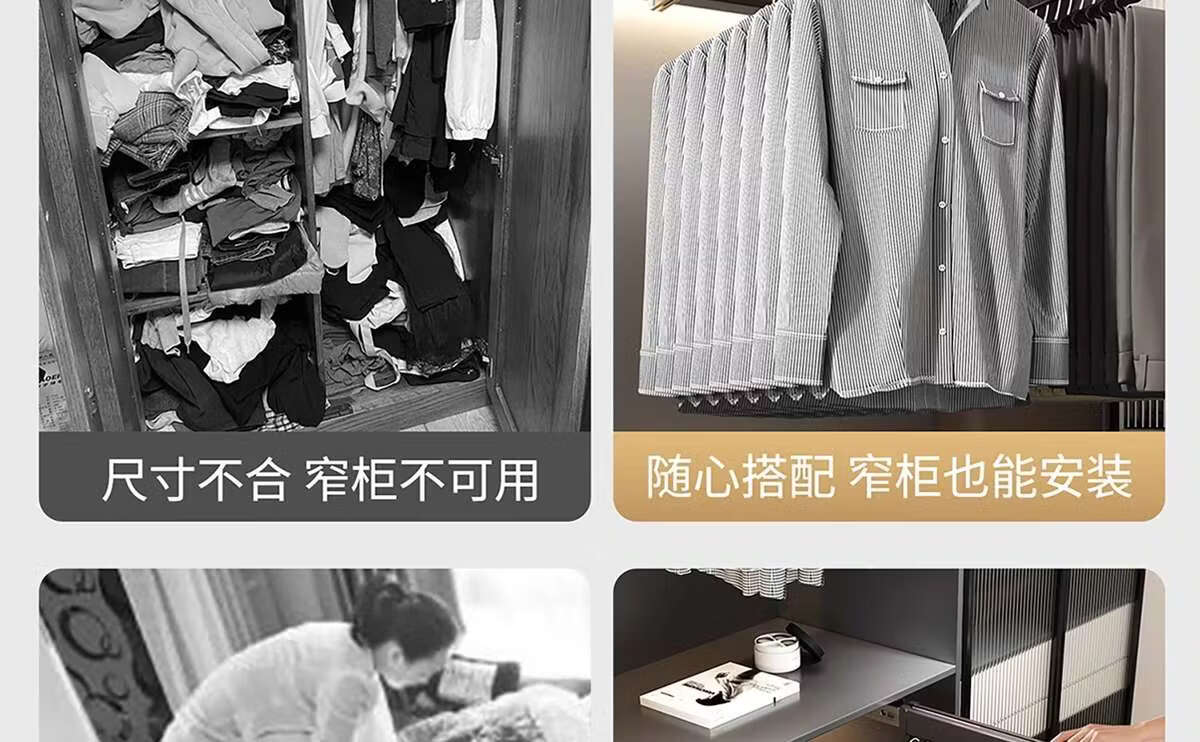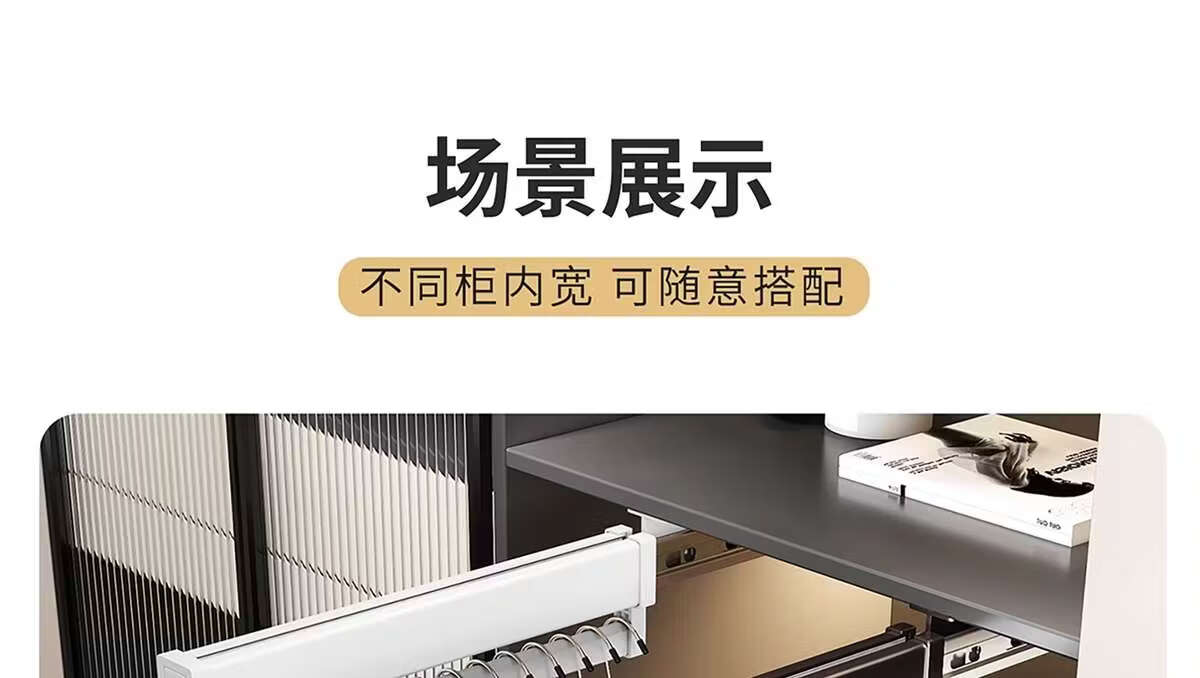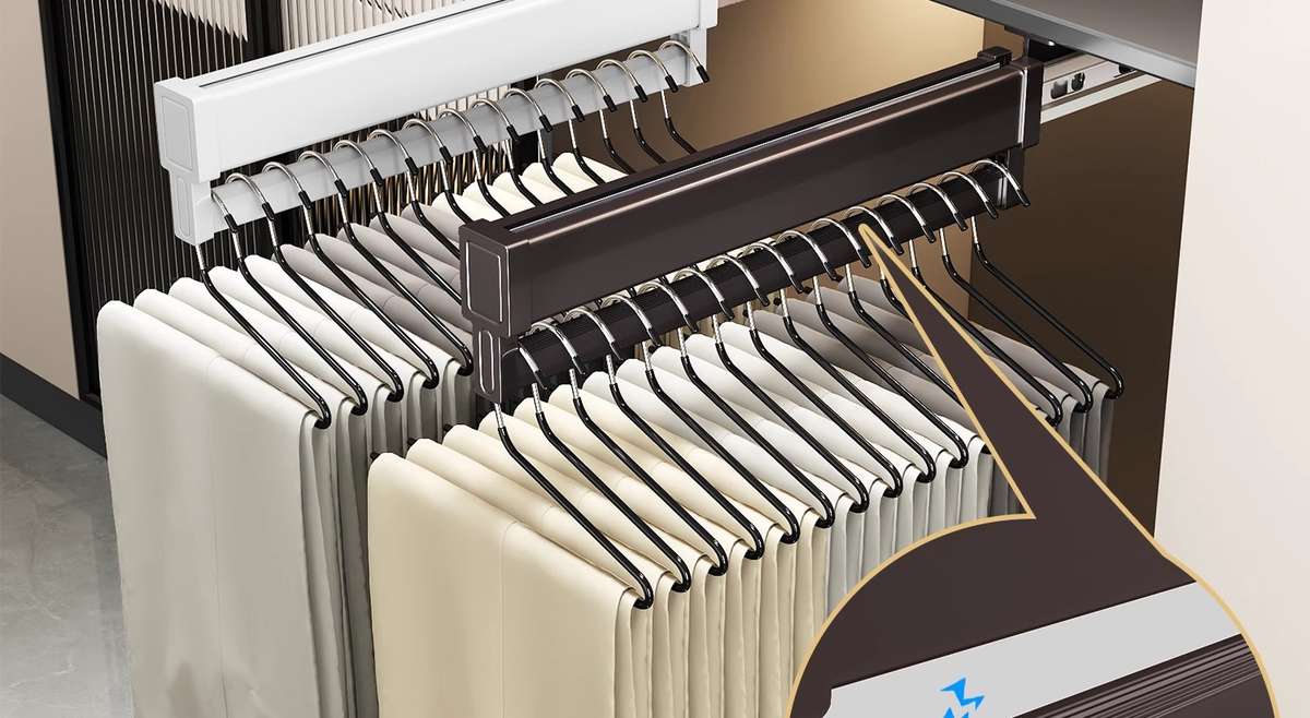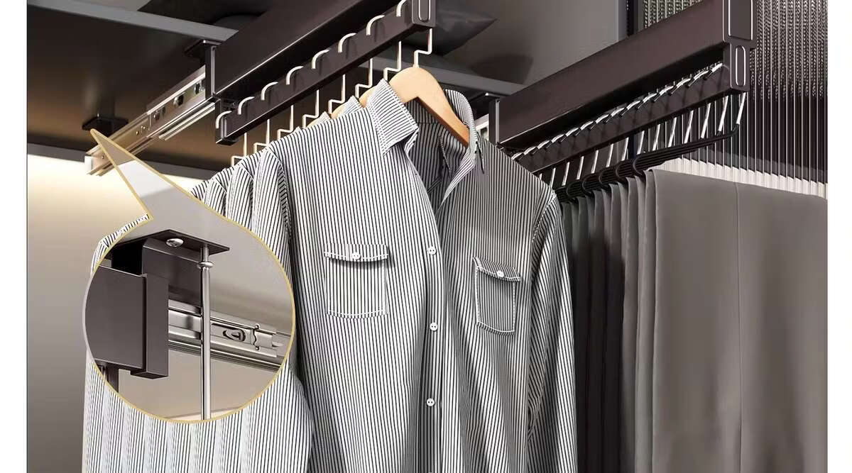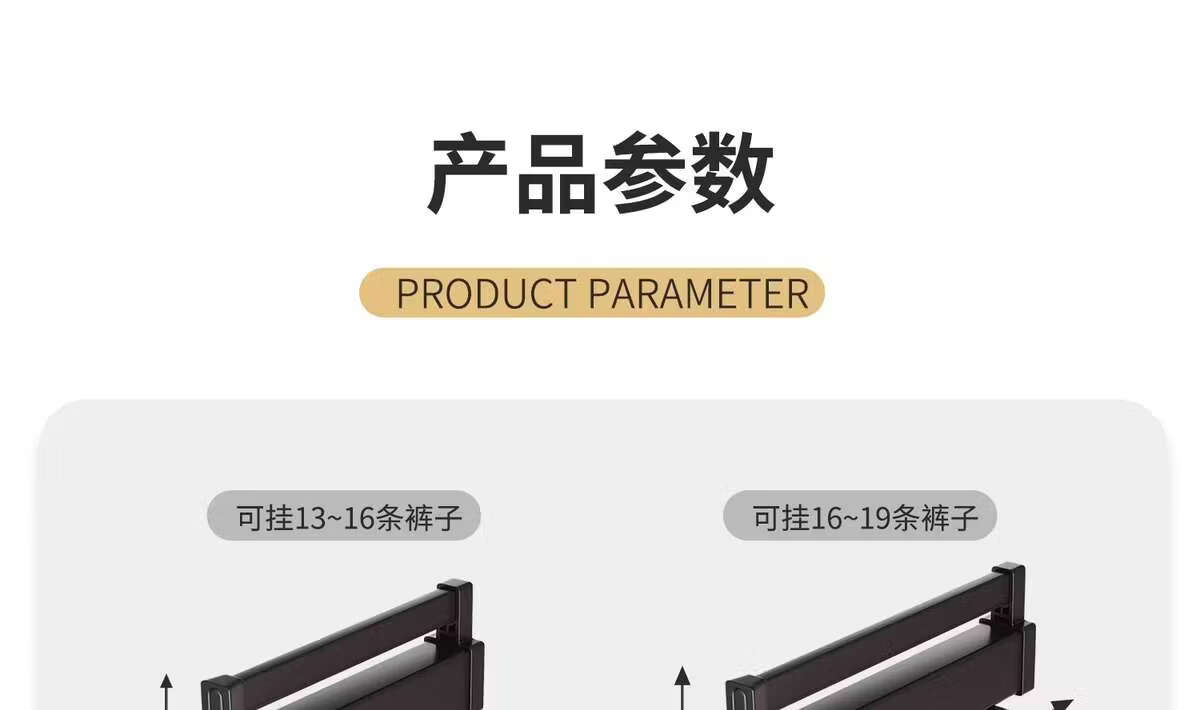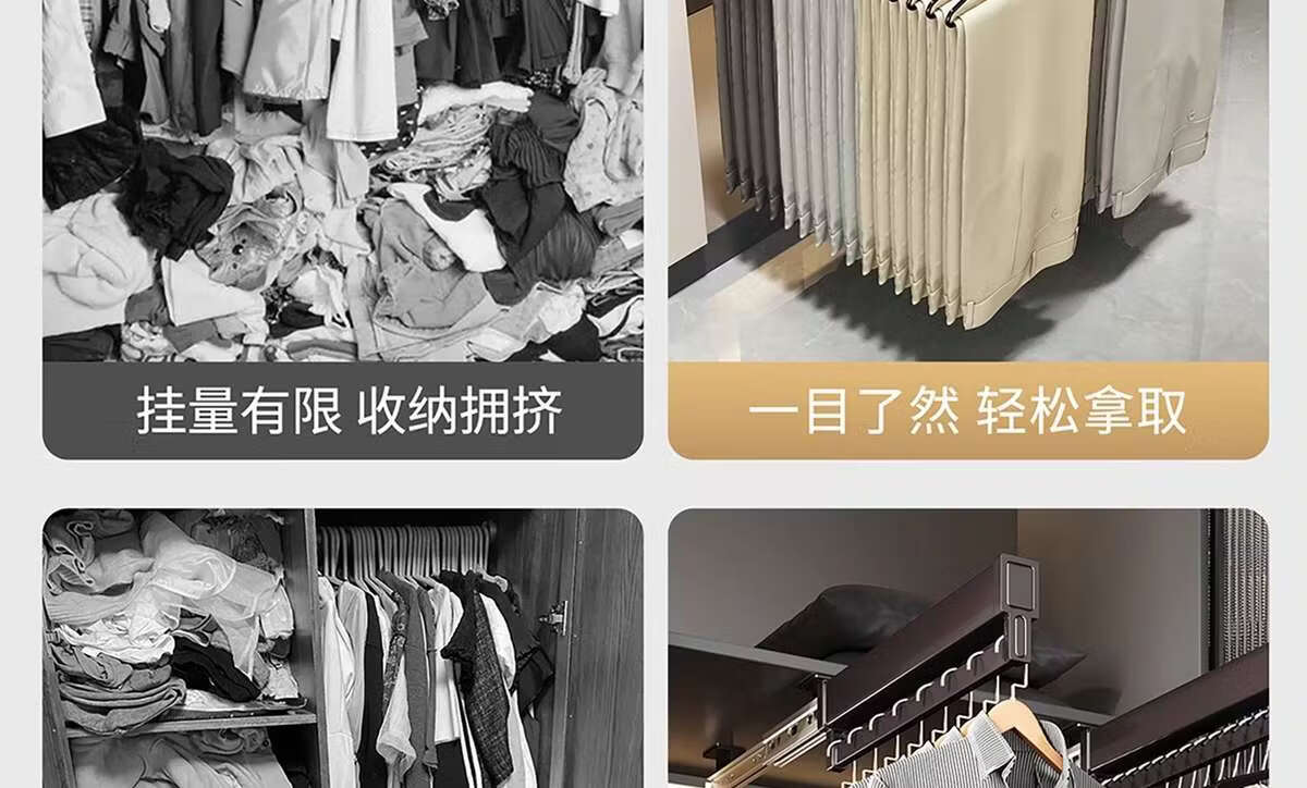 Fantasy pull-out trouser rack with retractable slide rails and built-in top-mounted trouser storage. Modern gray leather damping anti-slip striped cabinet. Interior depth 47.5cm