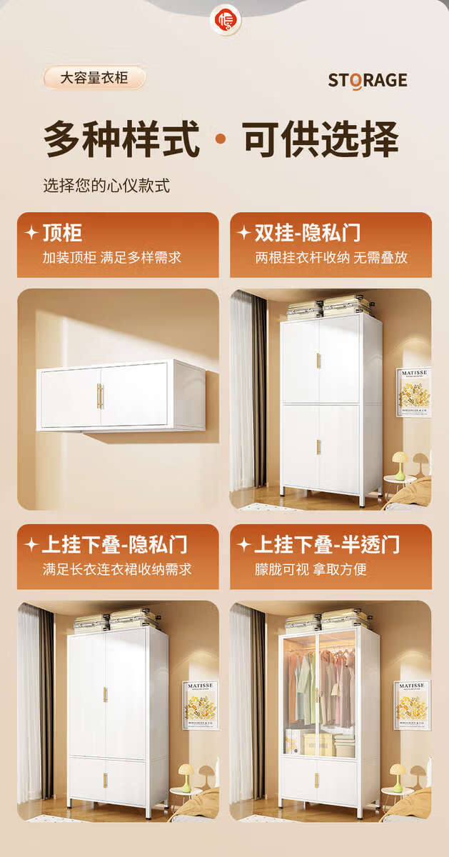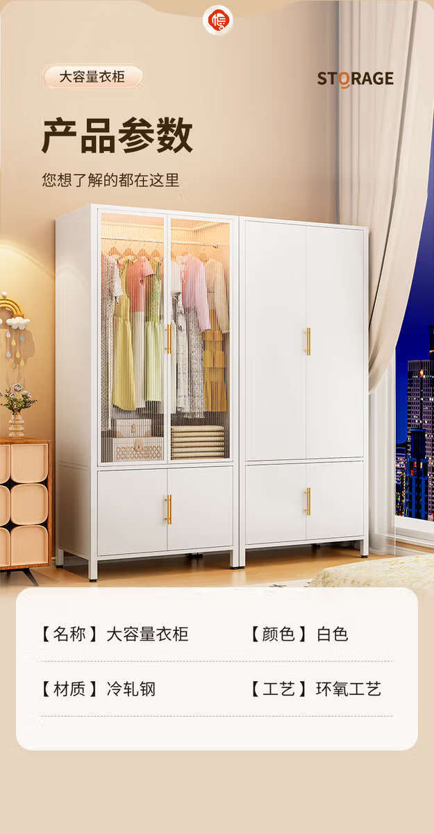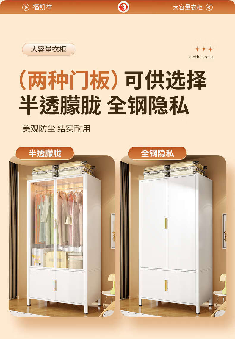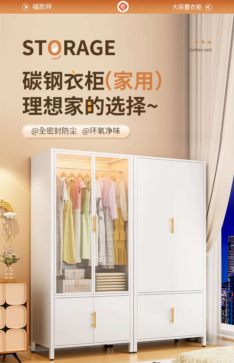 Yusenyi Steel Wardrobe Bedroom Use Simple Assembly Iron Combination Wardrobe Cloakroom Storage Cabinet Thickened Plate 120cm Wide Type A Semi-Transparent Door Double Hanging Clothes Upstairs Package Installation