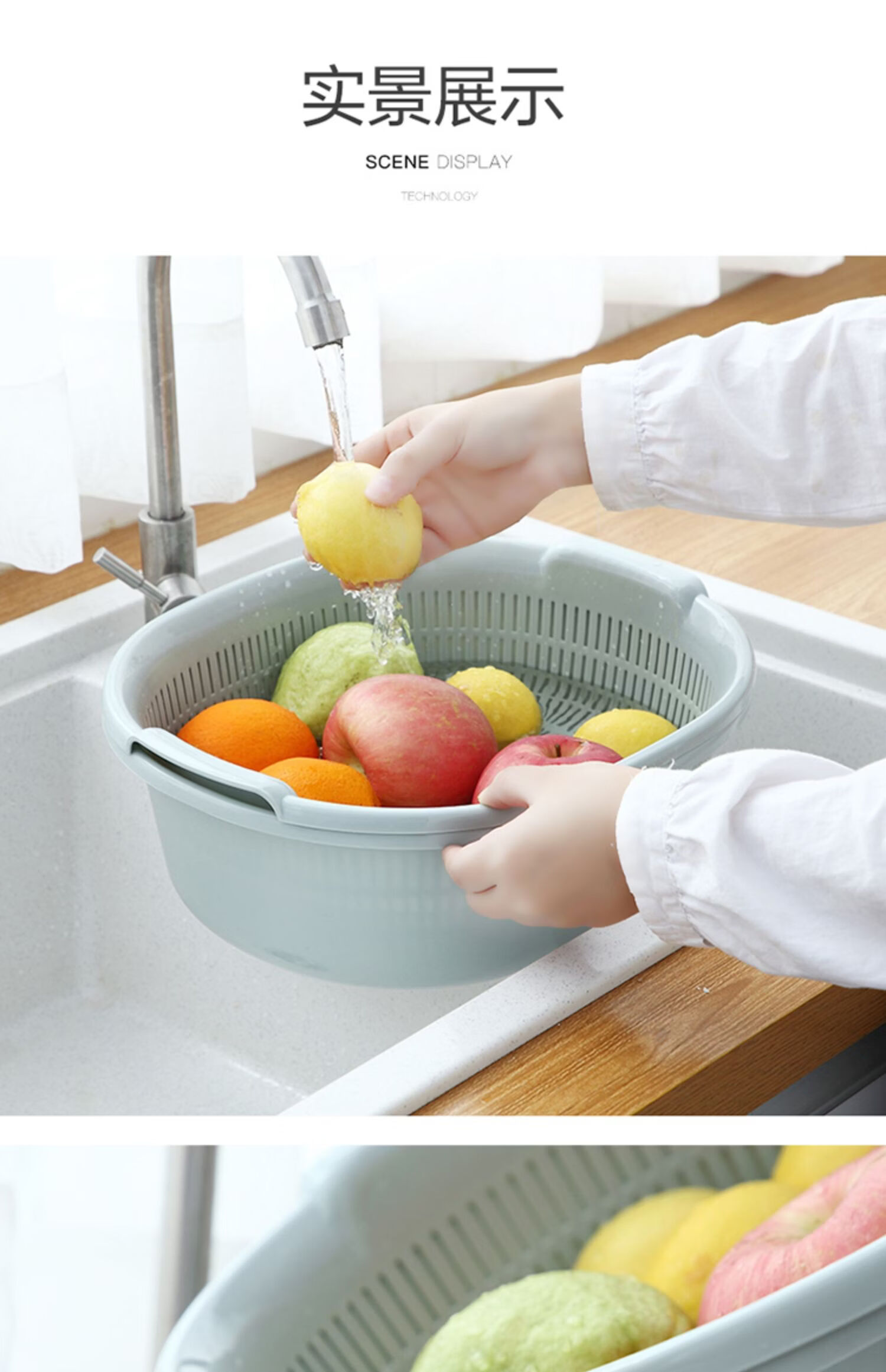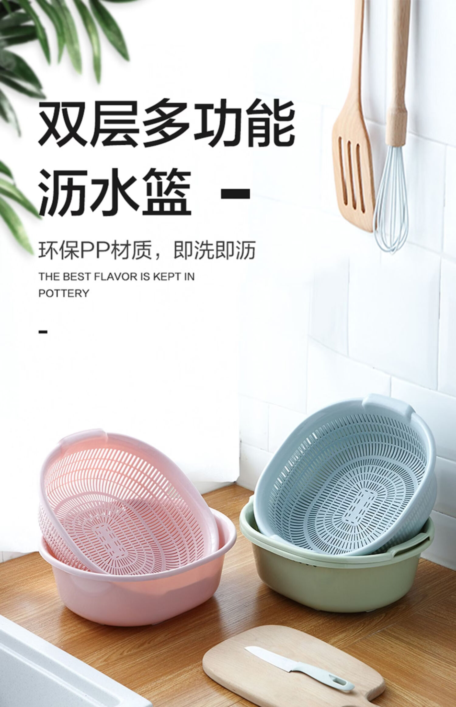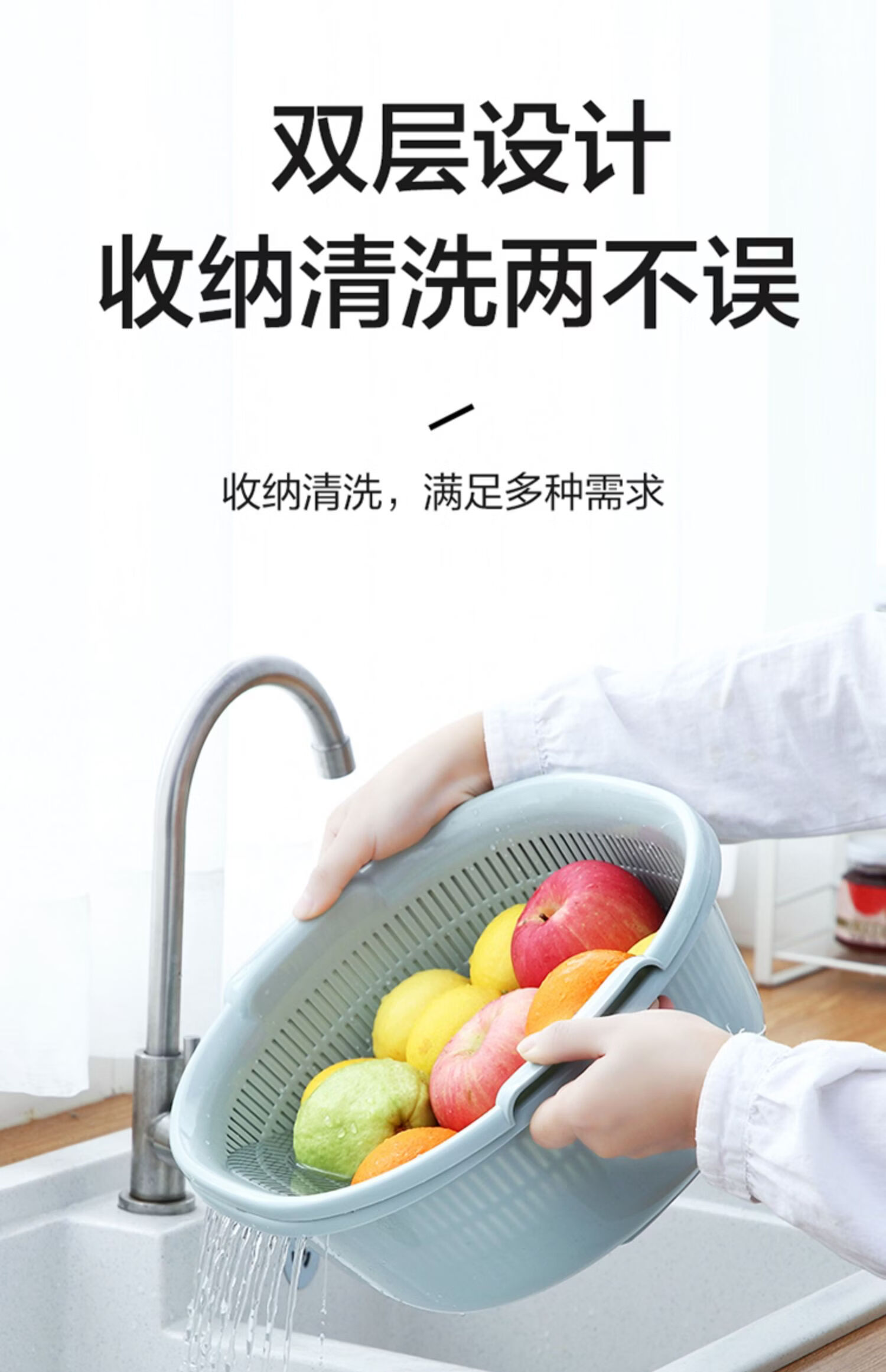 Yusenyi vegetable washing basin, rice washing and draining basket, home kitchen and living room, double-layer plastic sieve, vegetable basket, fruit filtering basket, Nordic blue, upgraded and thickened, 2-piece set