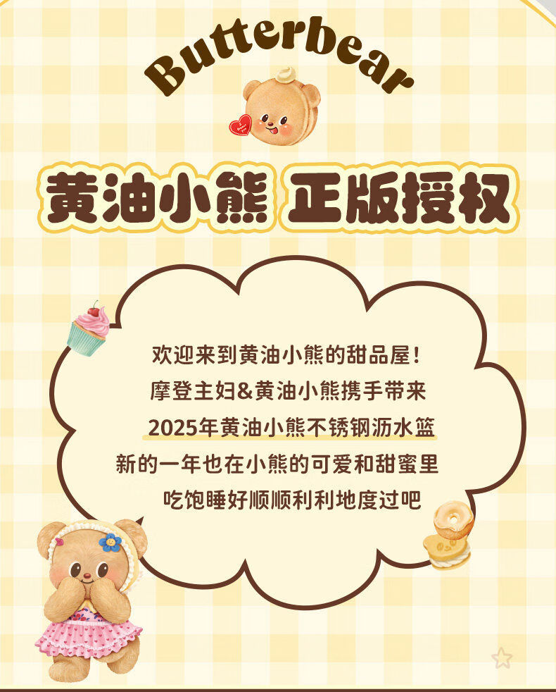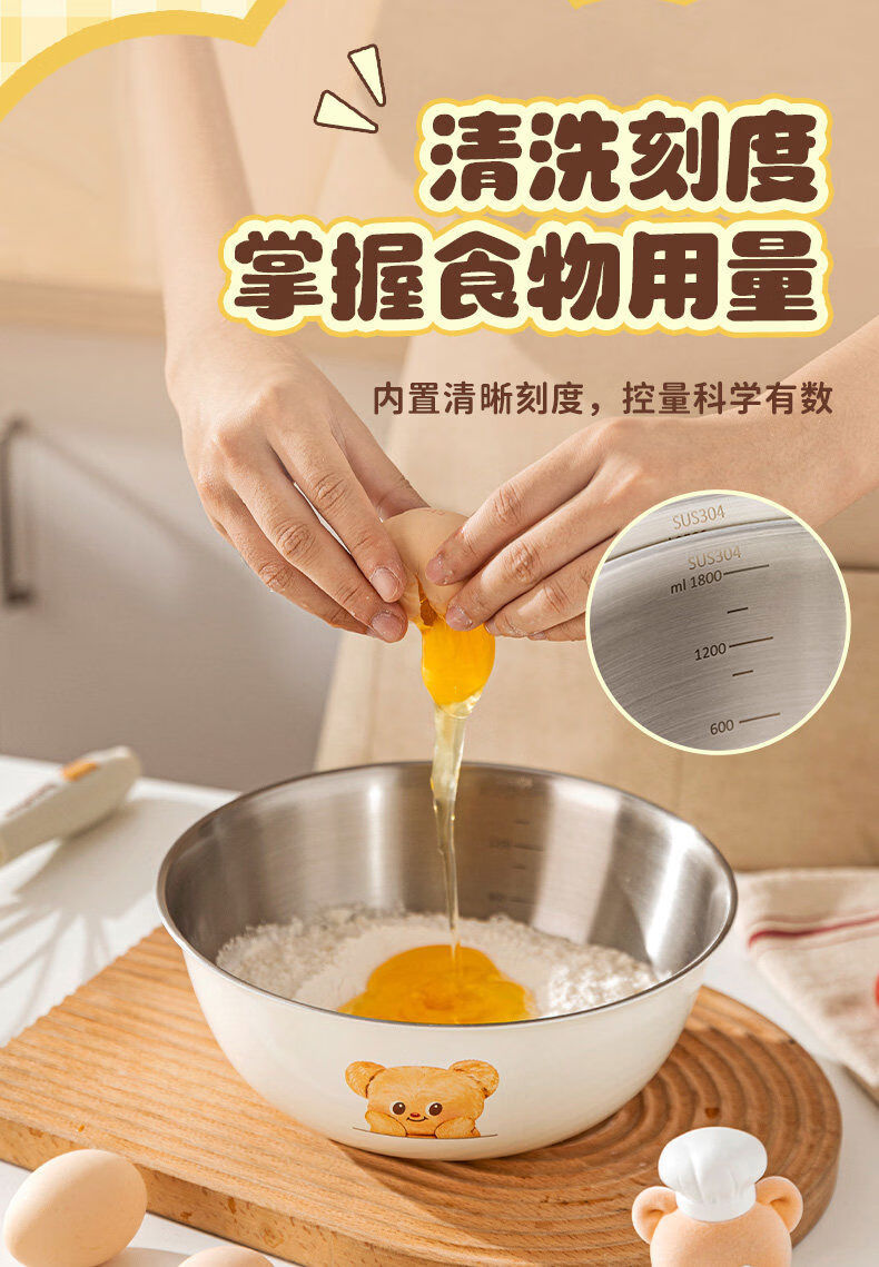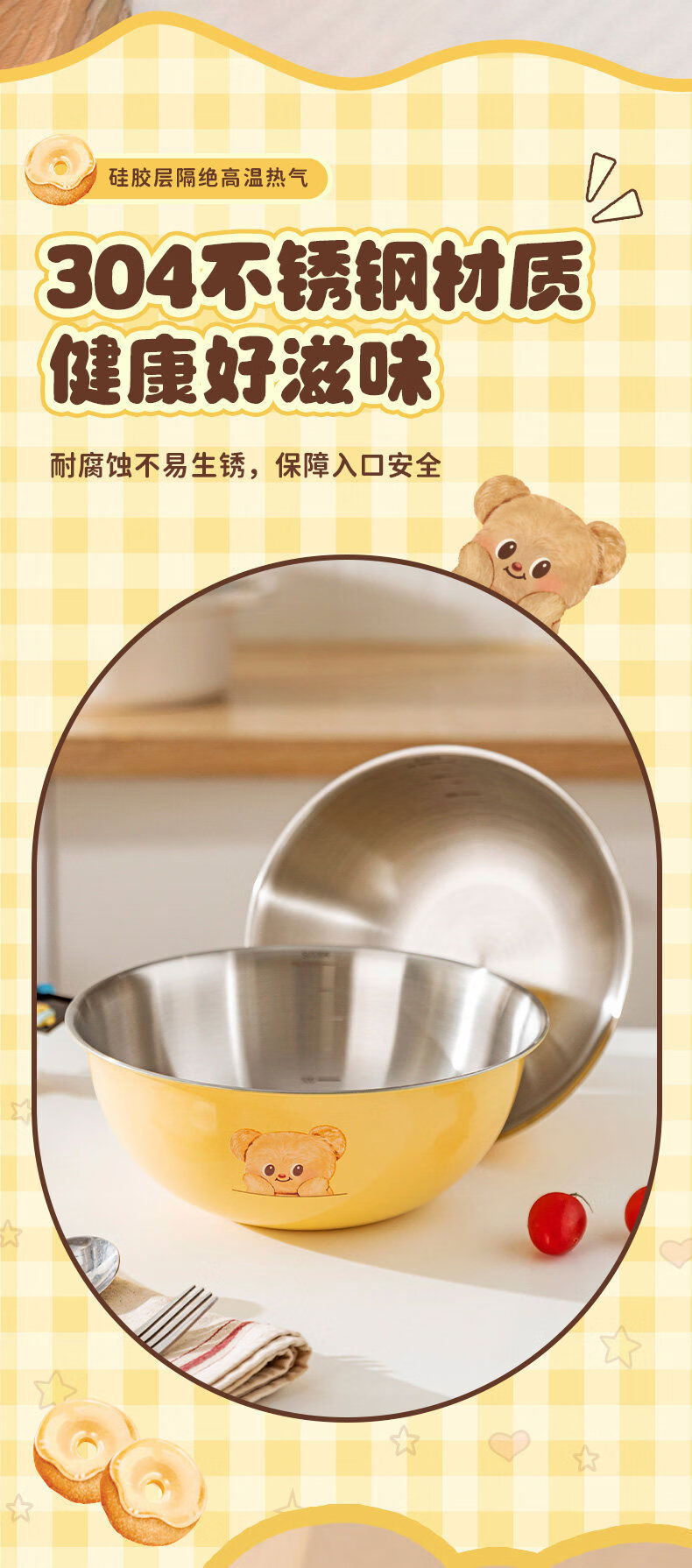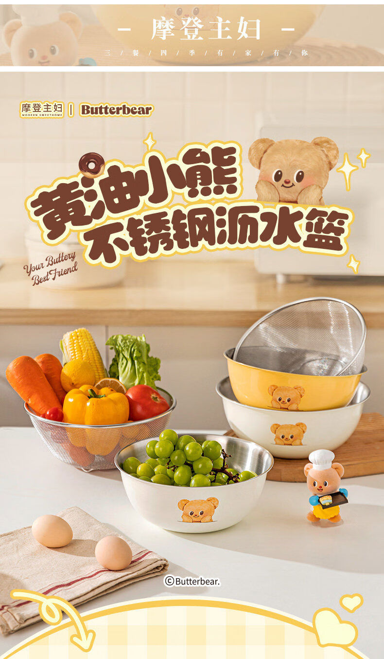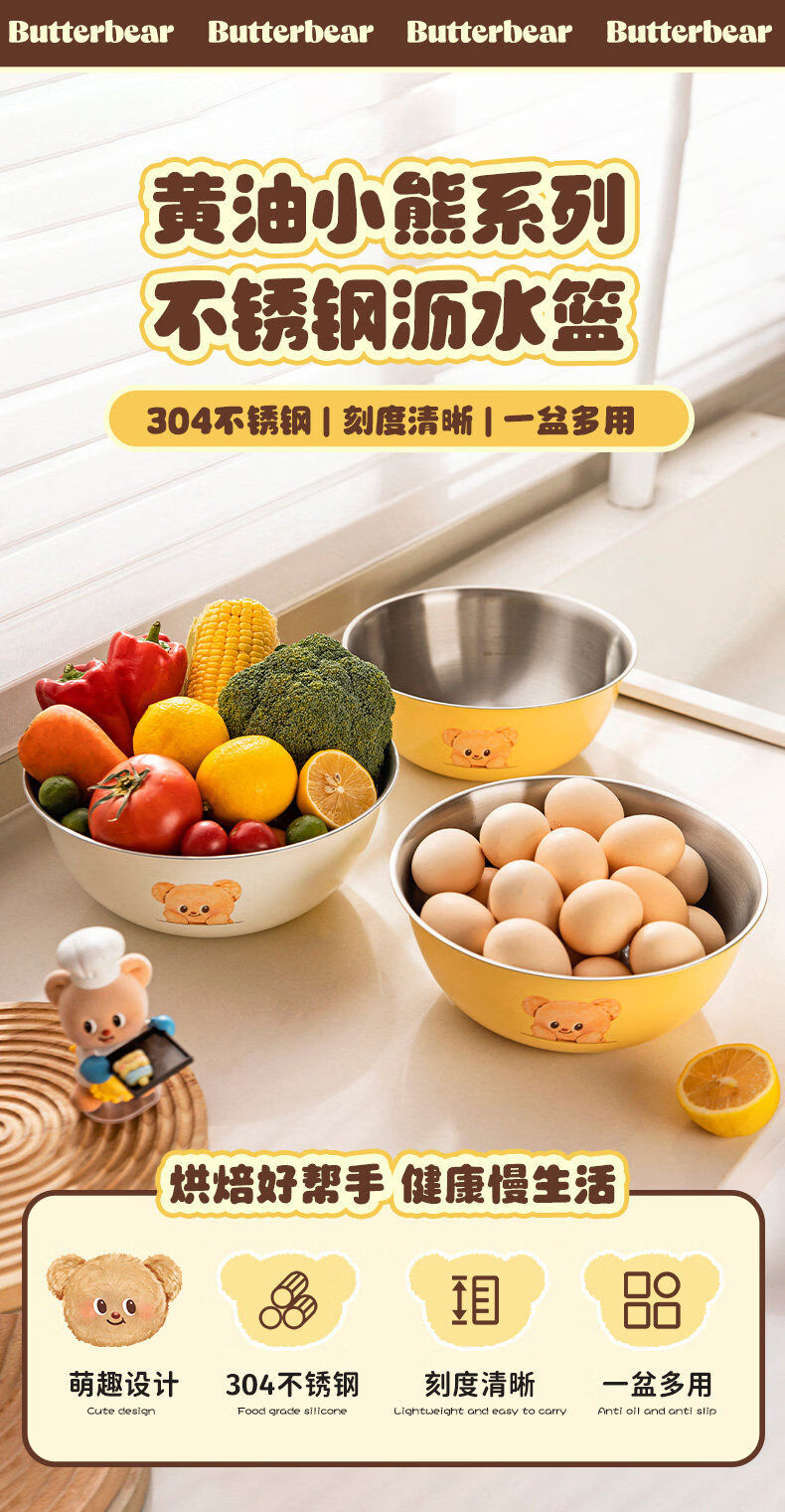 Modern housewife Cream Bear stainless steel sink drain basket water filter fruit basin new kneading basin 304 steel baking basin 22cm-Cream Bear Yellow